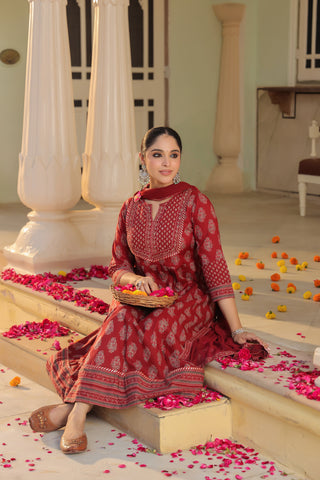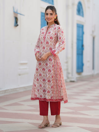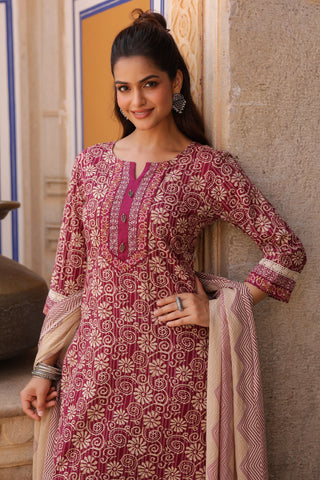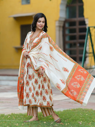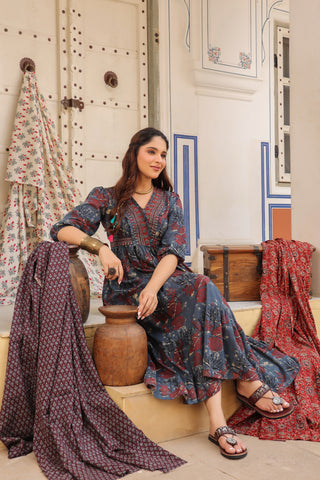 Women Floral Printed Cotton Anarkali Kurta with Trousers & Dupatta