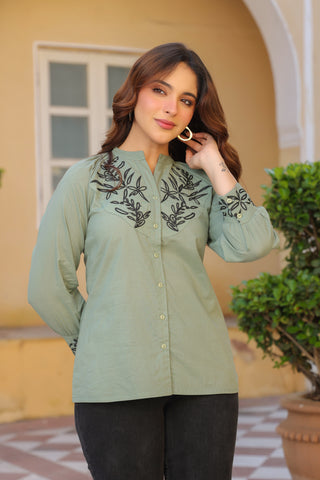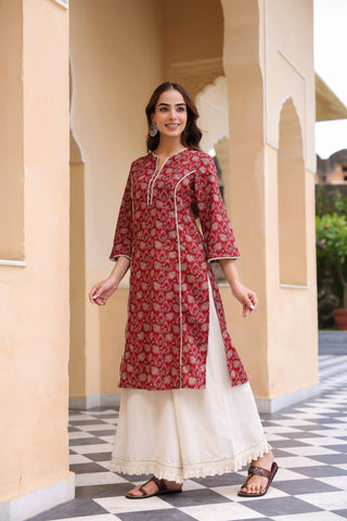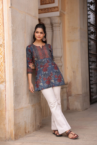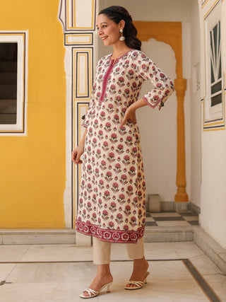 Floral Printed Notch Neck Thread Work Pure Cotton Kurta