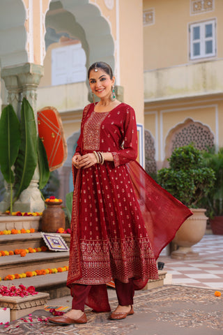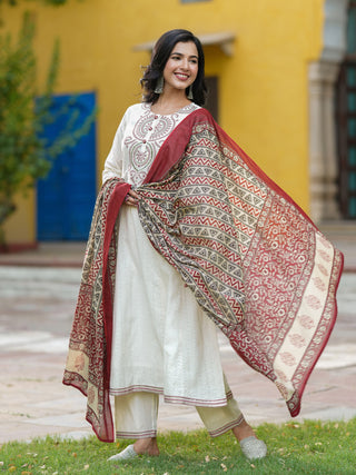 Geometric Embroidered Anarkali Pure Cotton Kurta With Trousers & Dupatta