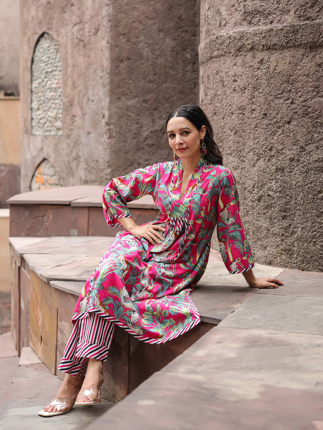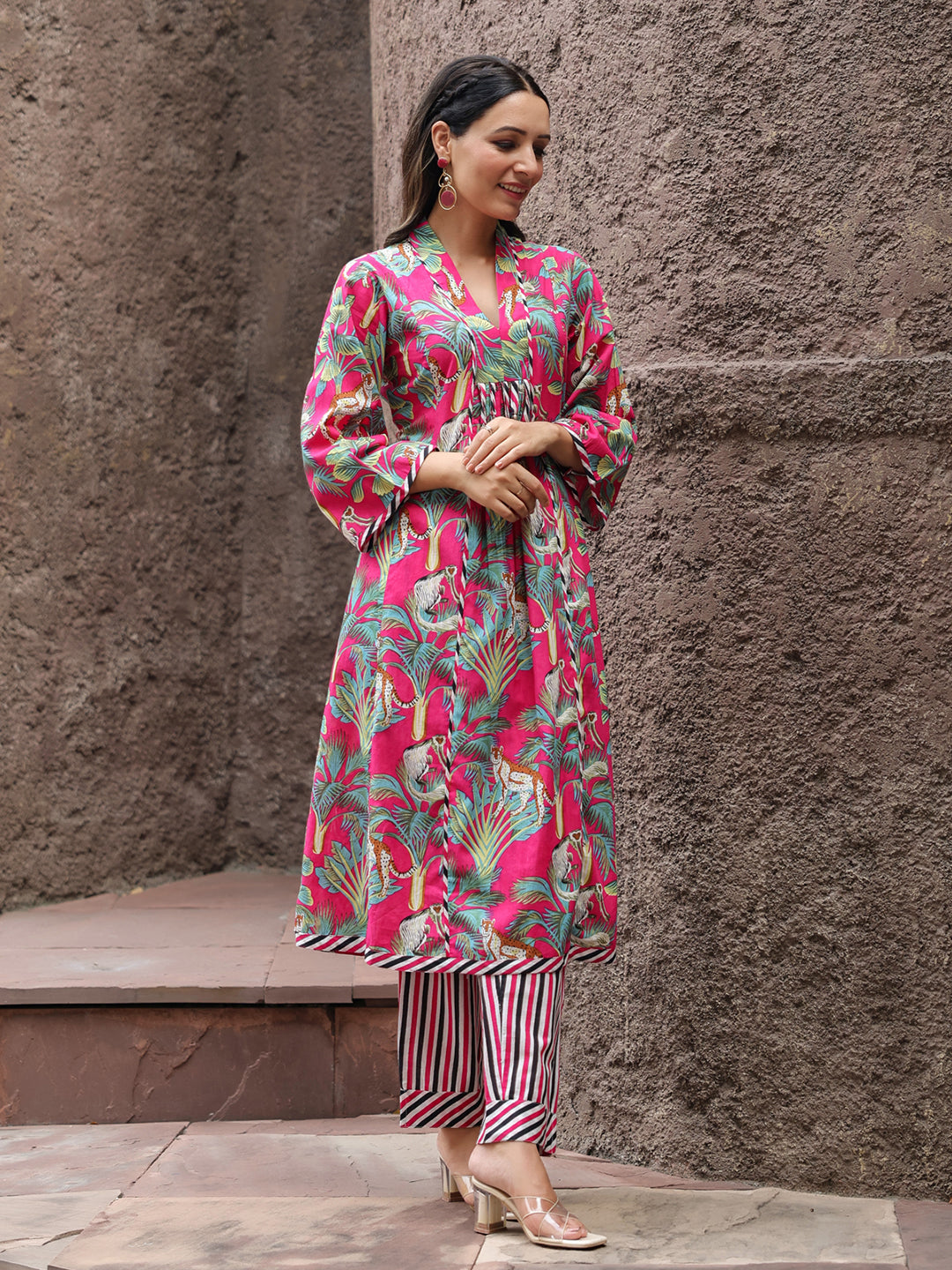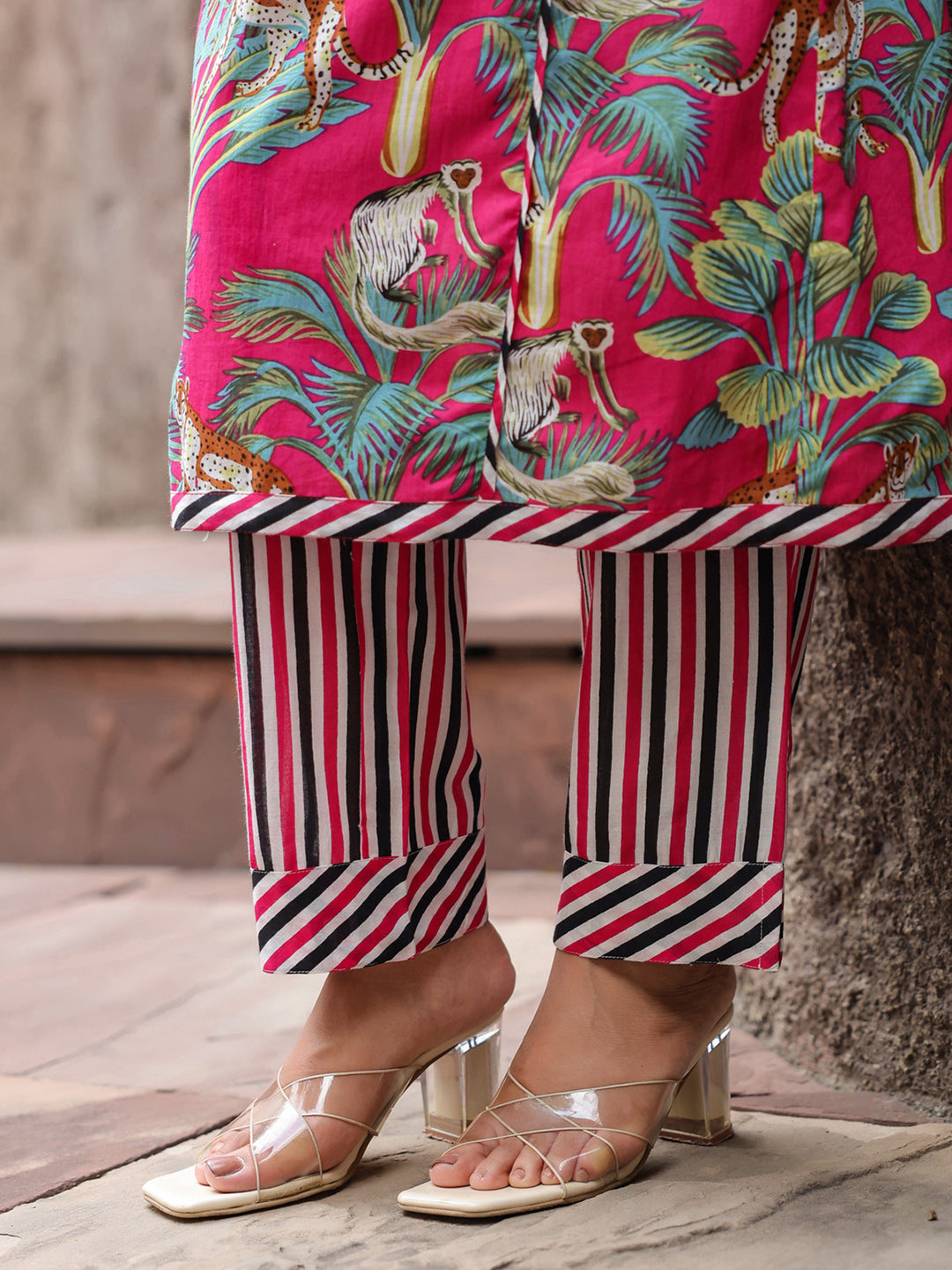 +Pink Printed Kurta Set featuring a playful monkey print A-line kurta with a V-neck, coin and ghungroo detailing, three-quarter sleeves, and side pockets. Paired with pink and black striped mid-rise slip-on trousers for a quirky, comfortable look.