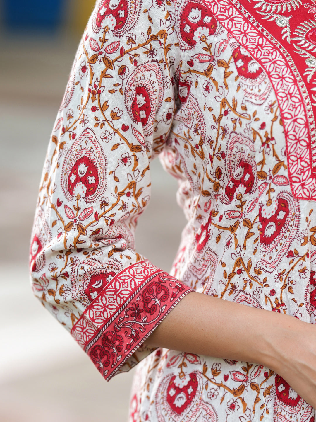 +This is a red and white ethnic motifs printed anarkali kurta set with printed cotton trousers and kota doriya dupatta, V-neck kurta with embroidered yoke, three quarter sleeves, anarkali kurta with gota detail, red and white printed cotton trouser with slip on closure, kota doriya dupatta with lace edging.