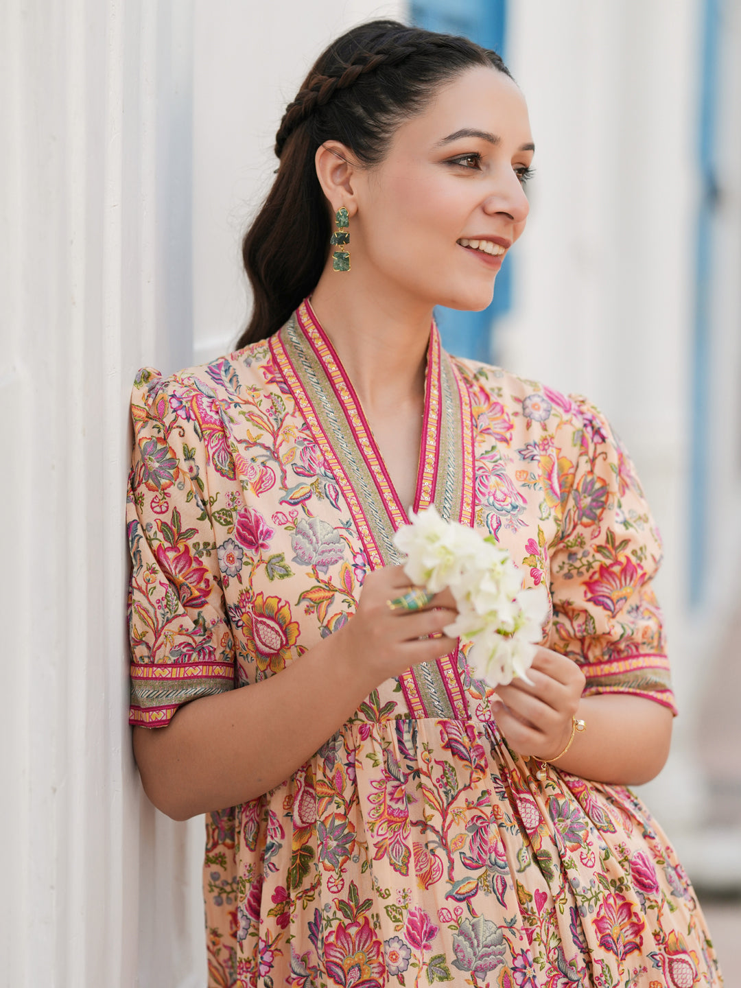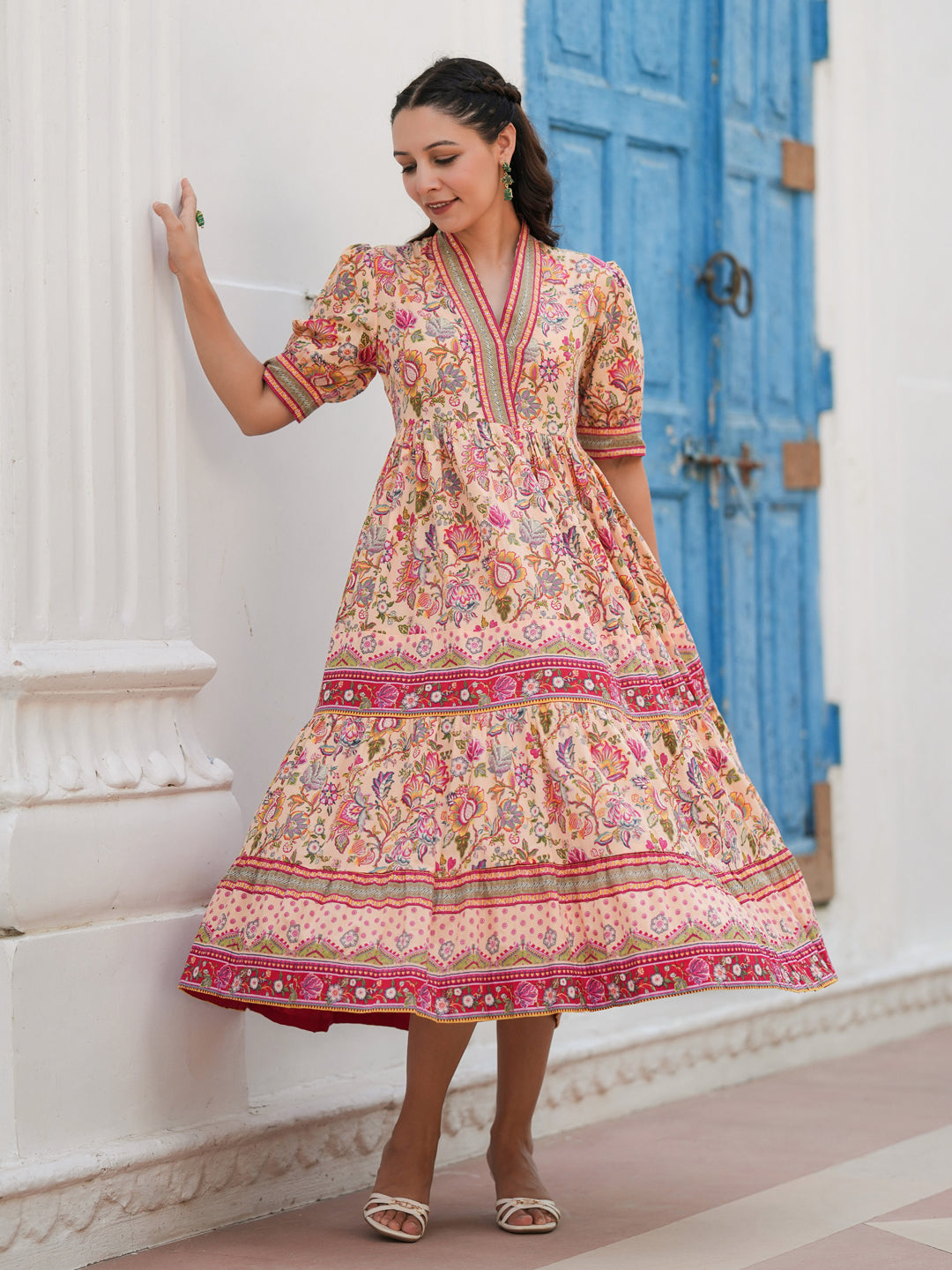 +This beige floral printed ethnic dress is a graceful and versatile piece perfect for both casual and festive occasions. It features a flattering V-neckline with eye-hook closure, three-quarter puff sleeves for a touch of elegance, and a tiered midi-length silhouette that offers a flowy and feminine look.