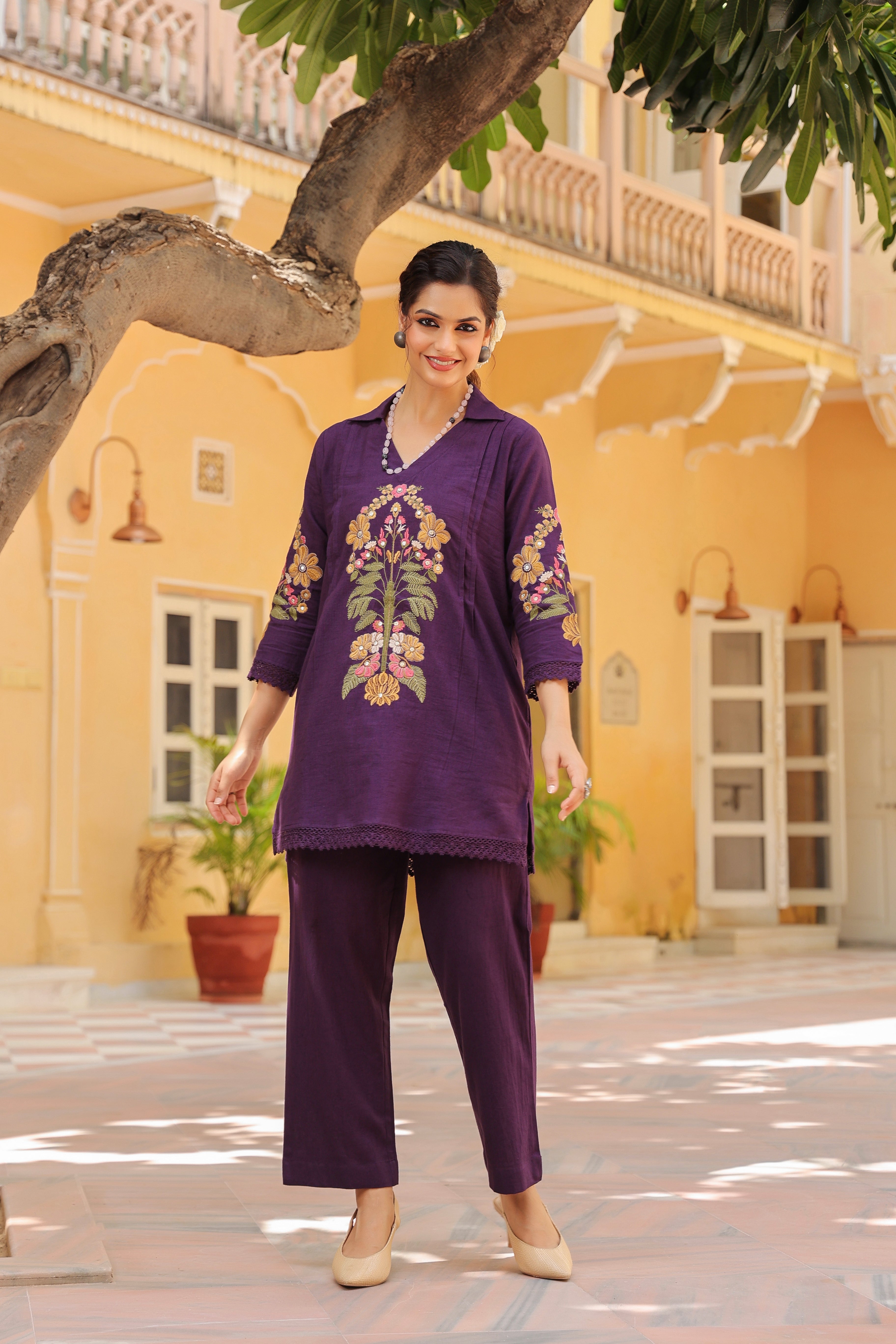 +Step out in style with this elegant wine cord set featuring a collared V-neck embroidered tunic and matching trousers. The tunic showcases lace and pin-tuck details with three-quarter embroidered sleeves for a refined look. Paired with solid mid-rise trousers featuring a slip-on closure and two pockets, this set blends comfort with effortless charm.