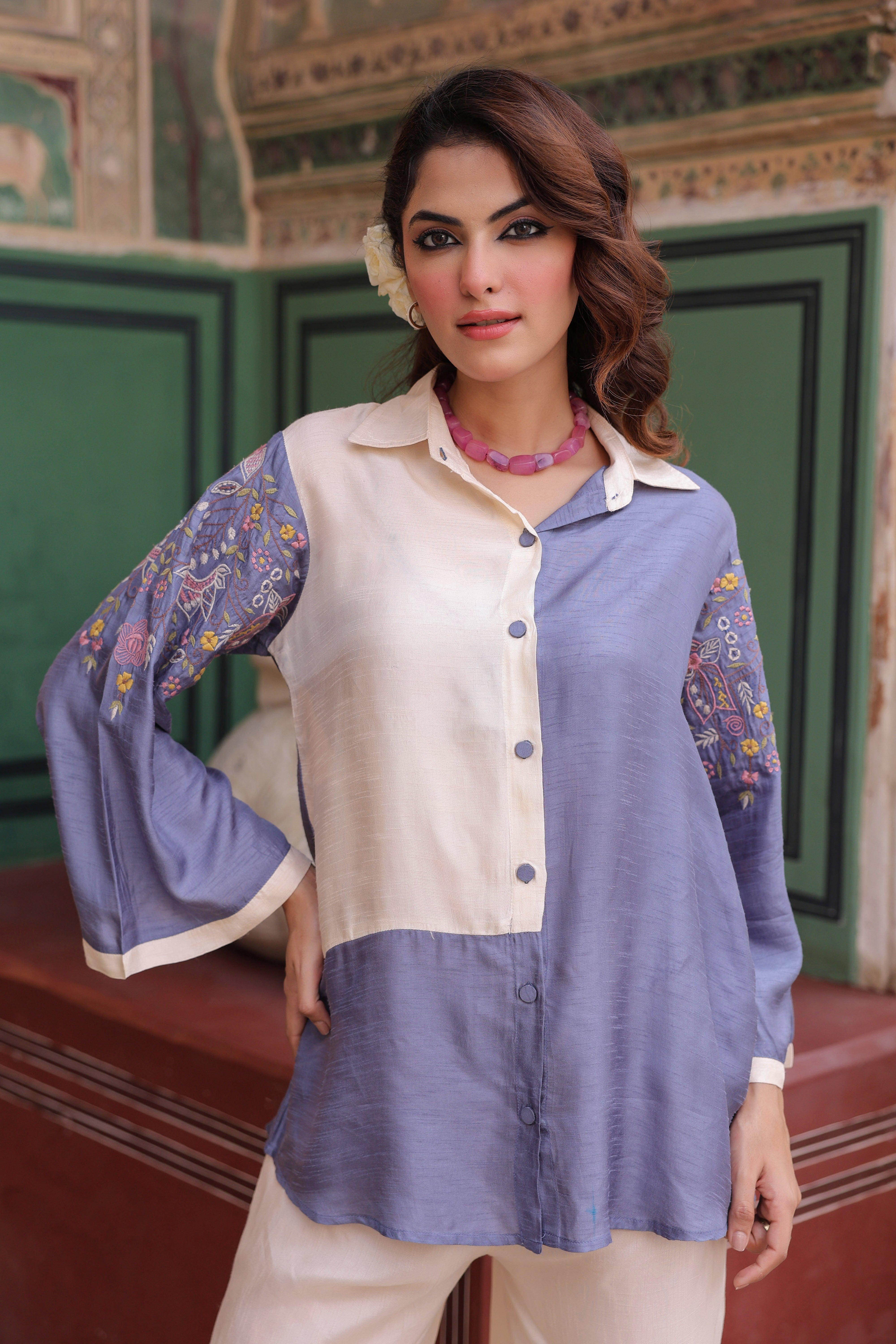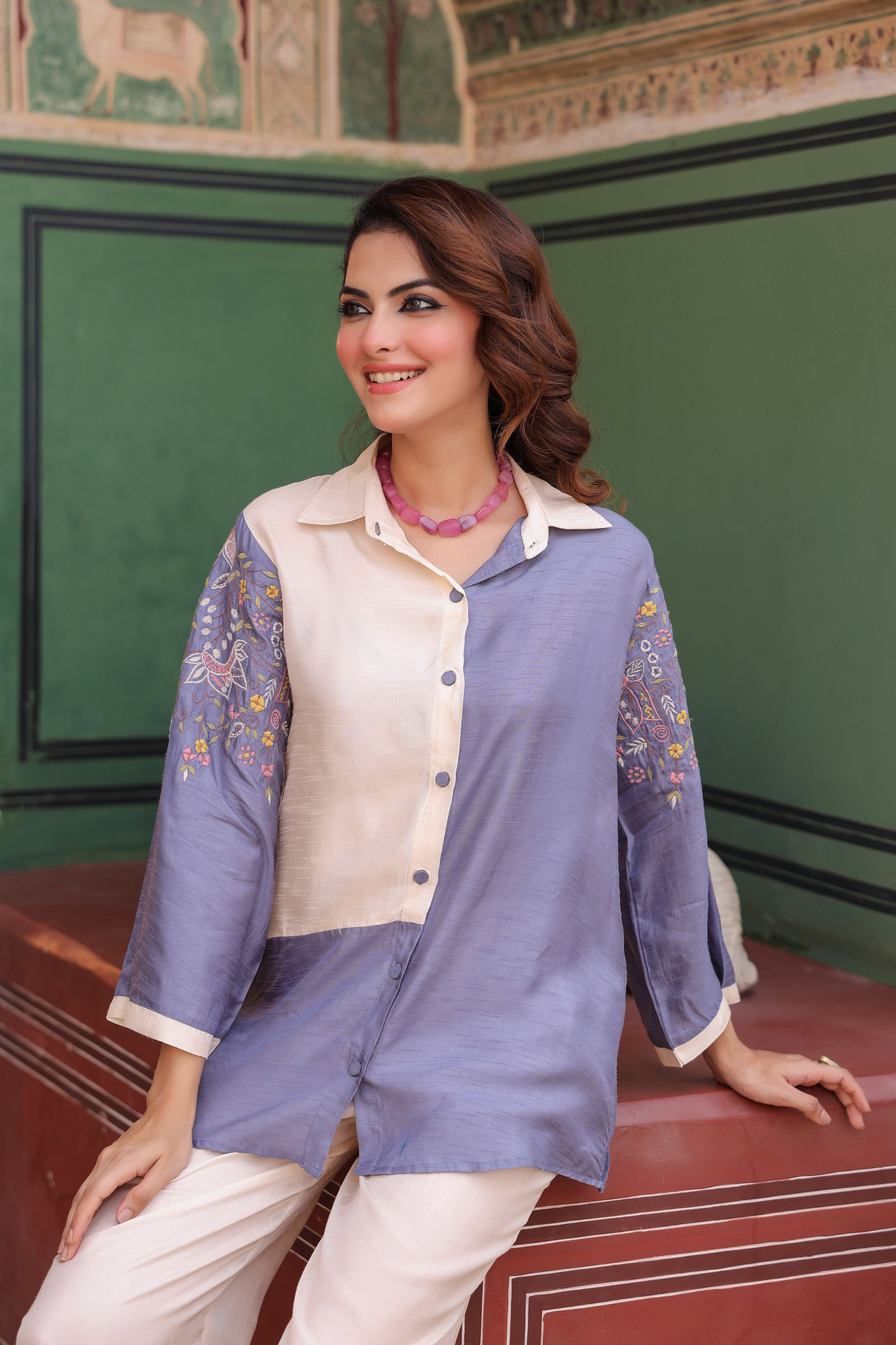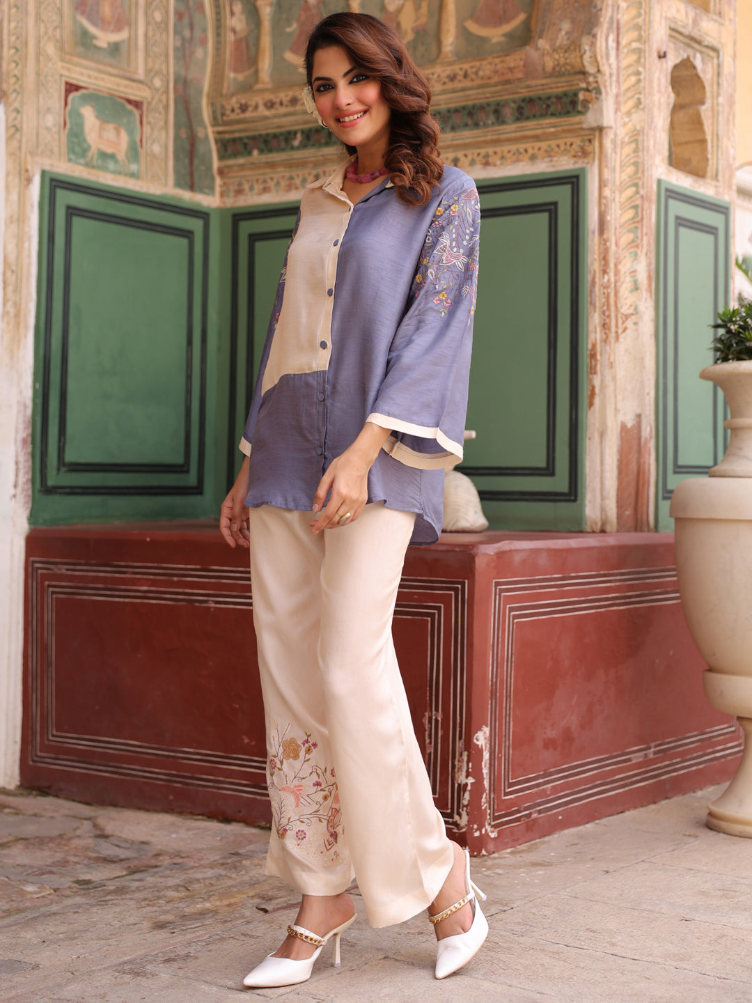 +This elegant purple and white solid embroidered co-ord set features a collared shirt with a button-down closure and three-quarter sleeves highlighted with intricate embroidery. It is paired with solid off-white mid-rise trousers designed with a comfortable slip-on closure and matching embroidery details on the pants, creating a refined and coordinated look.