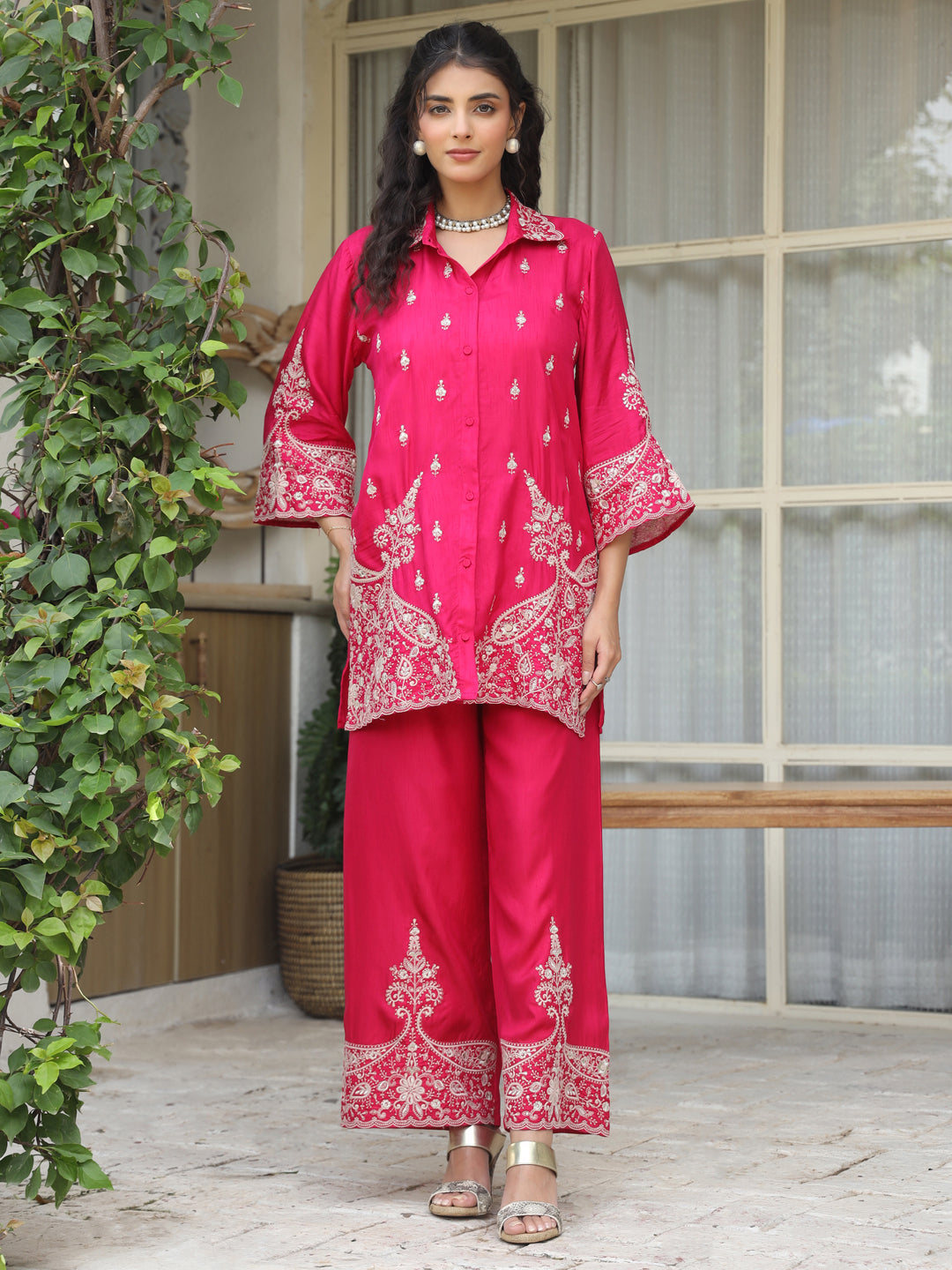 +Brighten your look with this fuschia cord set featuring a shirt-style top with an embroidered collar and three-quarter flared sleeves adorned with embroidery. Paired with pink solid mid-rise trousers with a slip-on closure and embroidered hemline, this set blends elegance with effortless comfort.