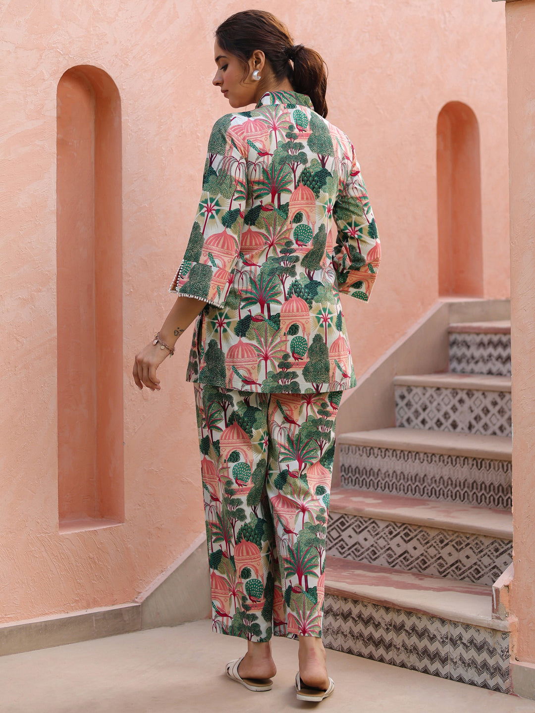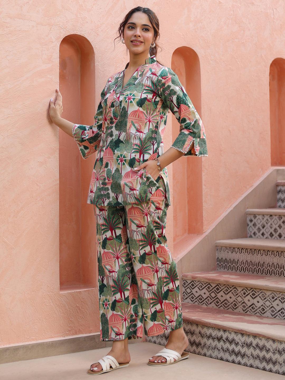 +This green and white tropical printed cotton co-ord set features an elegant A-line tunic paired with matching trousers. The tunic is designed with a flattering V-neckline accented by embroidered button detailing, along with three-quarter sleeves finished with delicate lace accents. Crafted in breathable cotton, the set offers comfort and style. The tropical printed mid-rise trousers include a slip-on closure and functional pockets, making it perfect for effortless everyday wear.