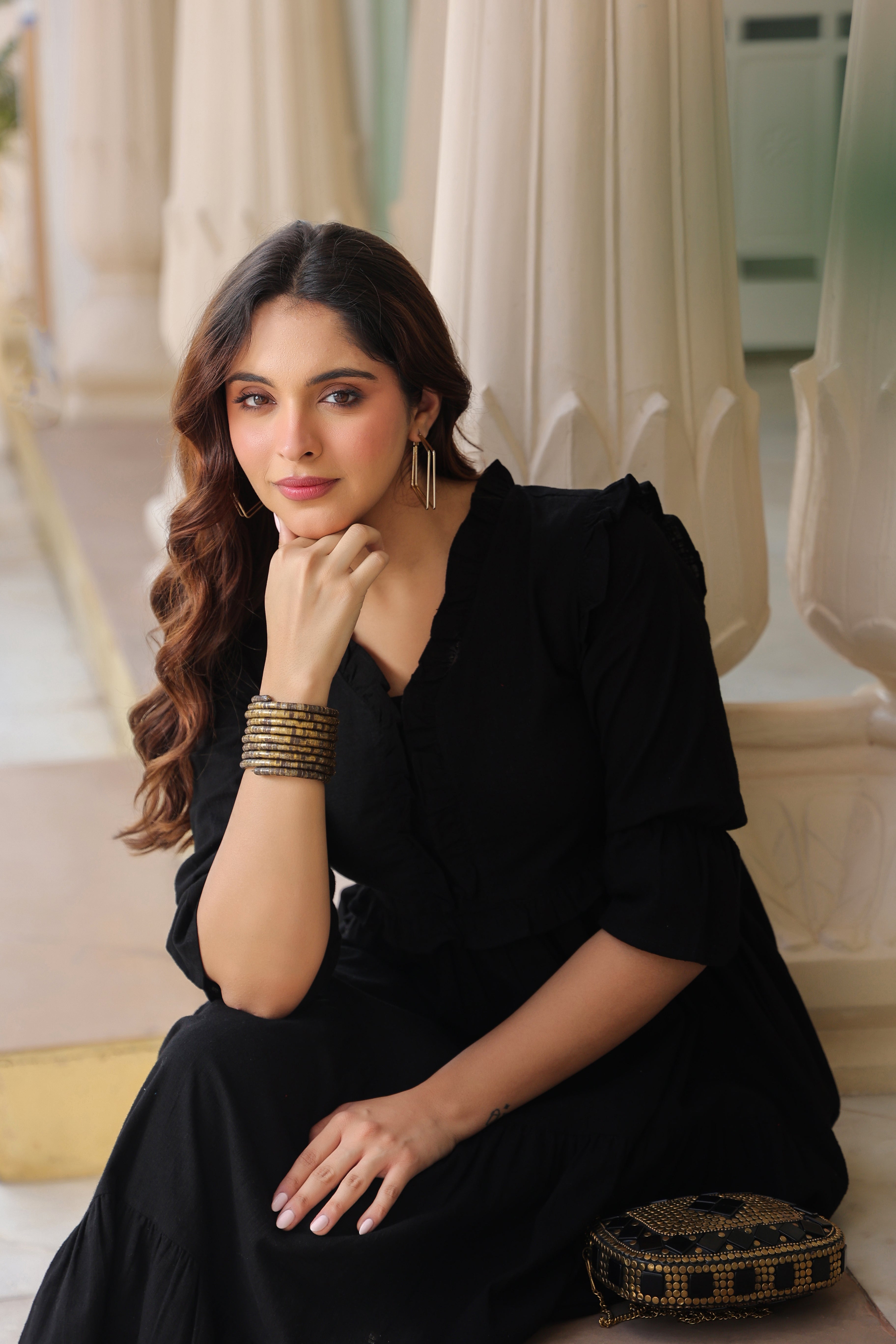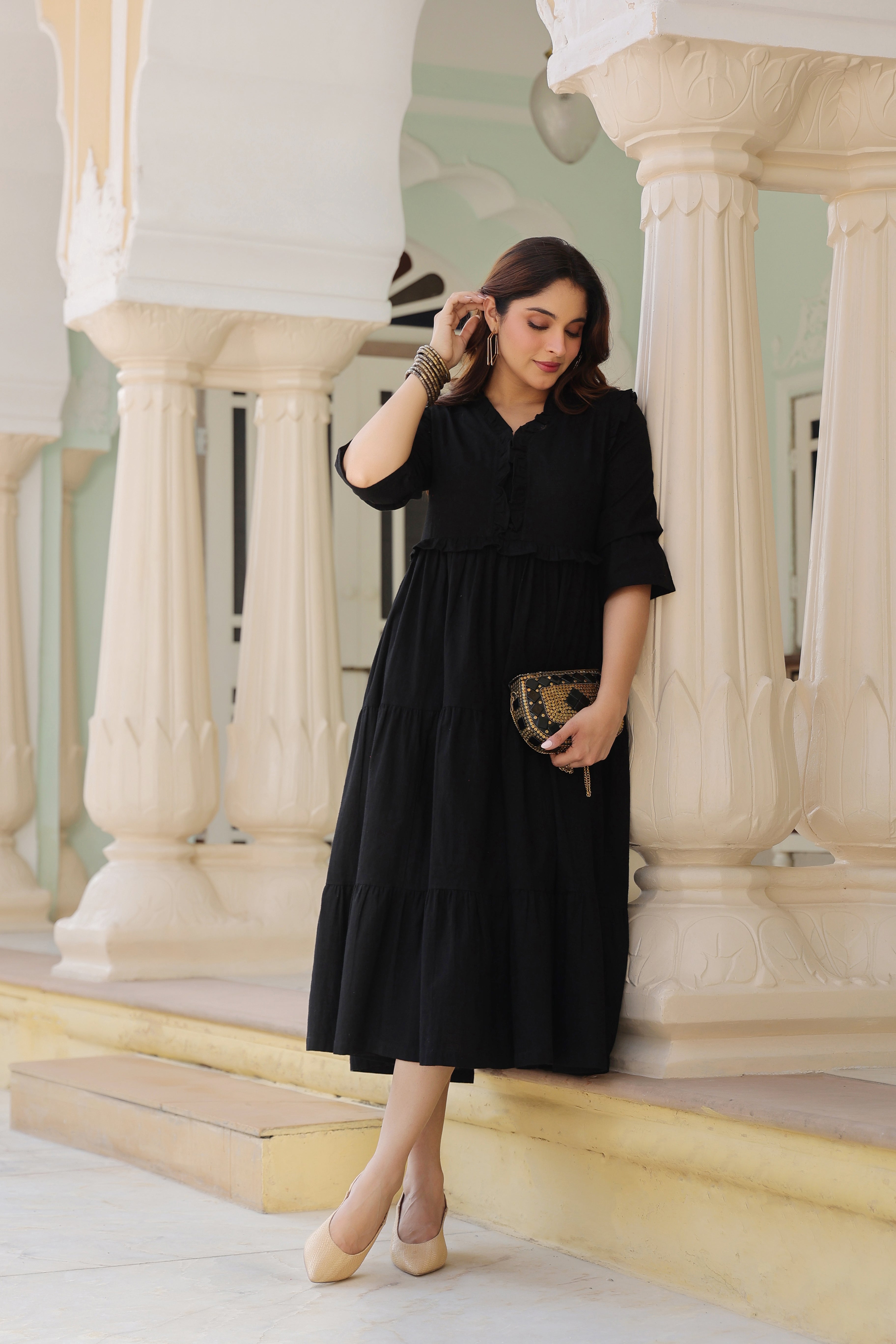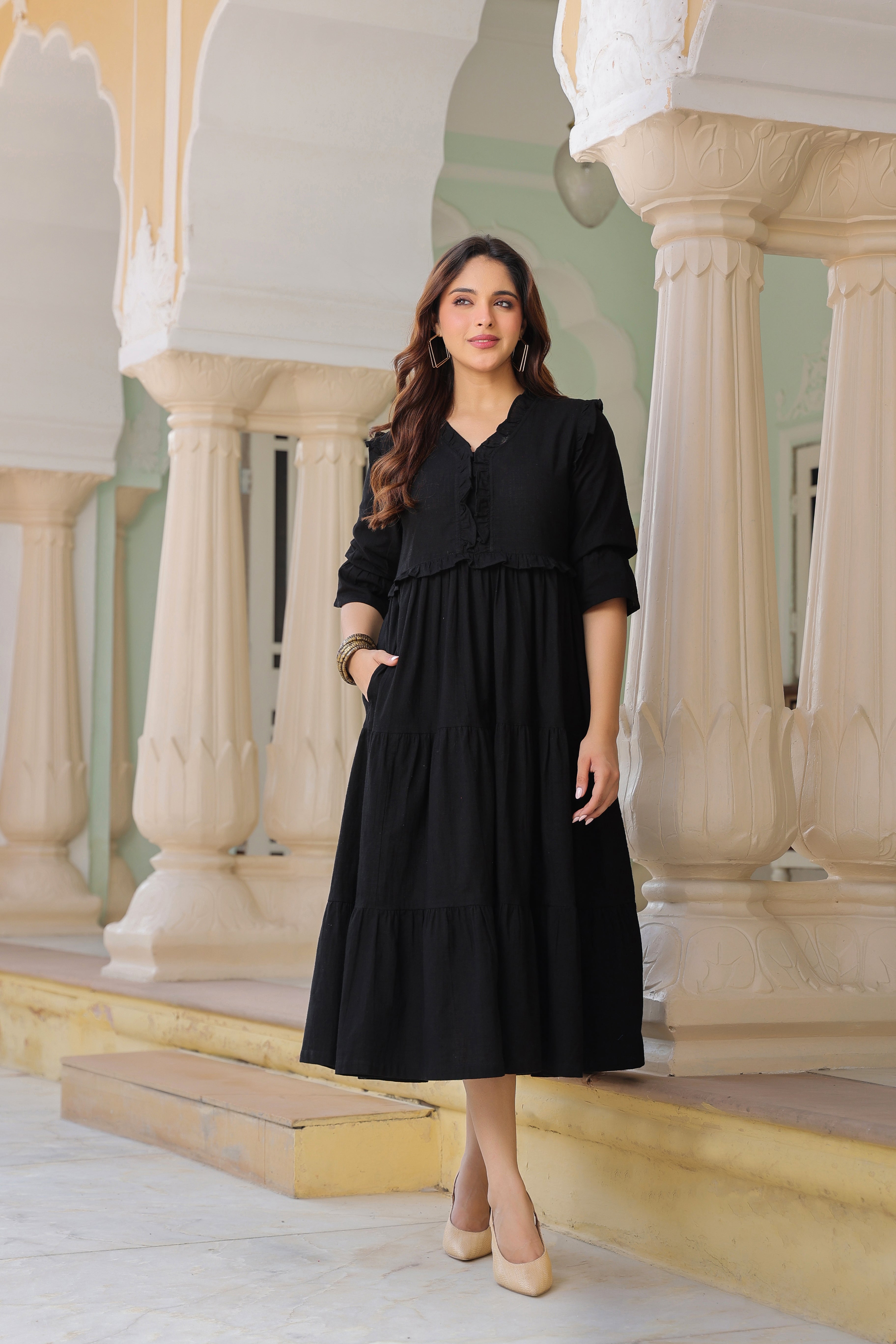 Chic and versatile, this black solid dress features a flattering V-neckline with ruffle detailing, three-quarter sleeves, and a fit-and-flare tiered silhouette. Designed for both style and comfort, it also includes functional pockets.