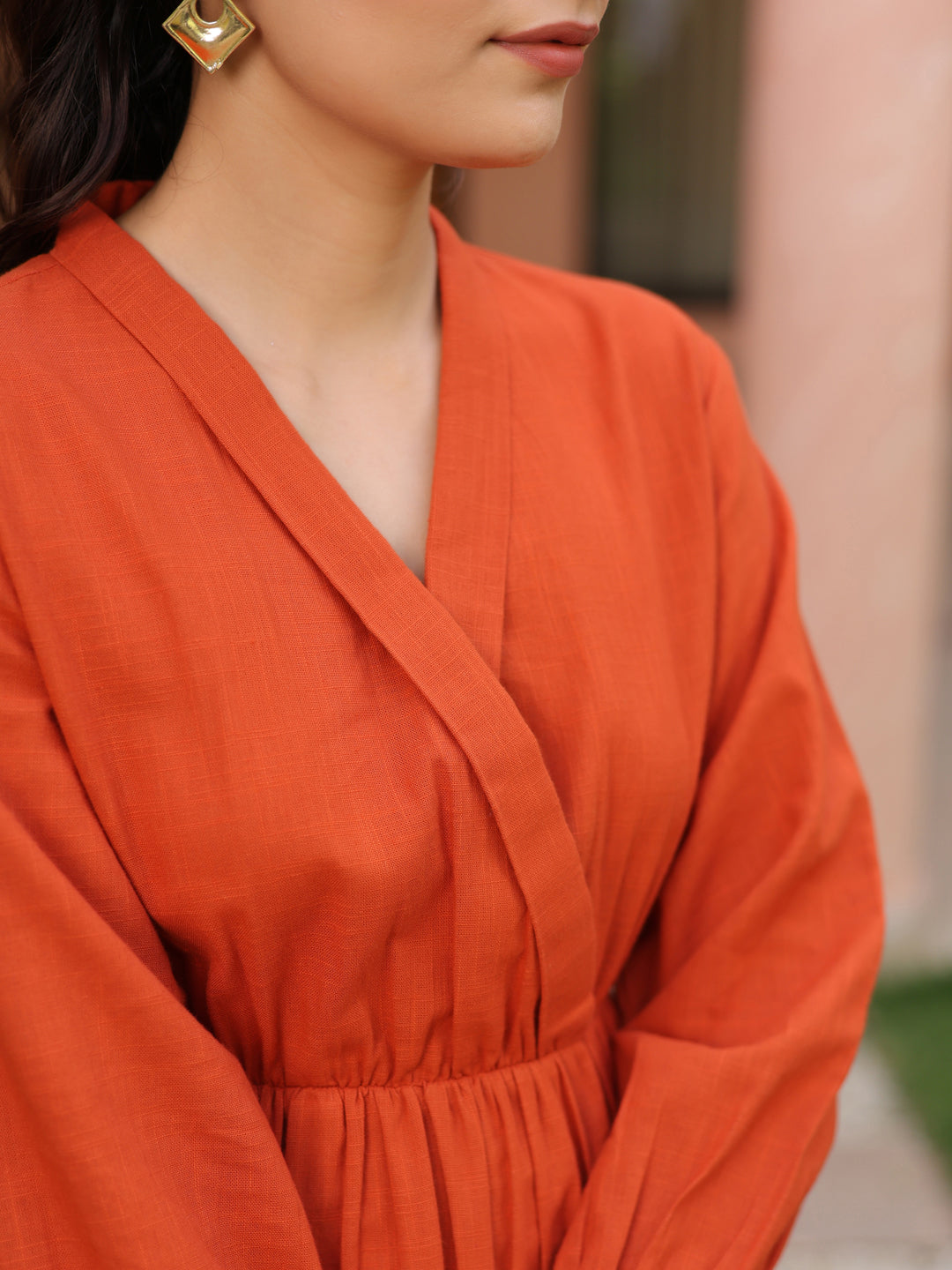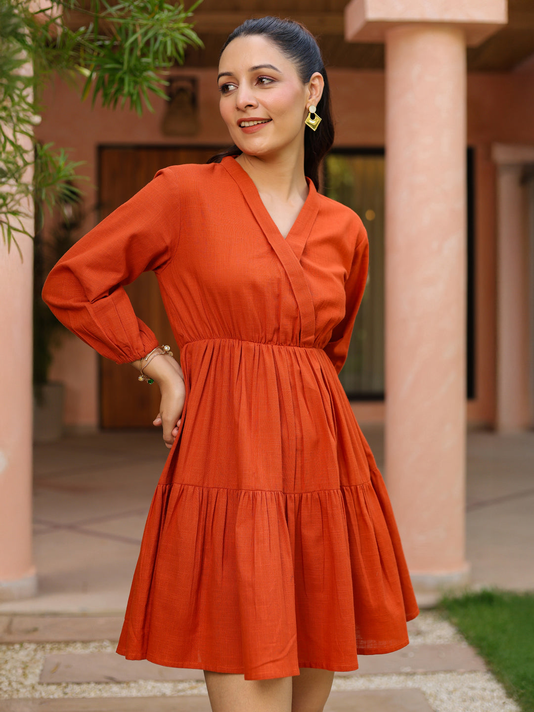 +This solid rust short dress features a flattering V-neckline with an eye-hook closure. Designed with three-quarter puff sleeves, it offers a stylish silhouette. The fit-and-flare design with tiered detailing adds volume and movement, making it perfect for effortless chic looks.