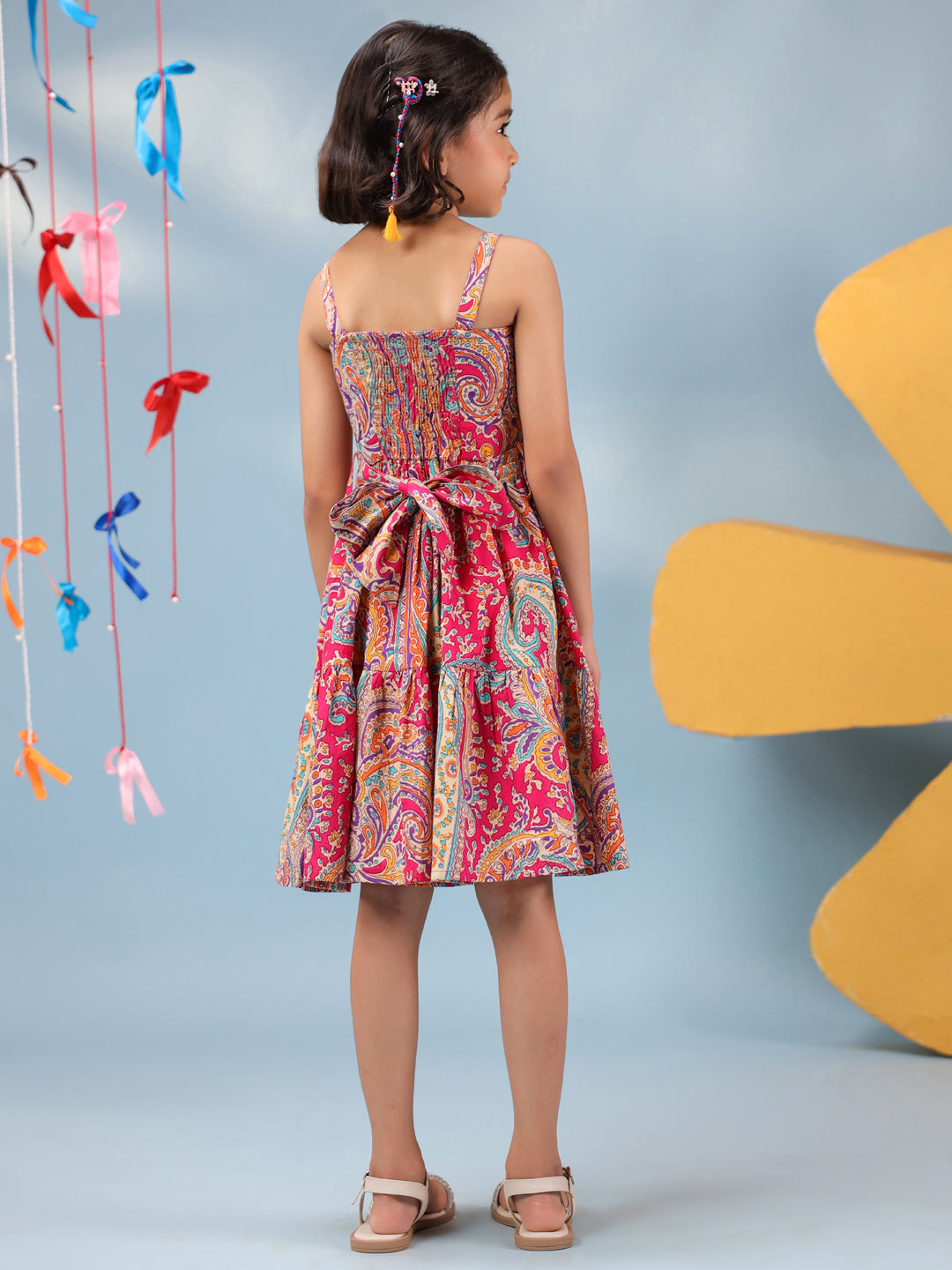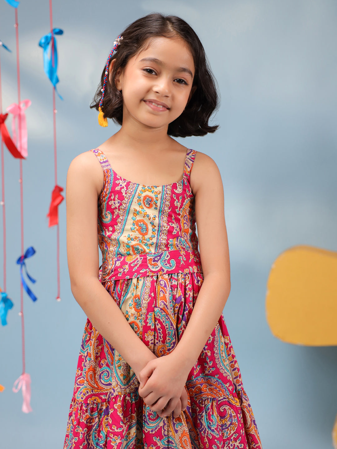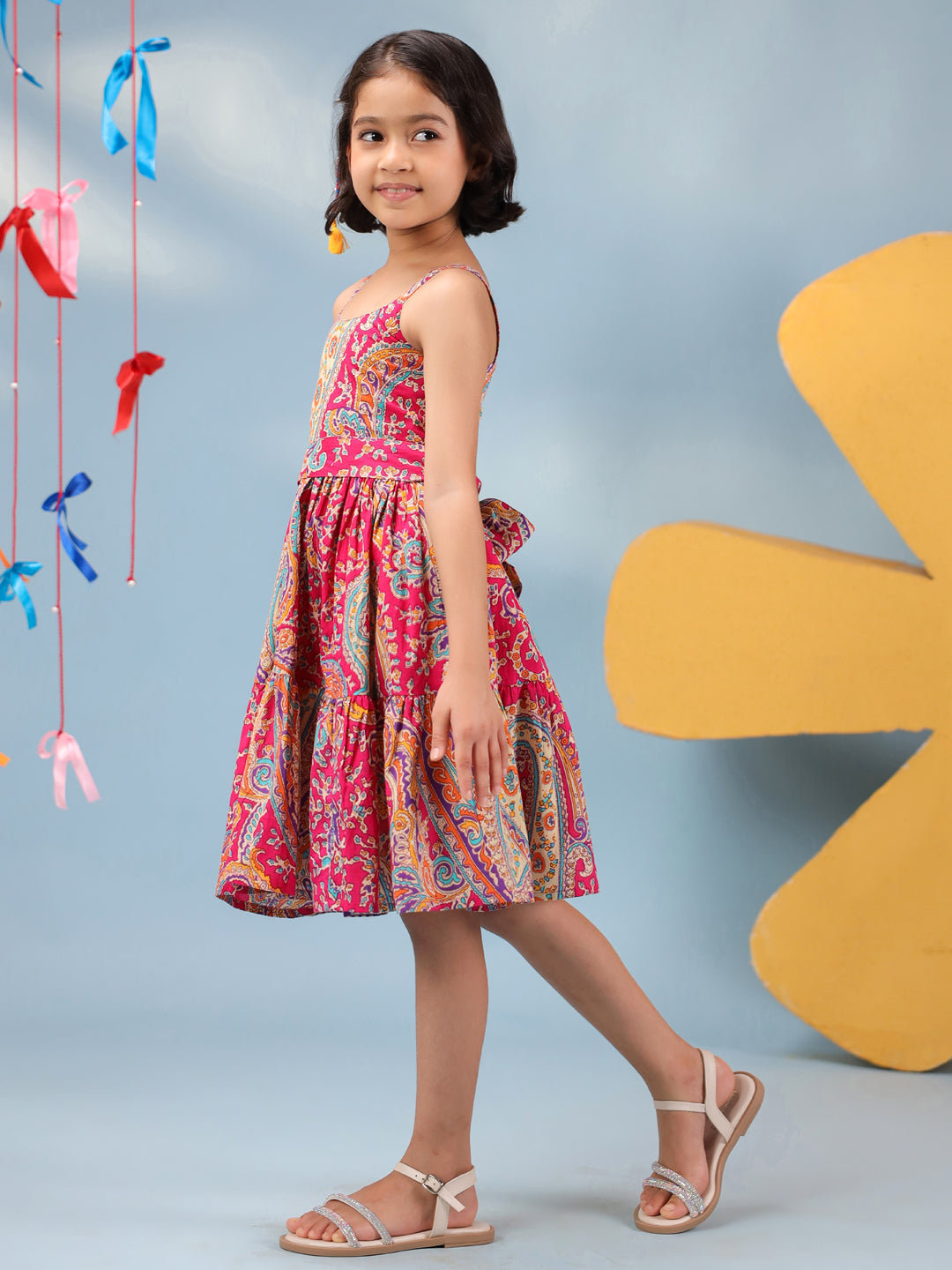 This is a pink ethnic motifs printed dress, sleeveless dress with shoulder straps, fit and flare tiered dress with belt at waist.