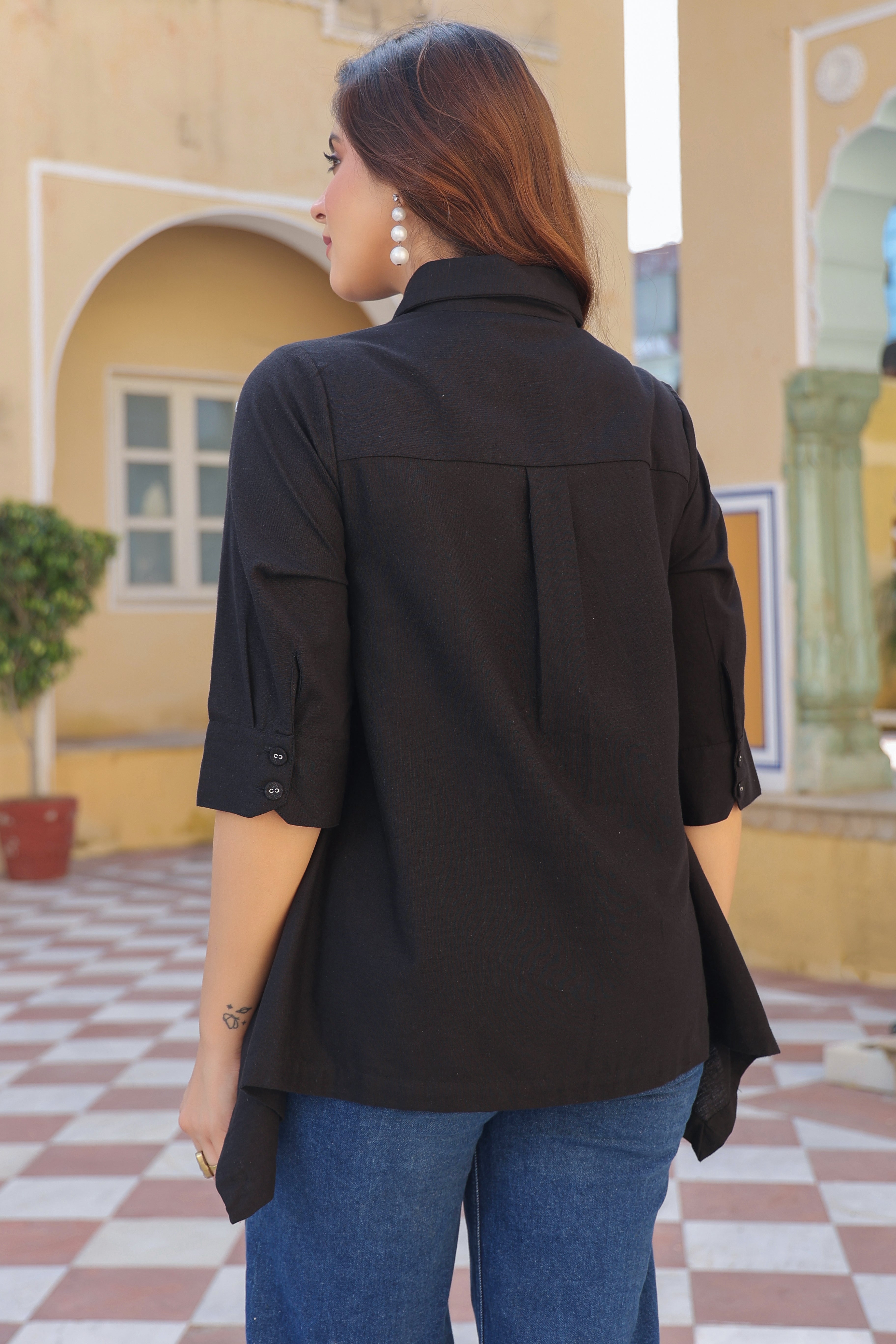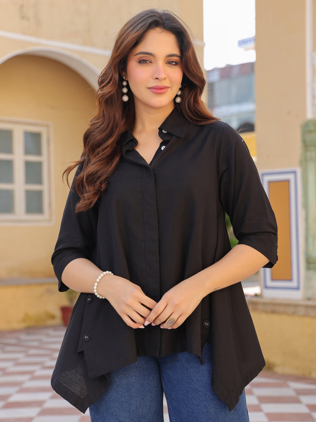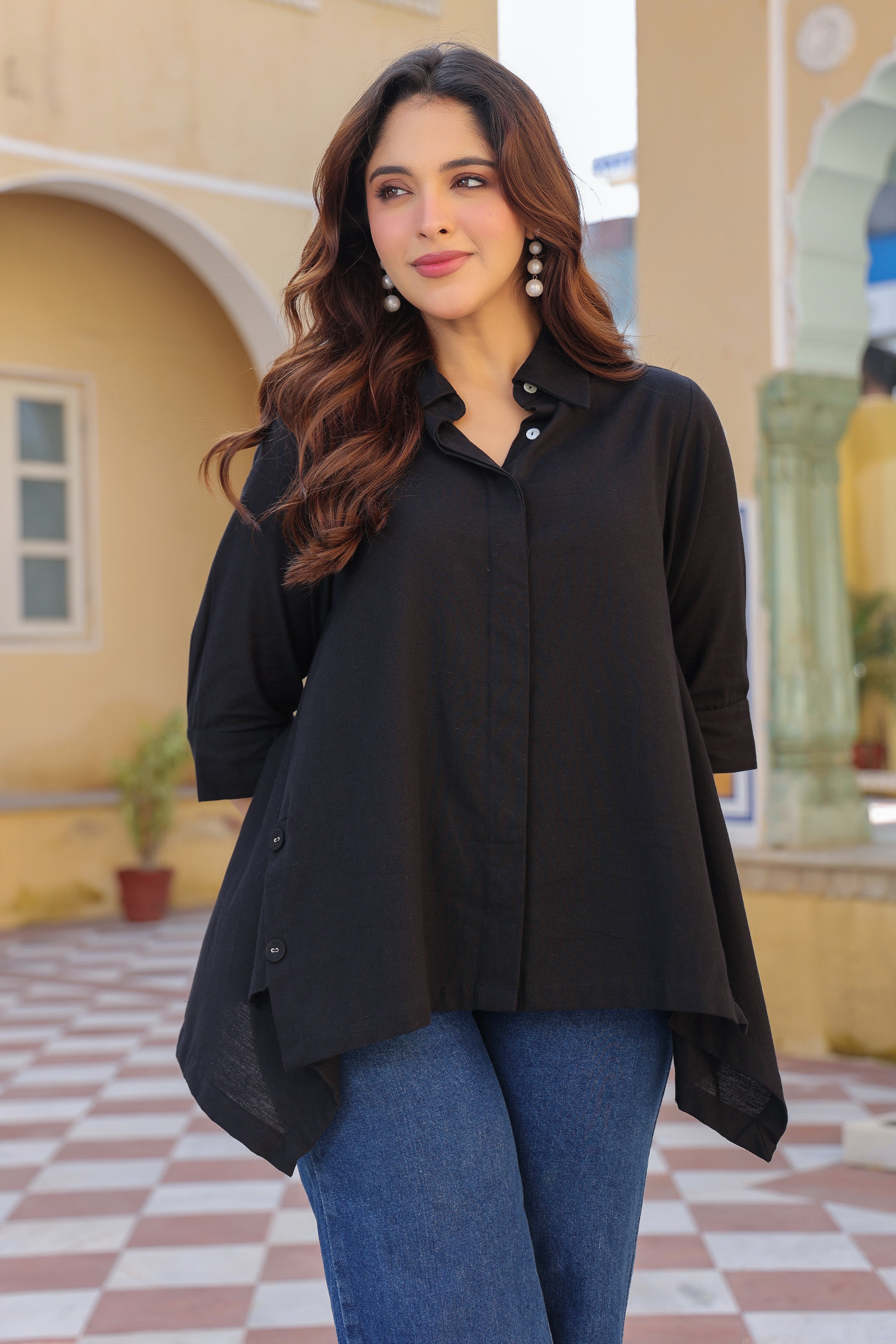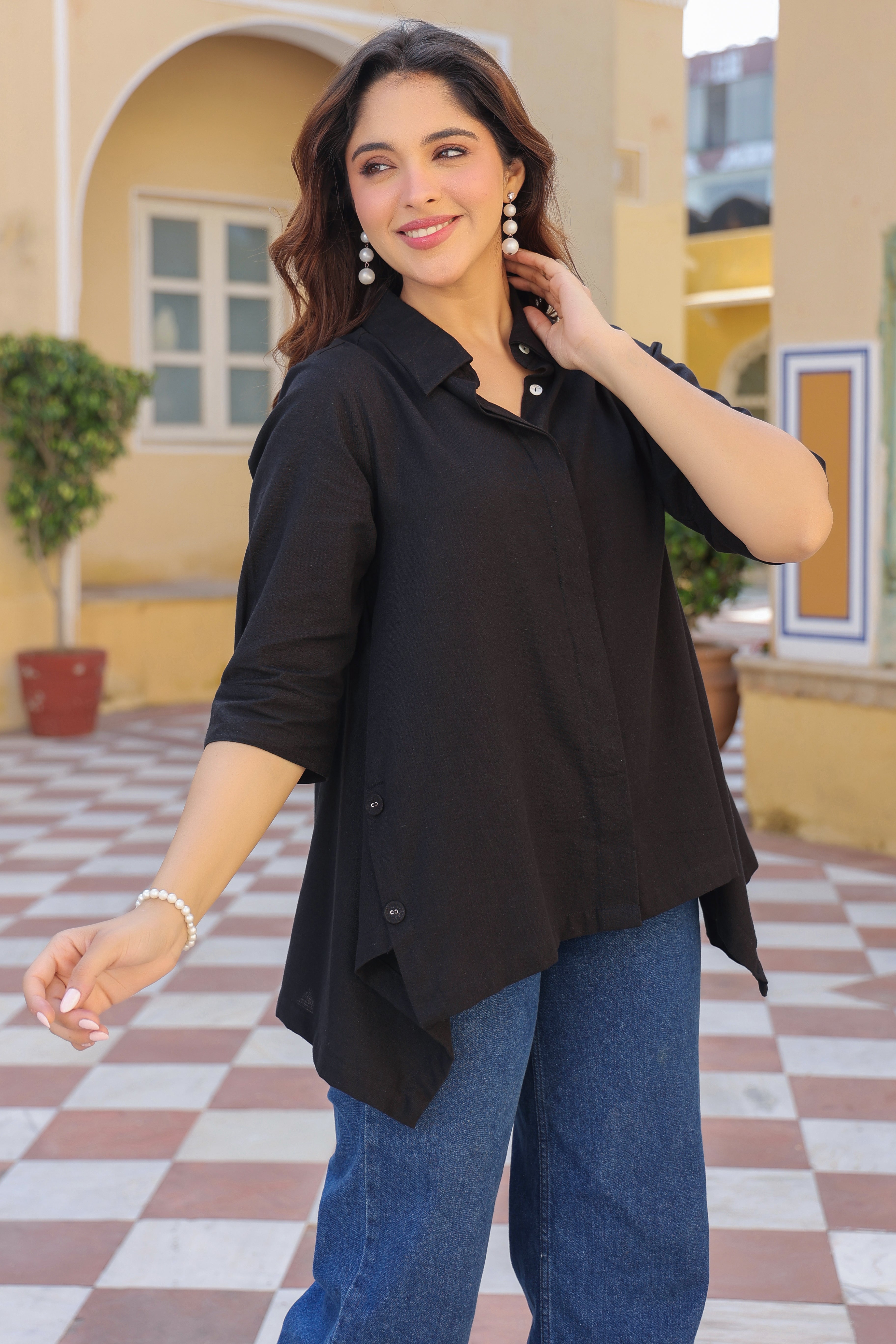 This chic black solid casual shirt features a classic collared neckline with a button-down closure. Designed with an asymmetric hemline and stylish side button details, it adds a modern twist to a timeless look. Finished with three-quarter sleeves, it’s perfect for effortless everyday style.