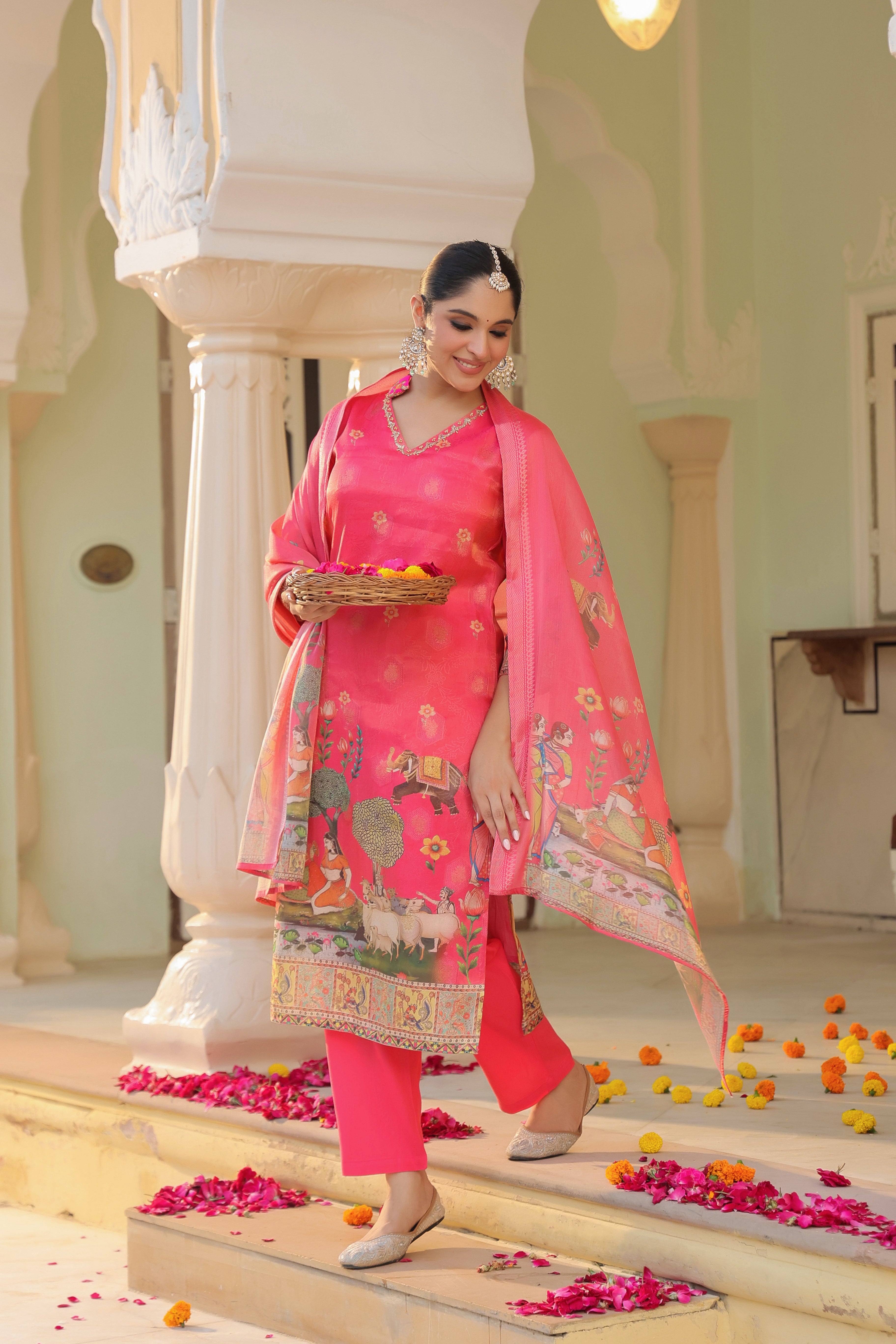 Women Printed Regular Chanderi Cotton Kurta with Trousers & Dupatta