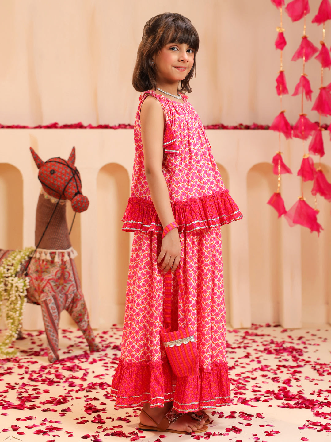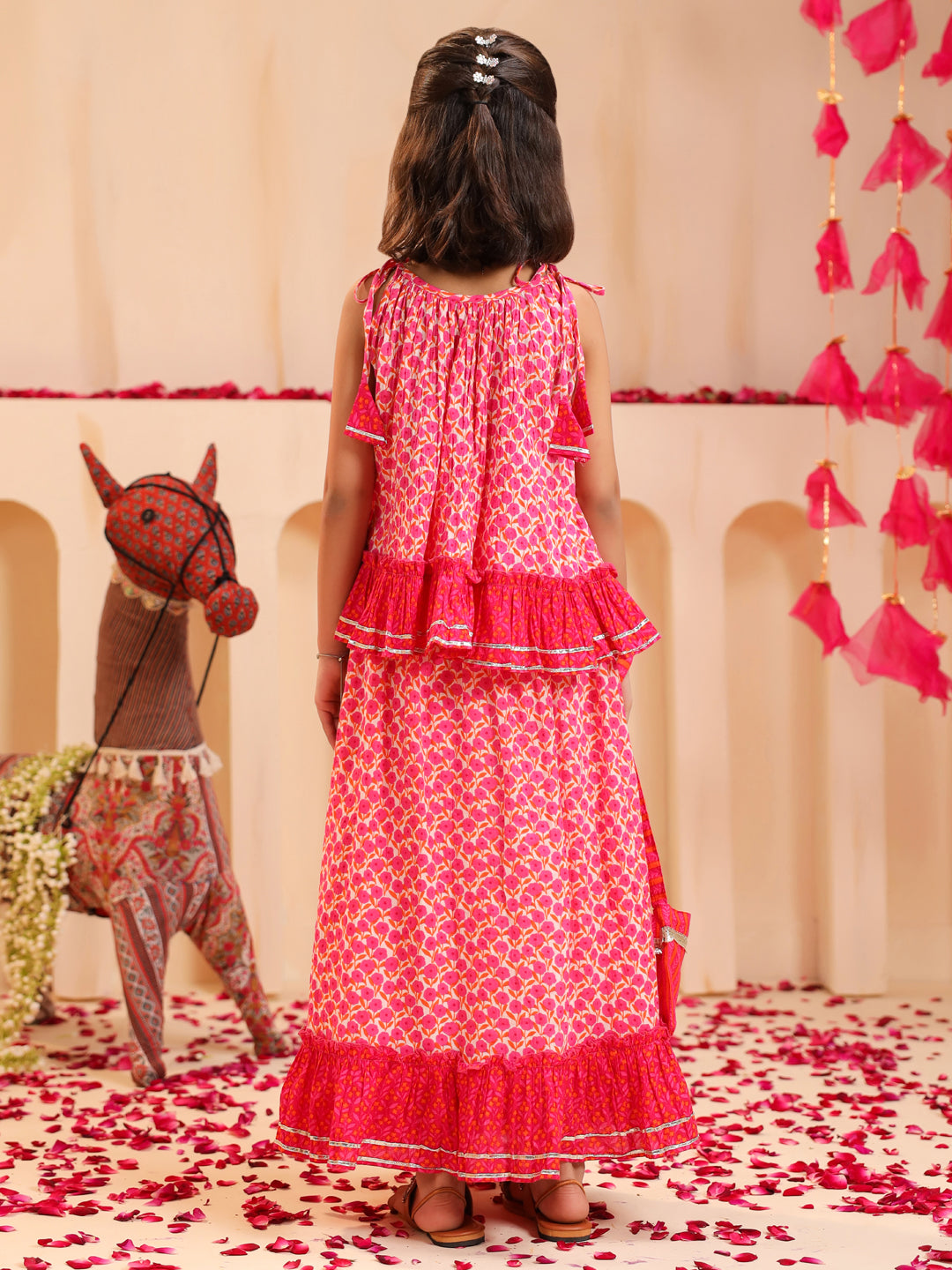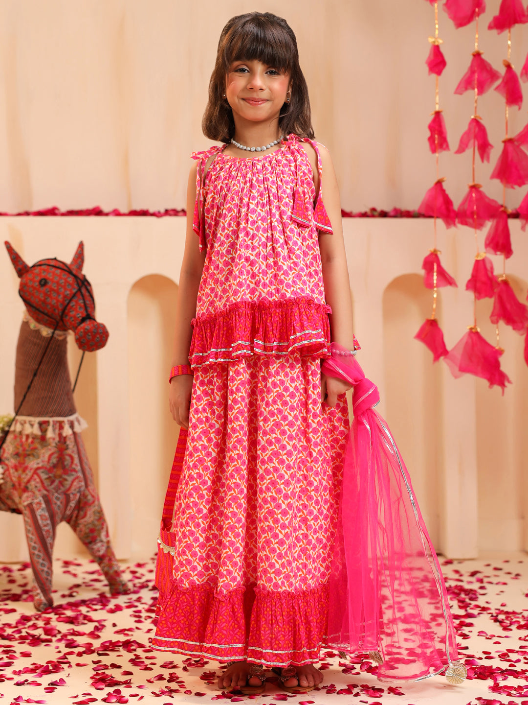 +This pink floral printed lehenga set features a sleeveless round-neck top with tie-up shoulder details and a frilled hem, paired with a mid-rise flared skirt showcasing a matching floral print, elasticated waist, and dori tie-up. The look is completed with a dyed pink net dupatta adorned with gota detailing and a matching potli bag, creating a charming and elegant outfit perfect for festive occasions.