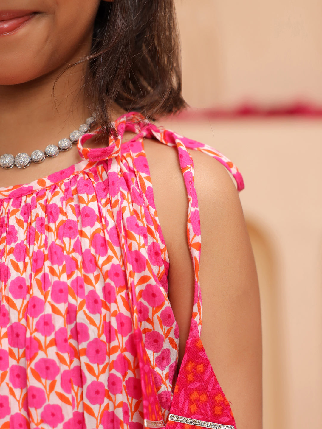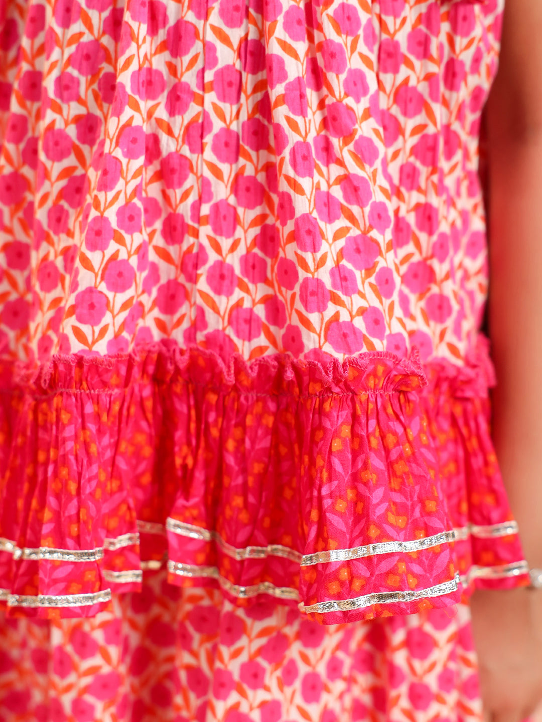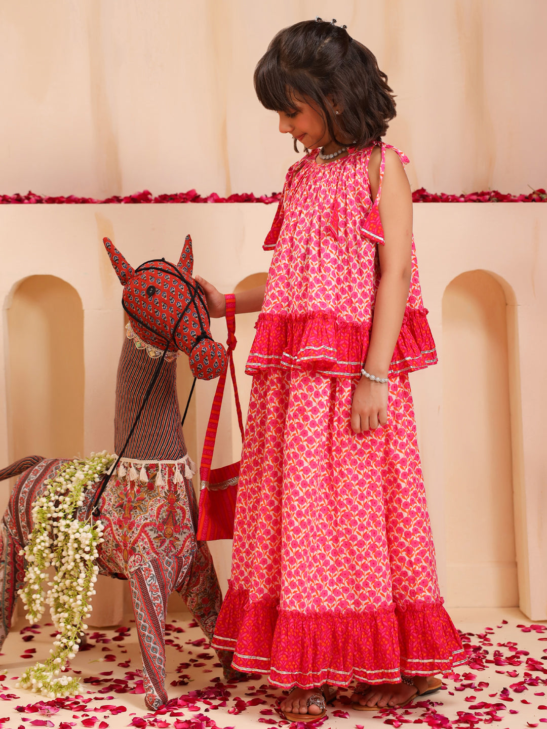 +This pink floral printed lehenga set features a sleeveless round-neck top with tie-up shoulder details and a frilled hem, paired with a mid-rise flared skirt showcasing a matching floral print, elasticated waist, and dori tie-up. The look is completed with a dyed pink net dupatta adorned with gota detailing and a matching potli bag, creating a charming and elegant outfit perfect for festive occasions.