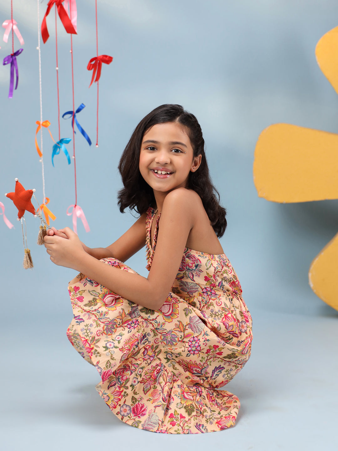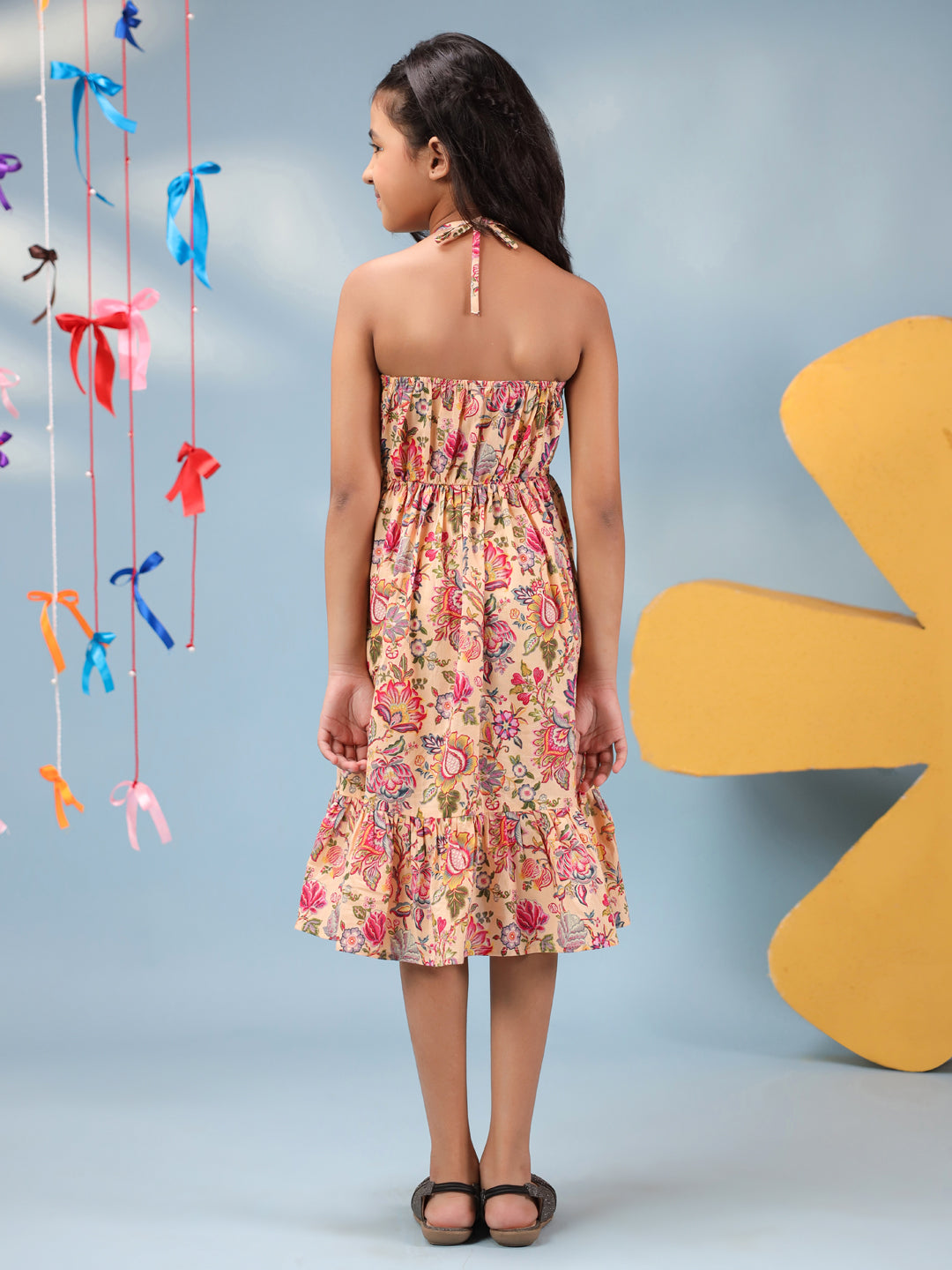 This is a beige floral printed dress, V-neck dress with ruffle detail, sleeveless dress with tie up at neck, fit and flared dress.