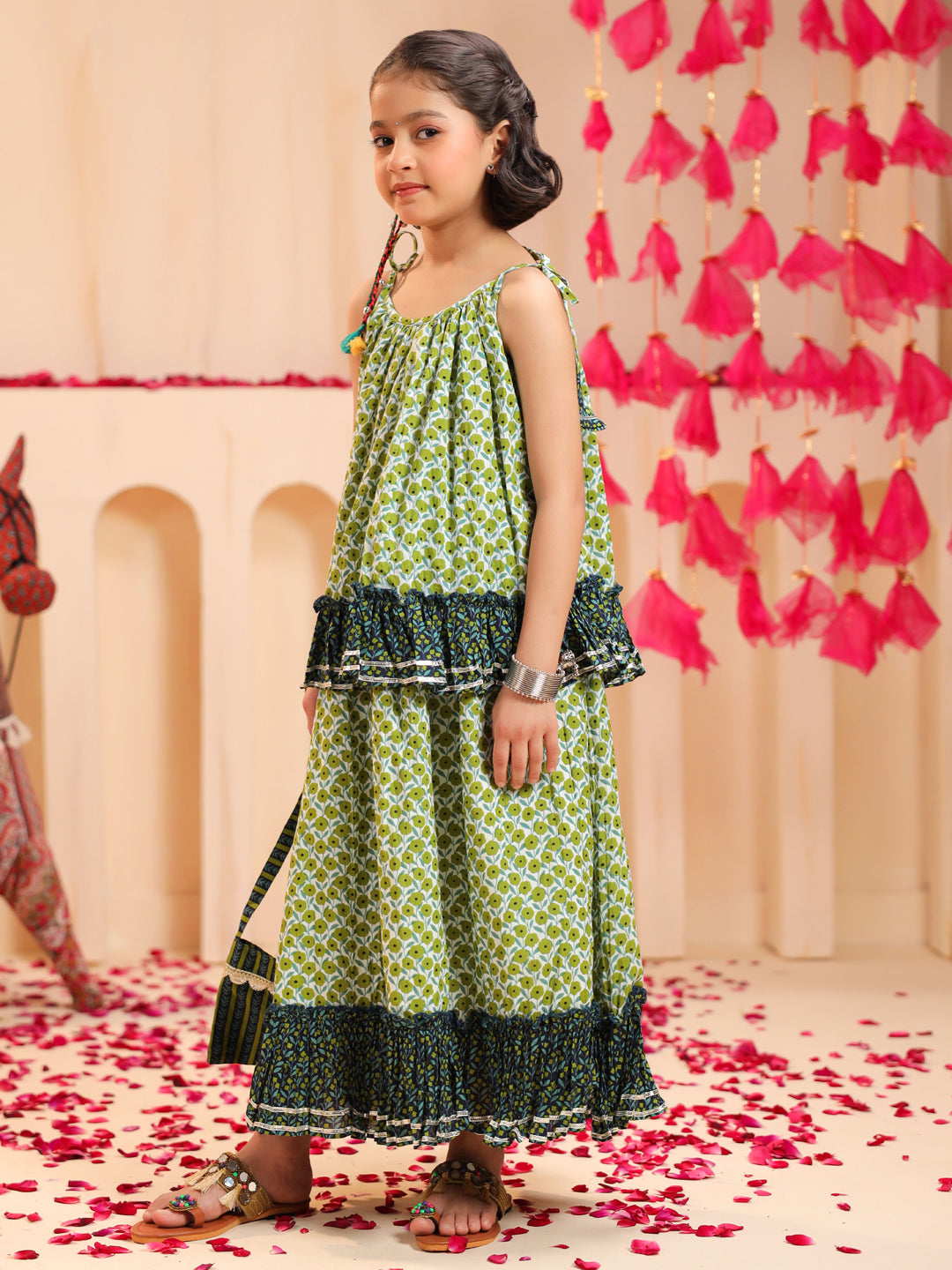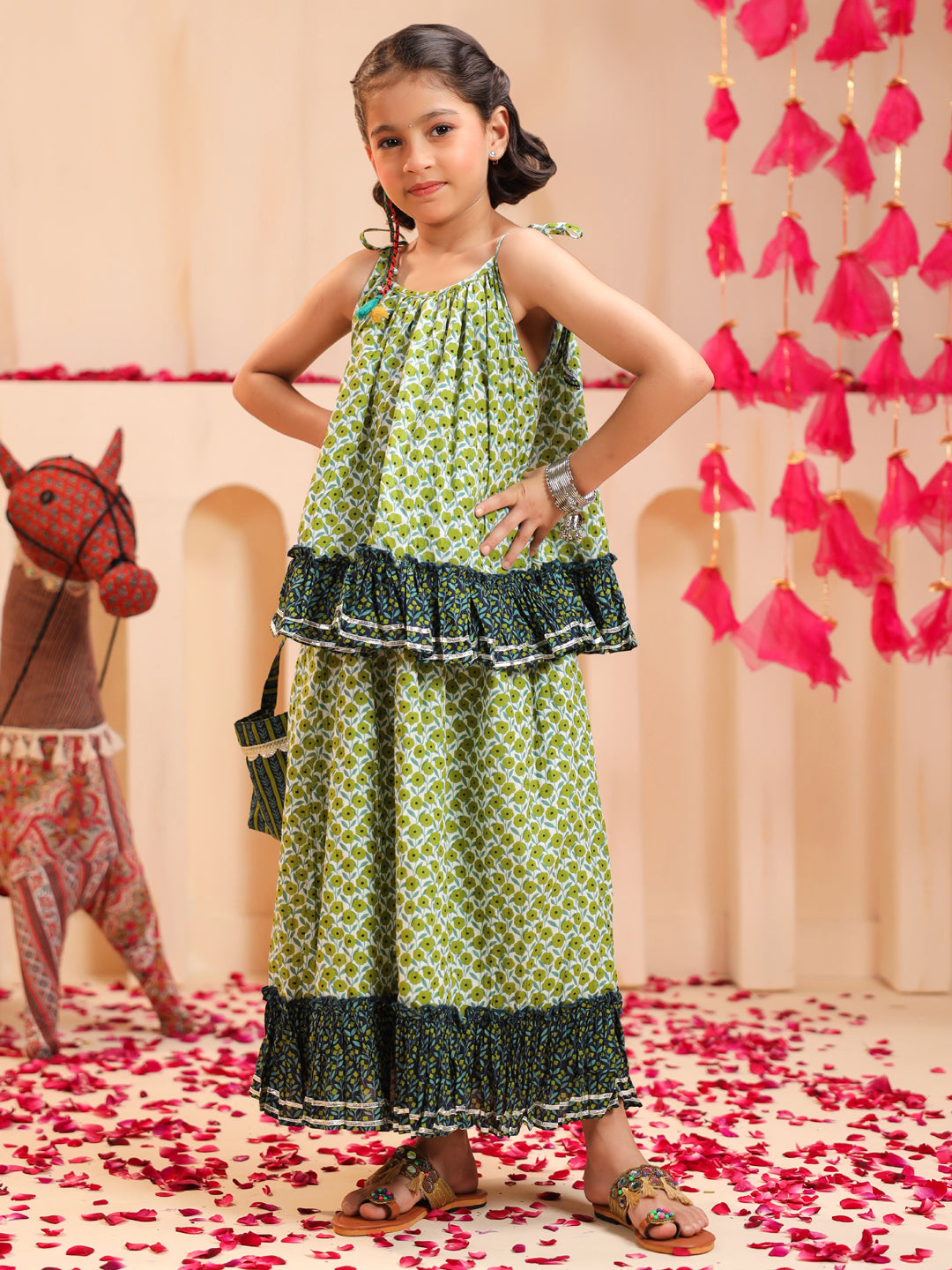 +This green floral printed lehenga set features a sleeveless round-neck top with tie-up shoulder details and a frilled hem, paired with a mid-rise flared skirt showcasing a matching floral print, elasticated waist, and dori tie-up. The look is completed with a dyed green net dupatta adorned with gota detailing and a matching potli bag, creating a charming and elegant outfit perfect for festive occasions.