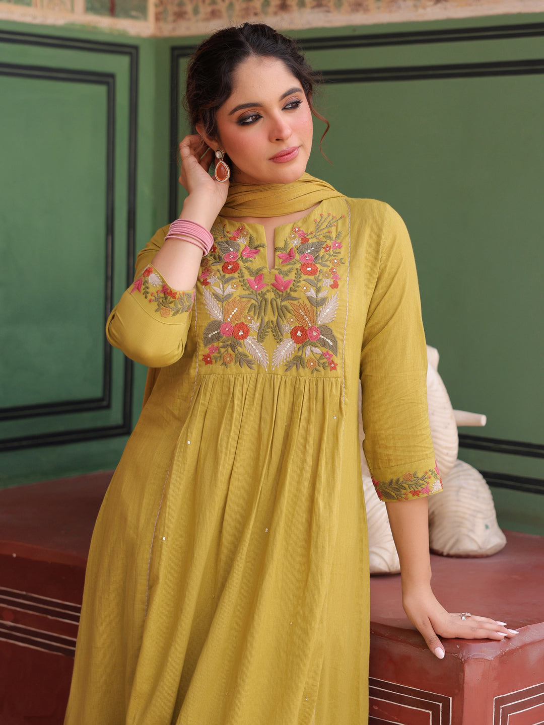 Floral Embroidered Mirror Work Pure Cotton Kurta With Trouser & Dupatta