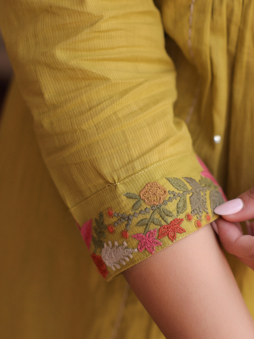+Elegant and festive, this yellow solid embroidered kurta set is a lovely pick for special occasions! The round-neck kurta features a beautifully embroidered yoke and hem, with three-quarter sleeves and a comfy straight fit. It comes with matching solid mid-rise trousers that are easy to wear with a slip-on style, and a soft dyed cotton dupatta finished with cute tassel details.