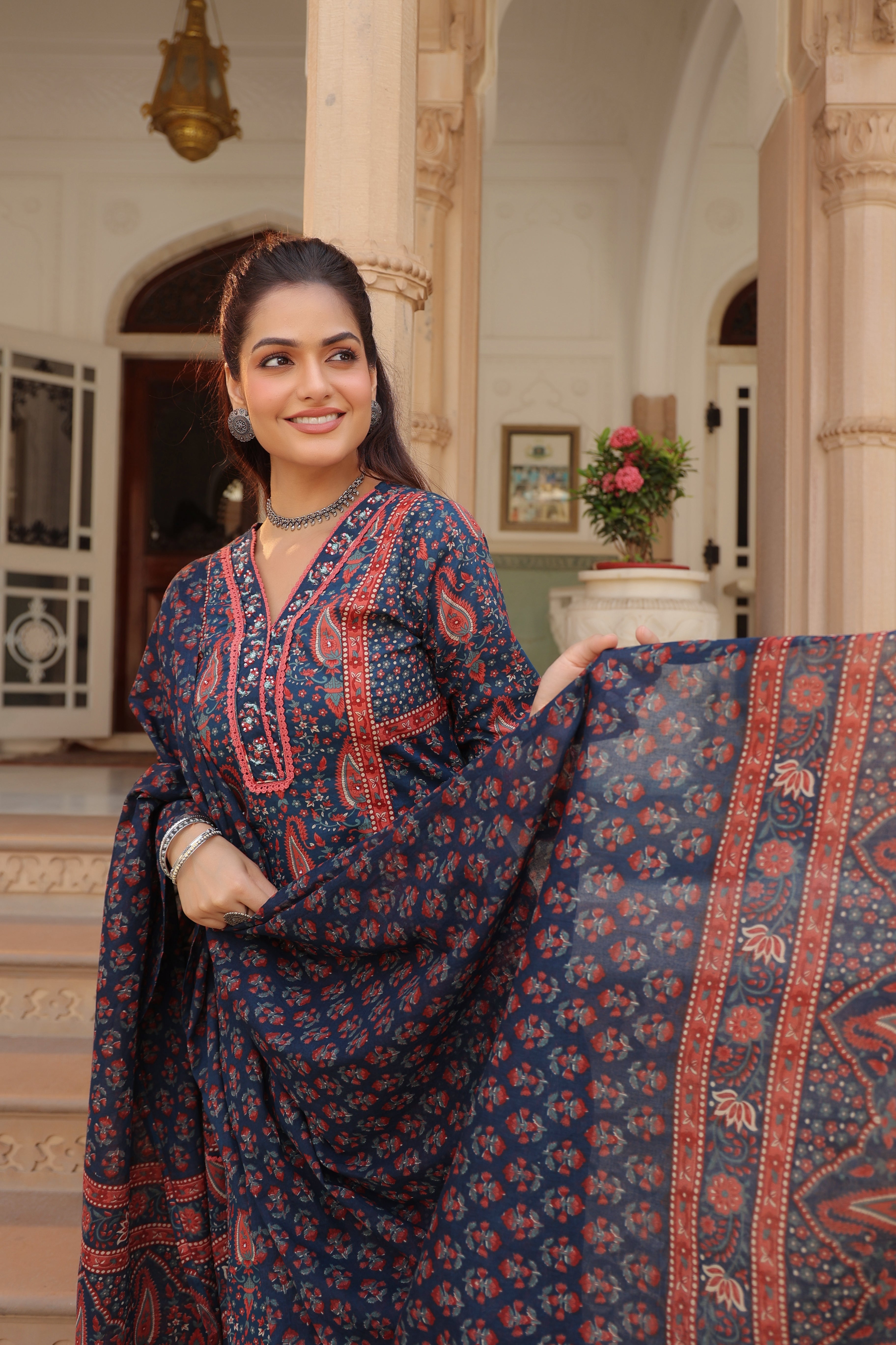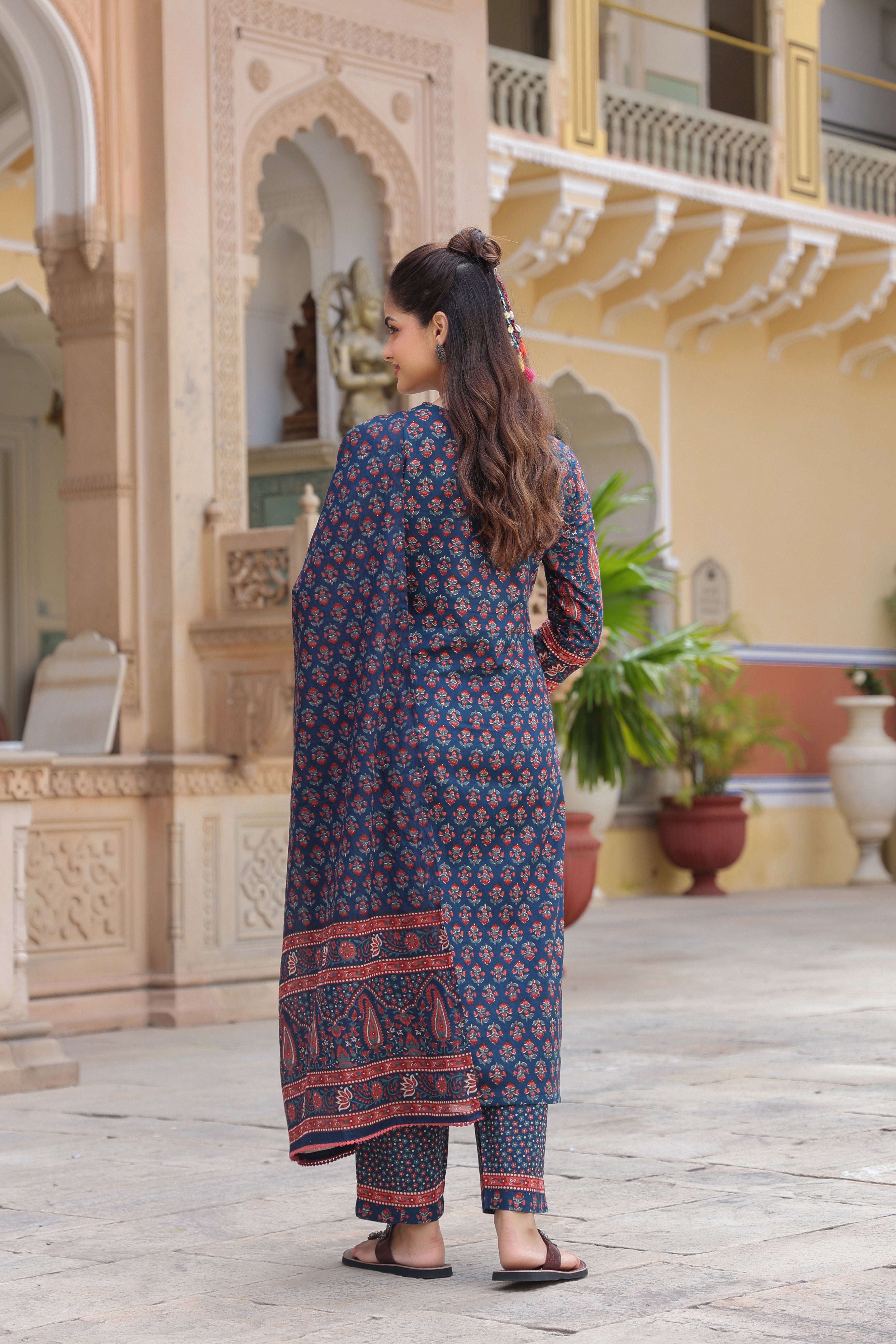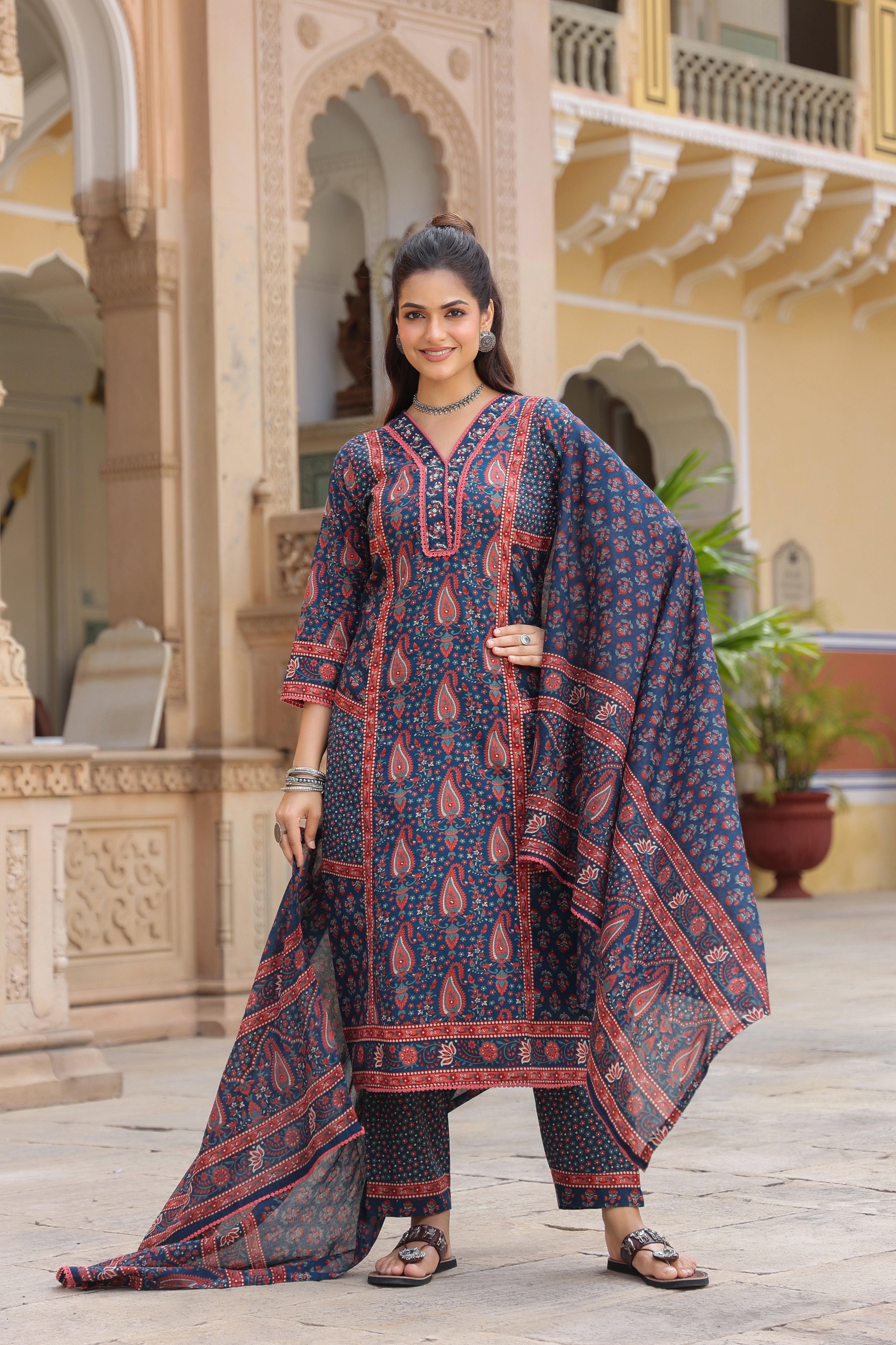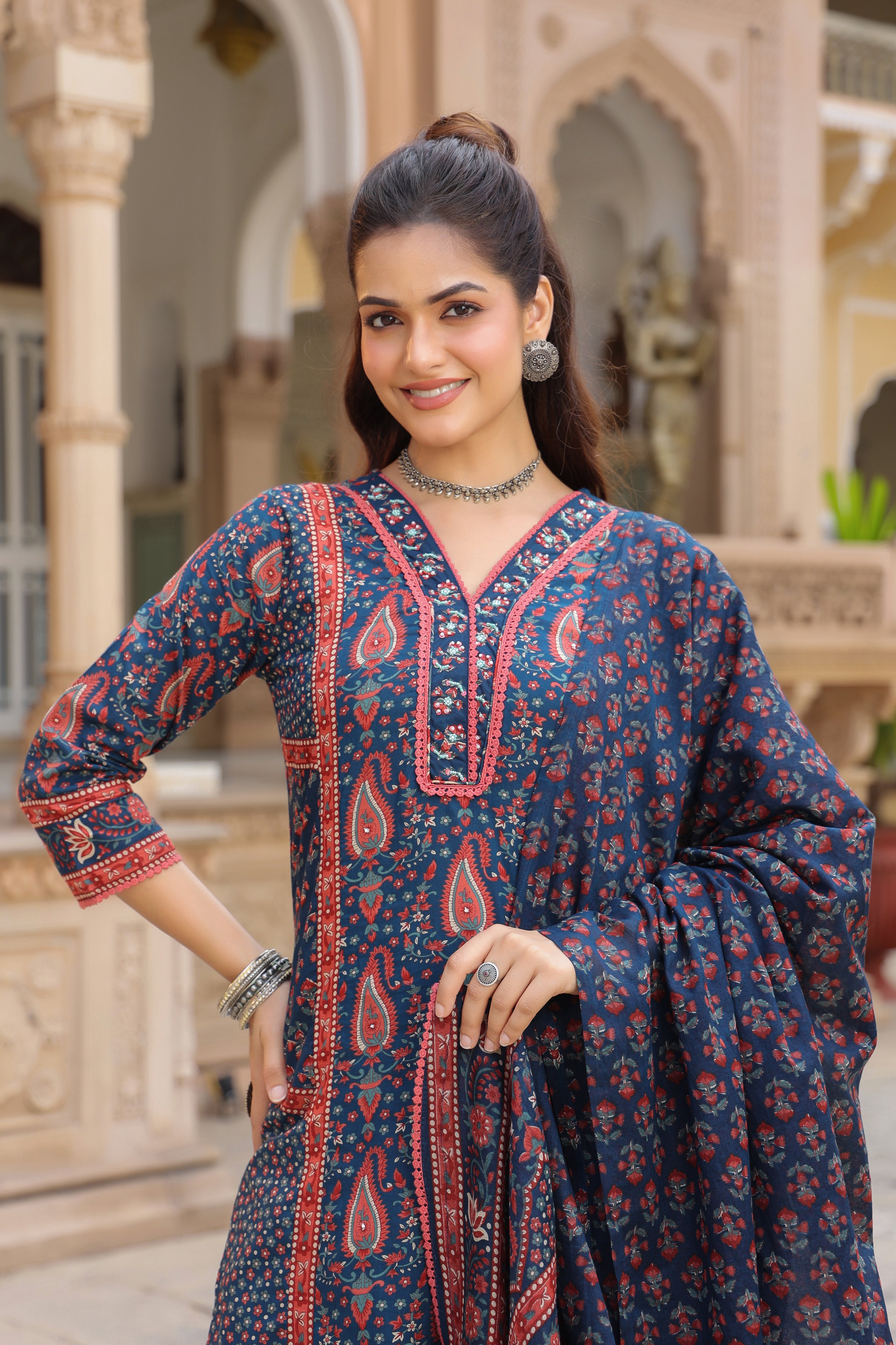 +A blue straight-fit kurta set featuring a V-neckline with lace and bead detailing, three-quarter sleeves, and side slits for comfort. It comes with matching printed mid-rise trousers with a slip-on closure and a printed cotton dupatta finished with lace edging.