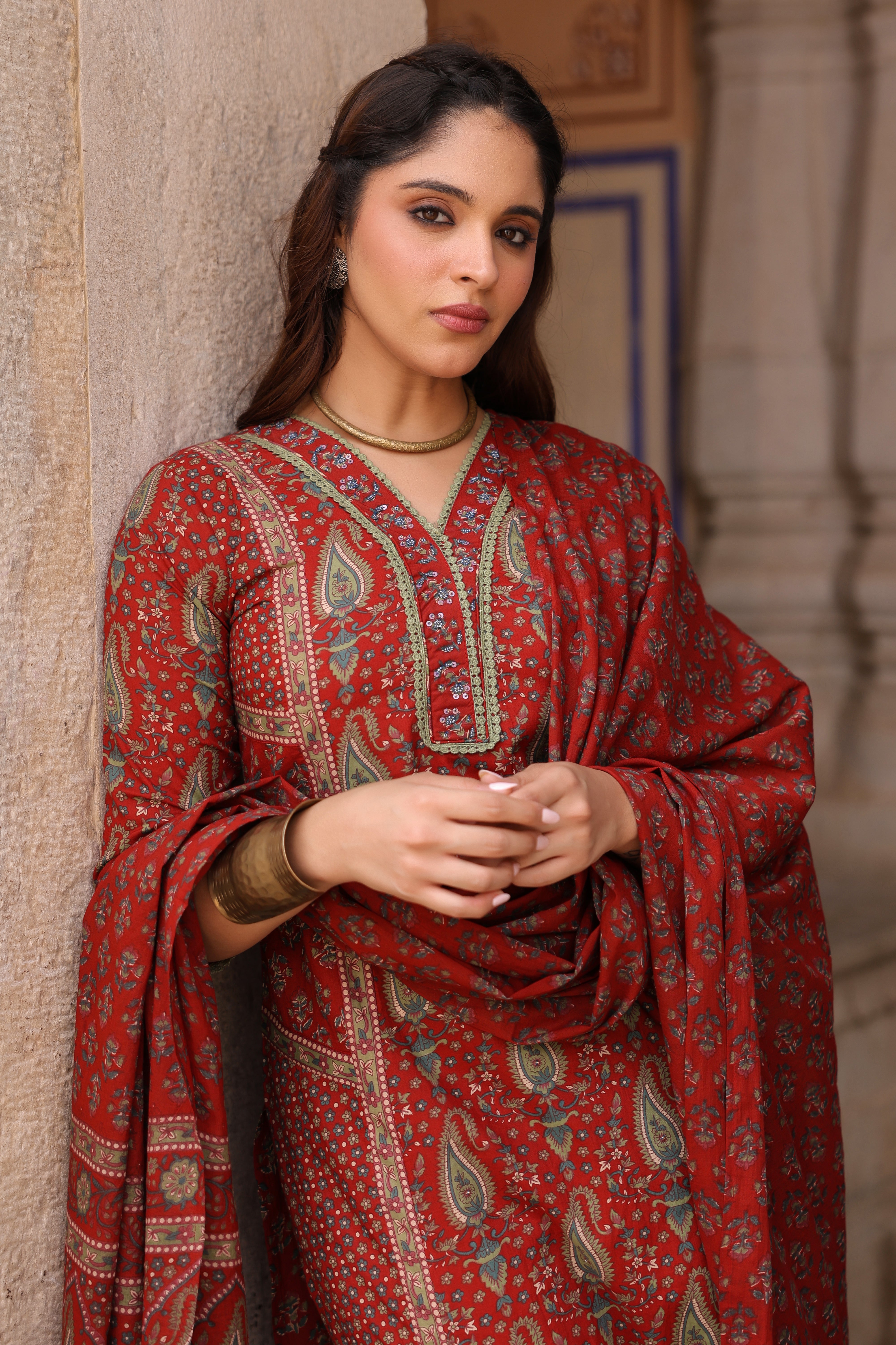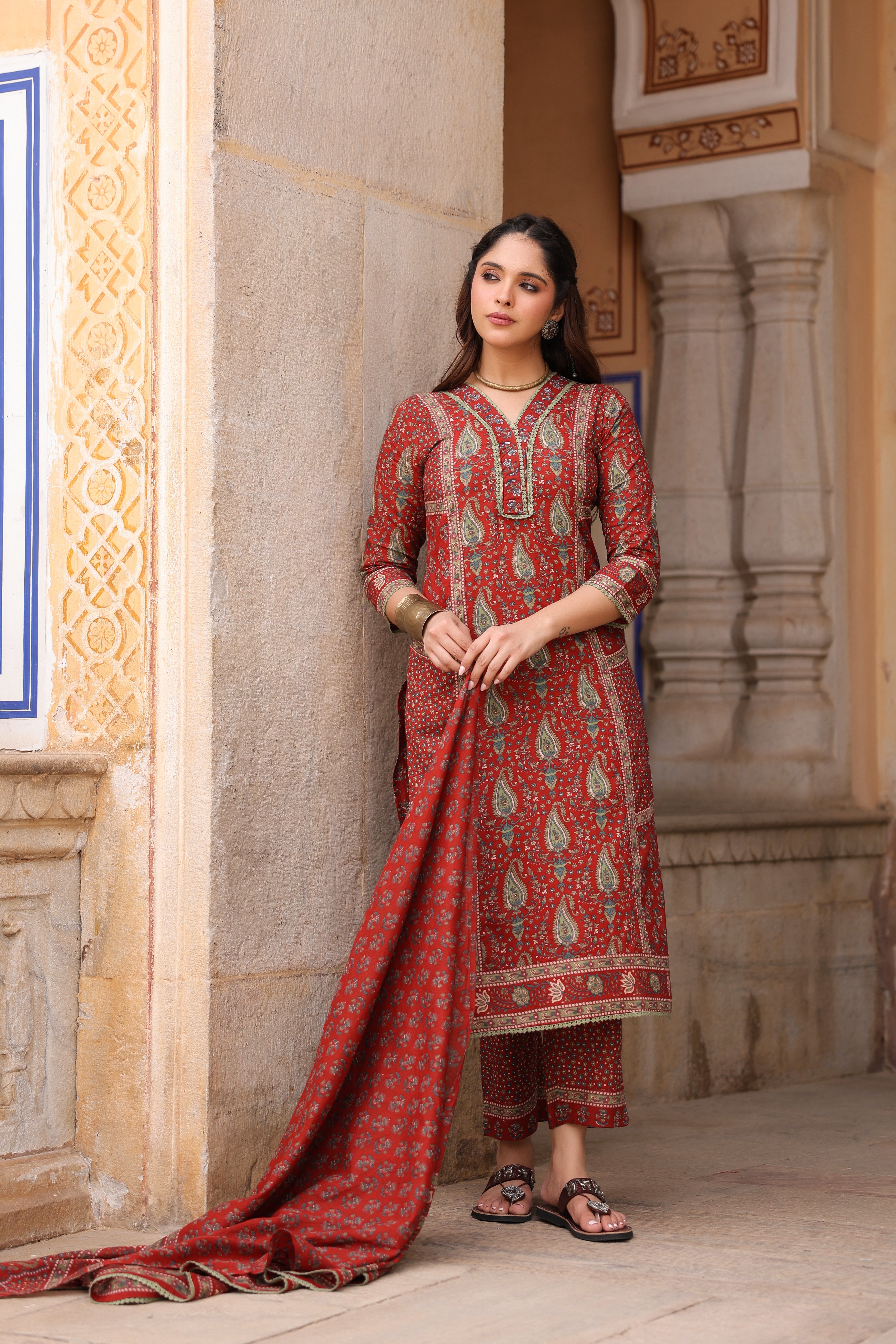 A maroon straight-fit kurta set featuring a V-neckline with lace and bead detailing, three-quarter sleeves, and side slits for comfort. It comes with matching printed mid-rise trousers with a slip-on closure and a printed cotton dupatta finished with lace edging.