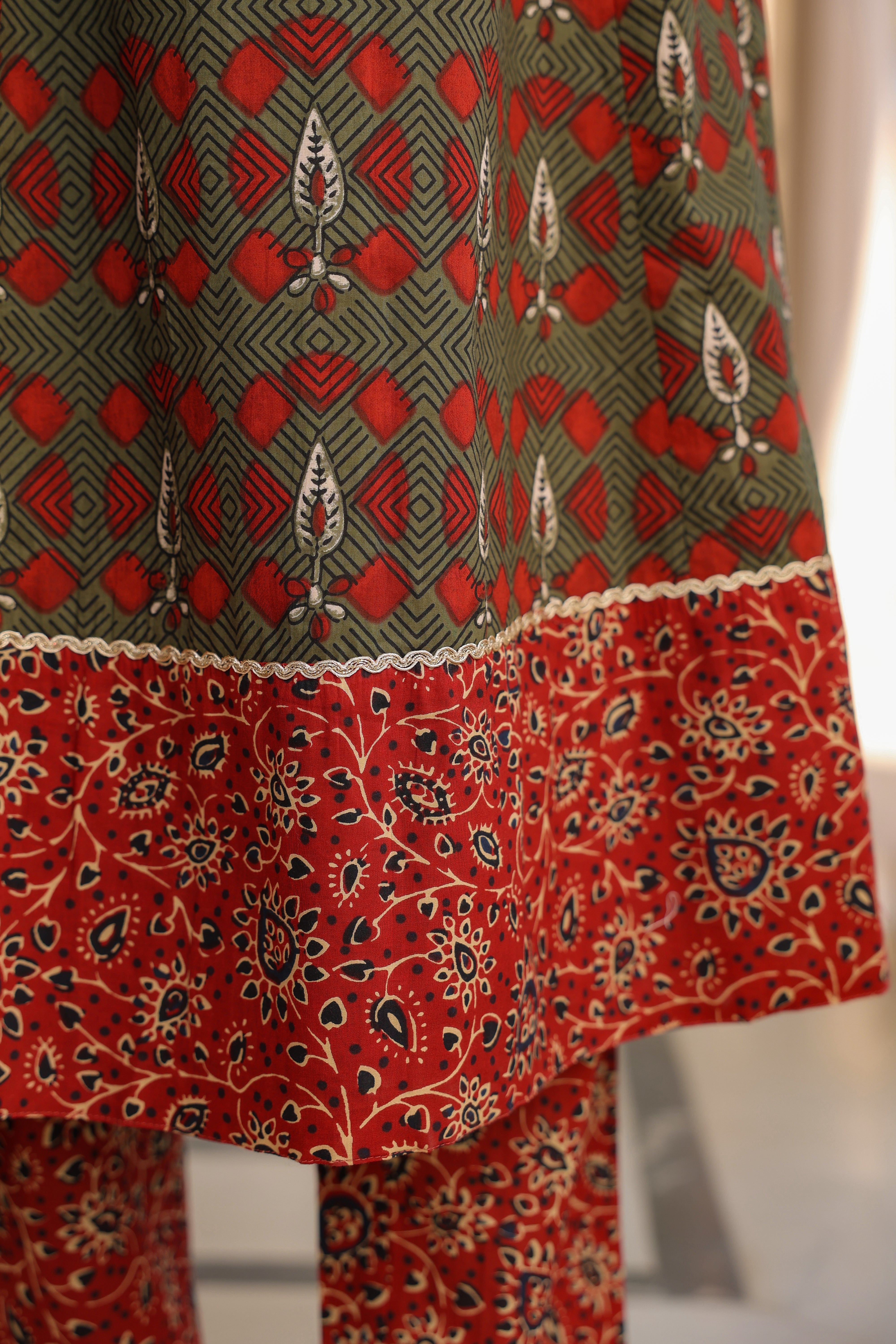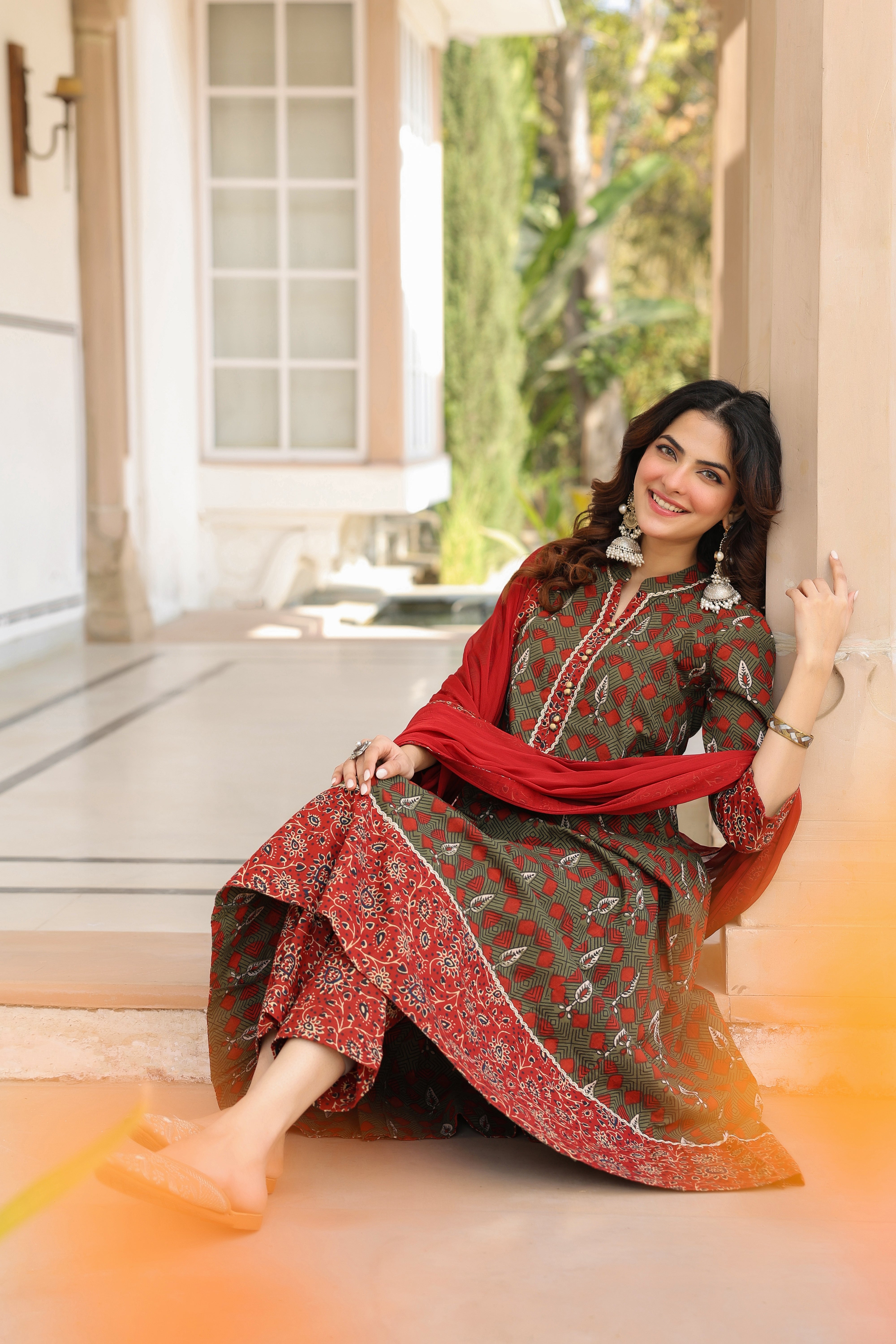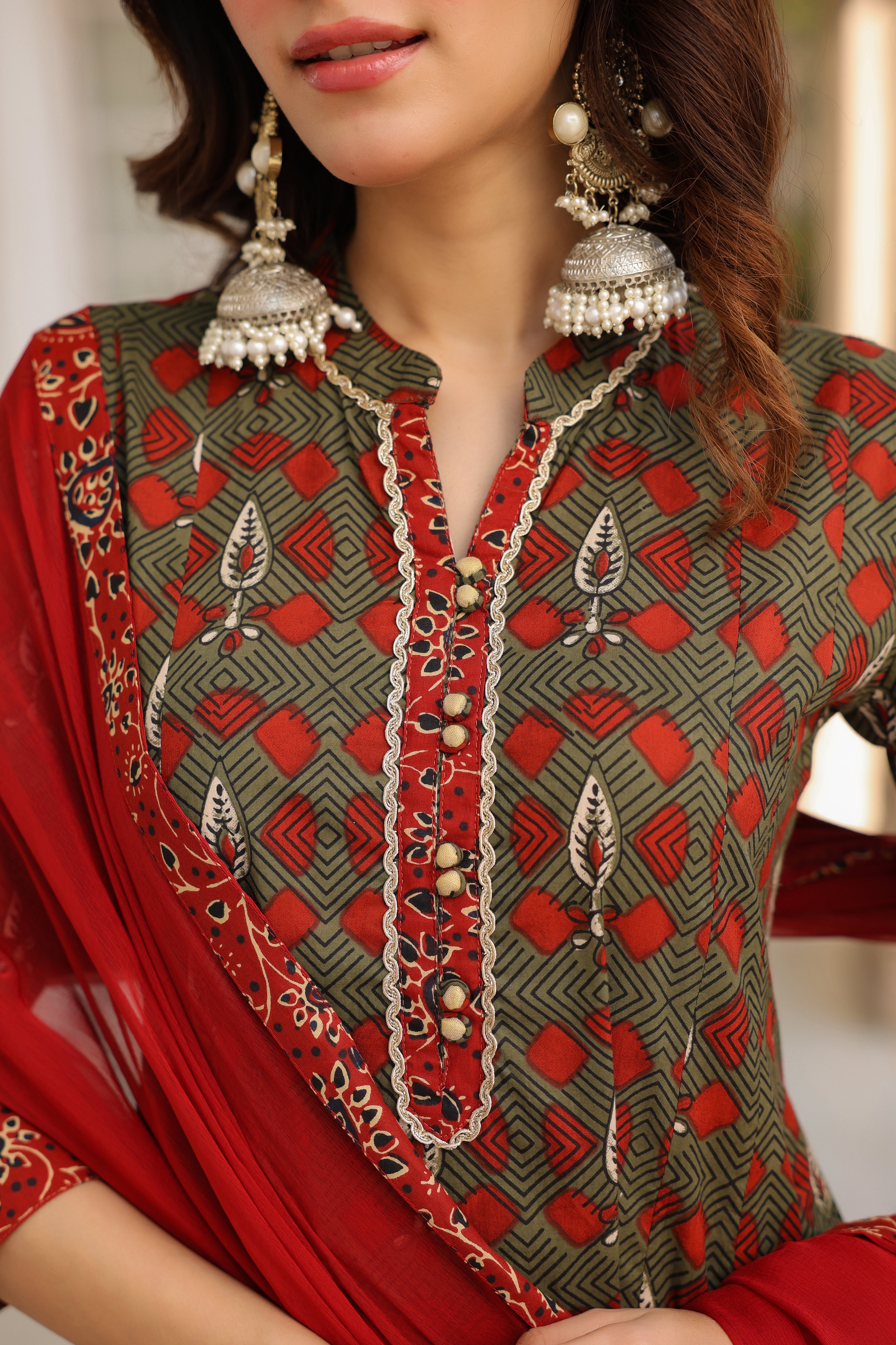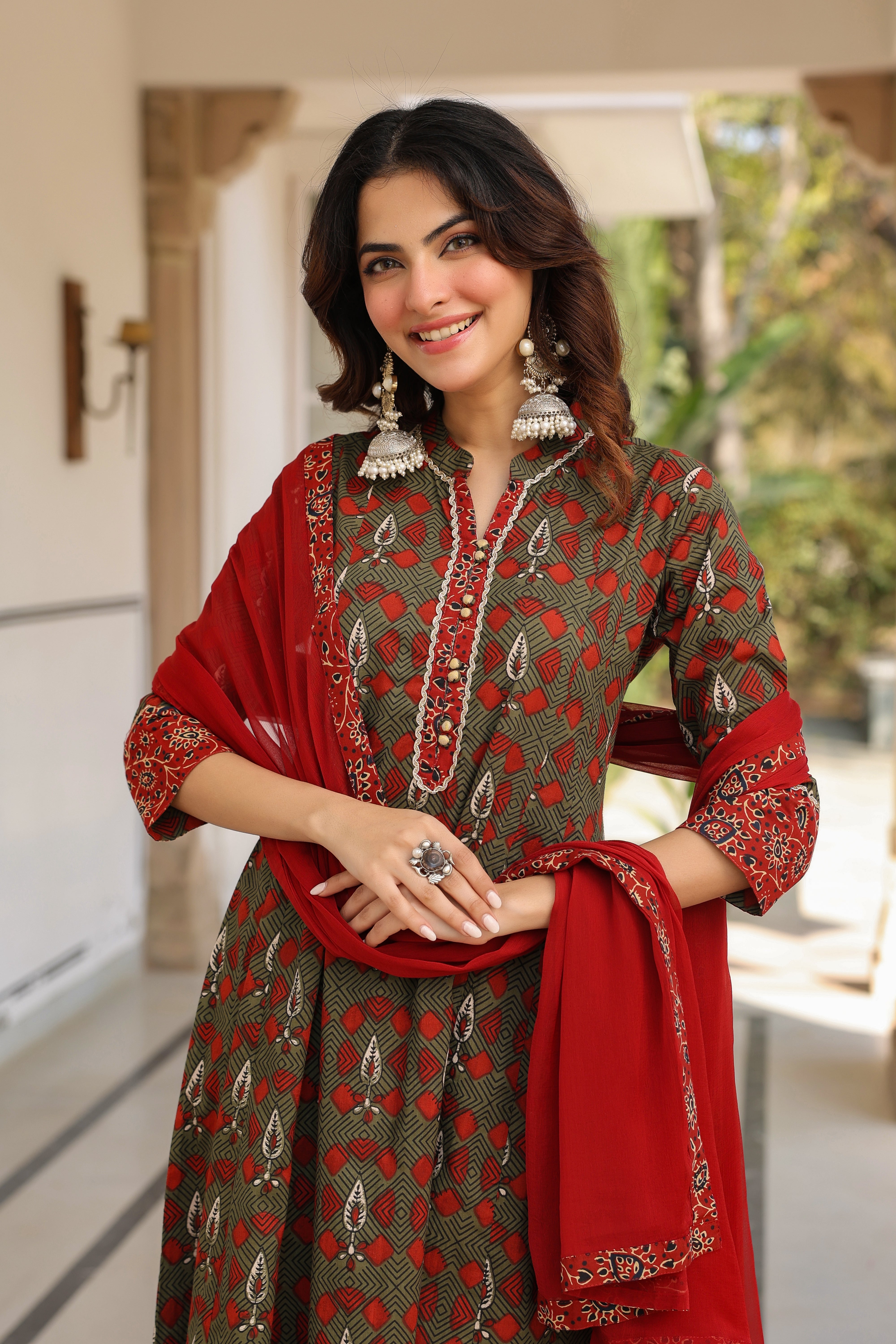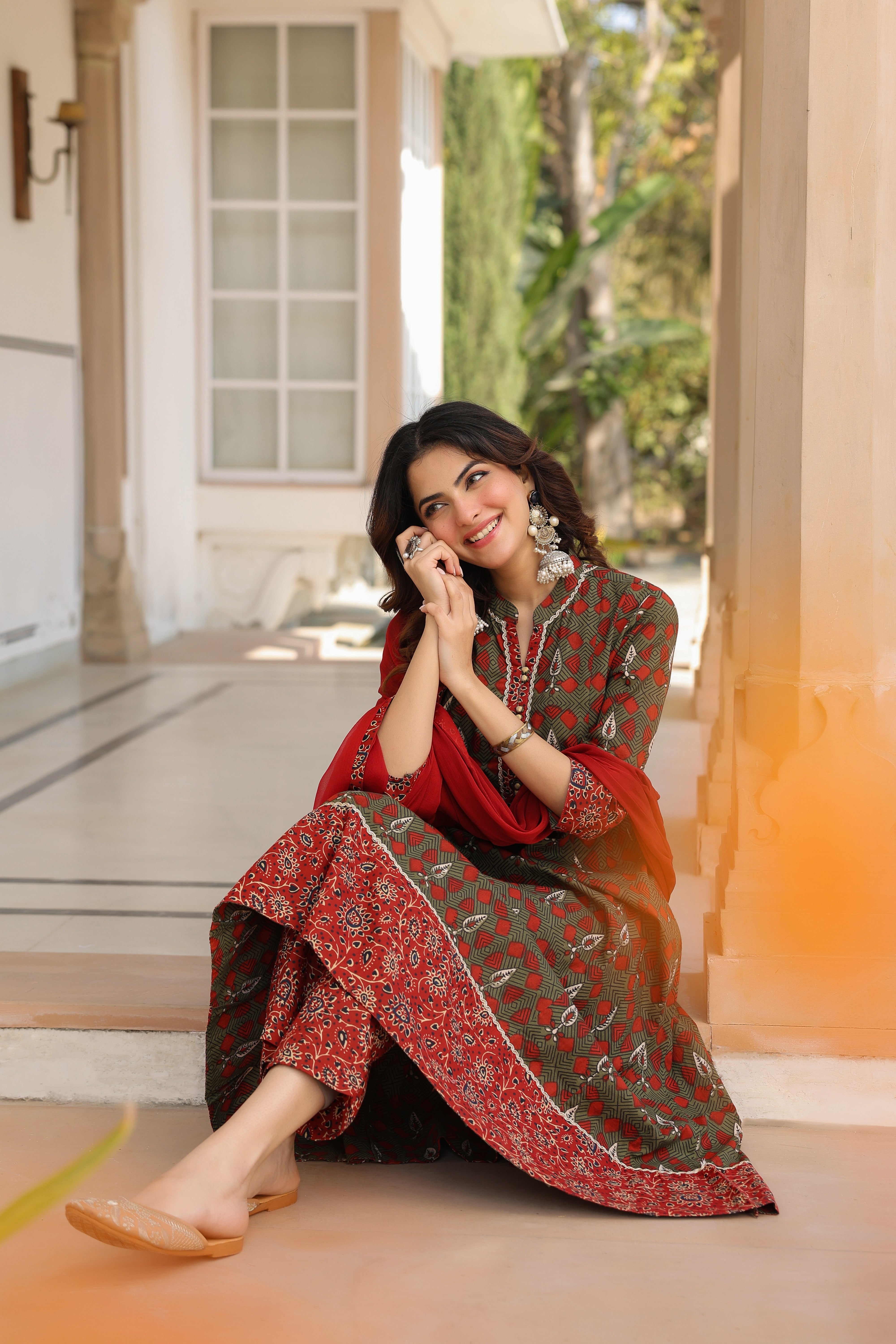 +Refresh your ethnic wardrobe with this green and maroon ethnic motifs printed kurta set. The fit-and-flare Anarkali kurta features a mandarin collar with delicate lace detailing and three-quarter sleeves for a graceful look.