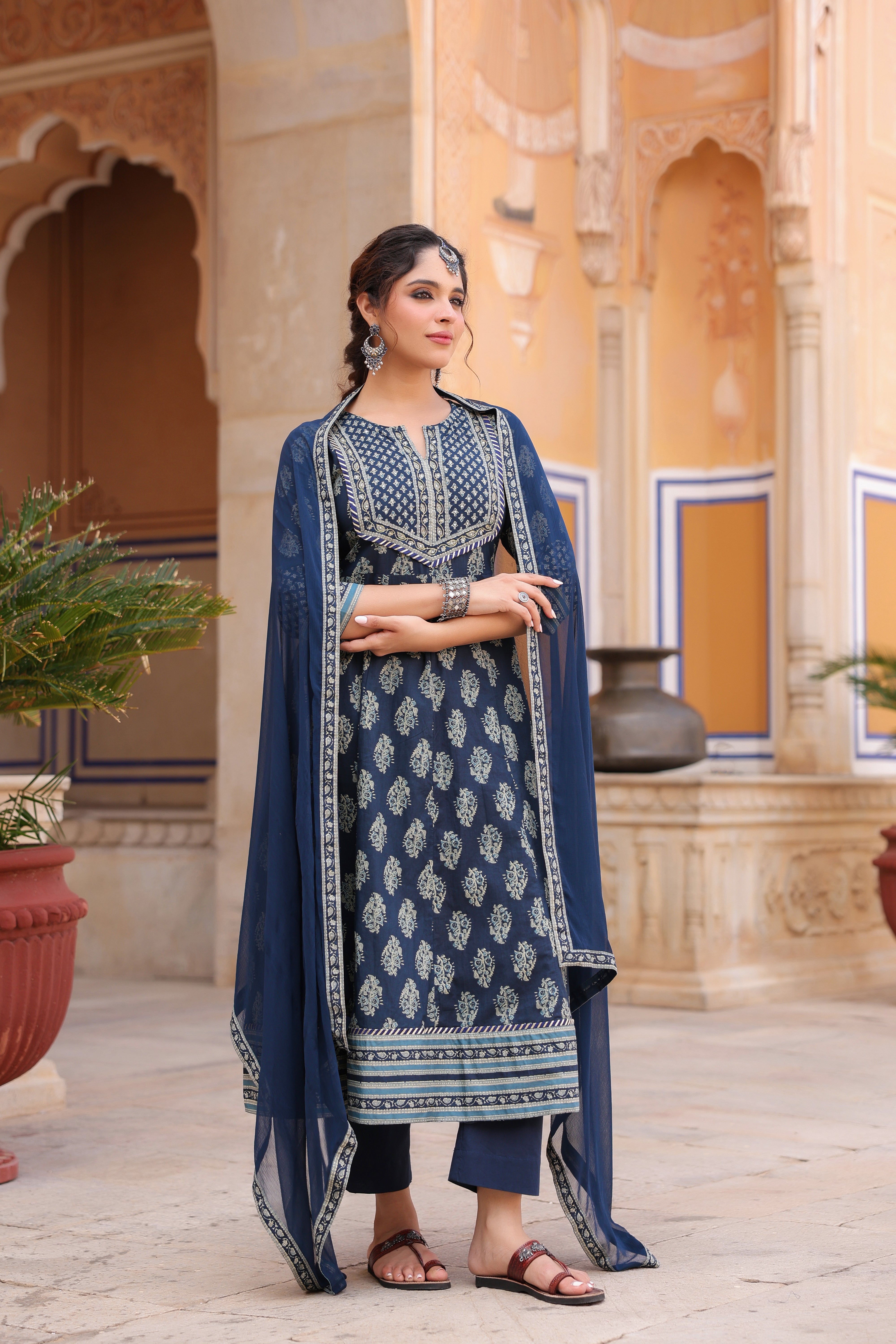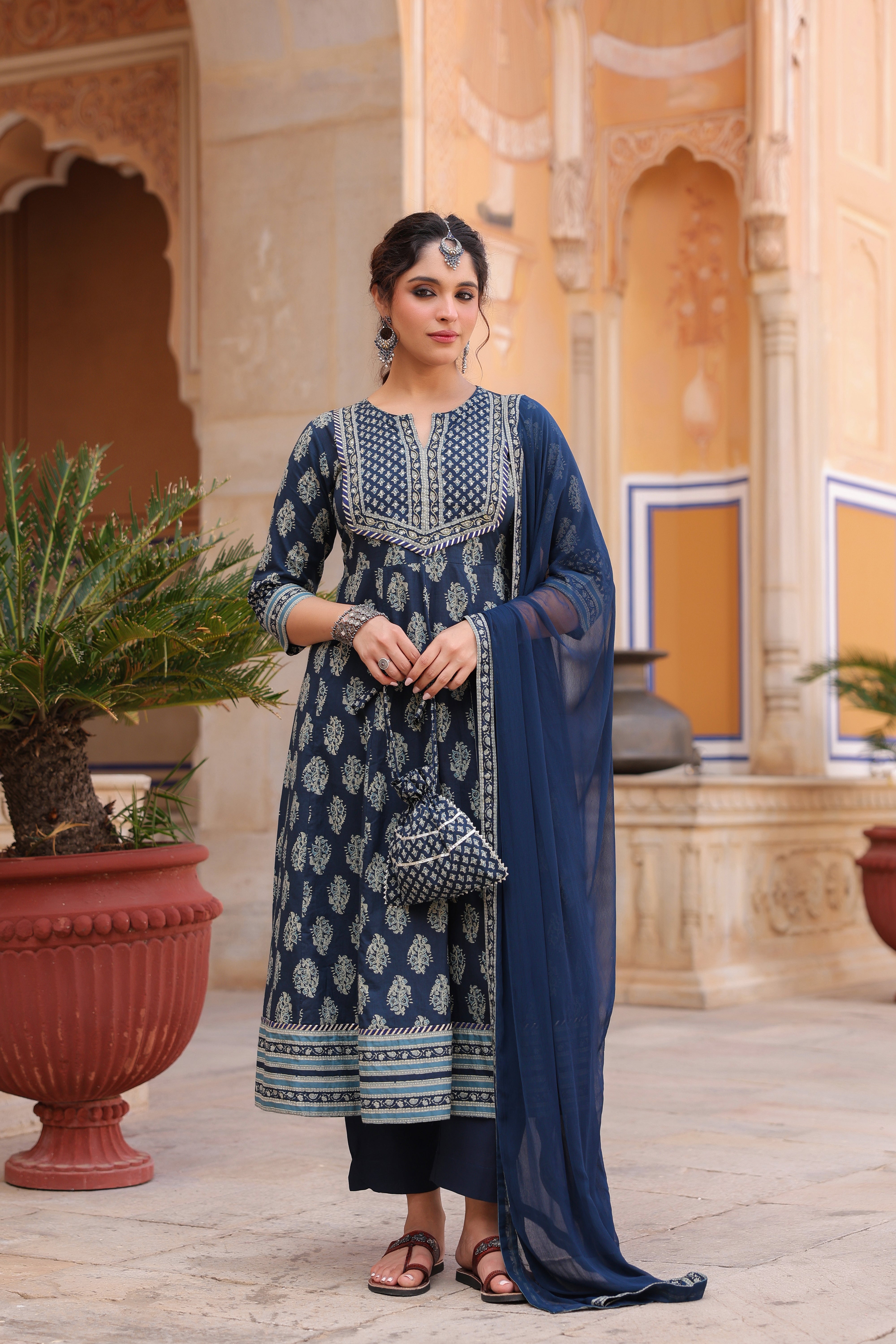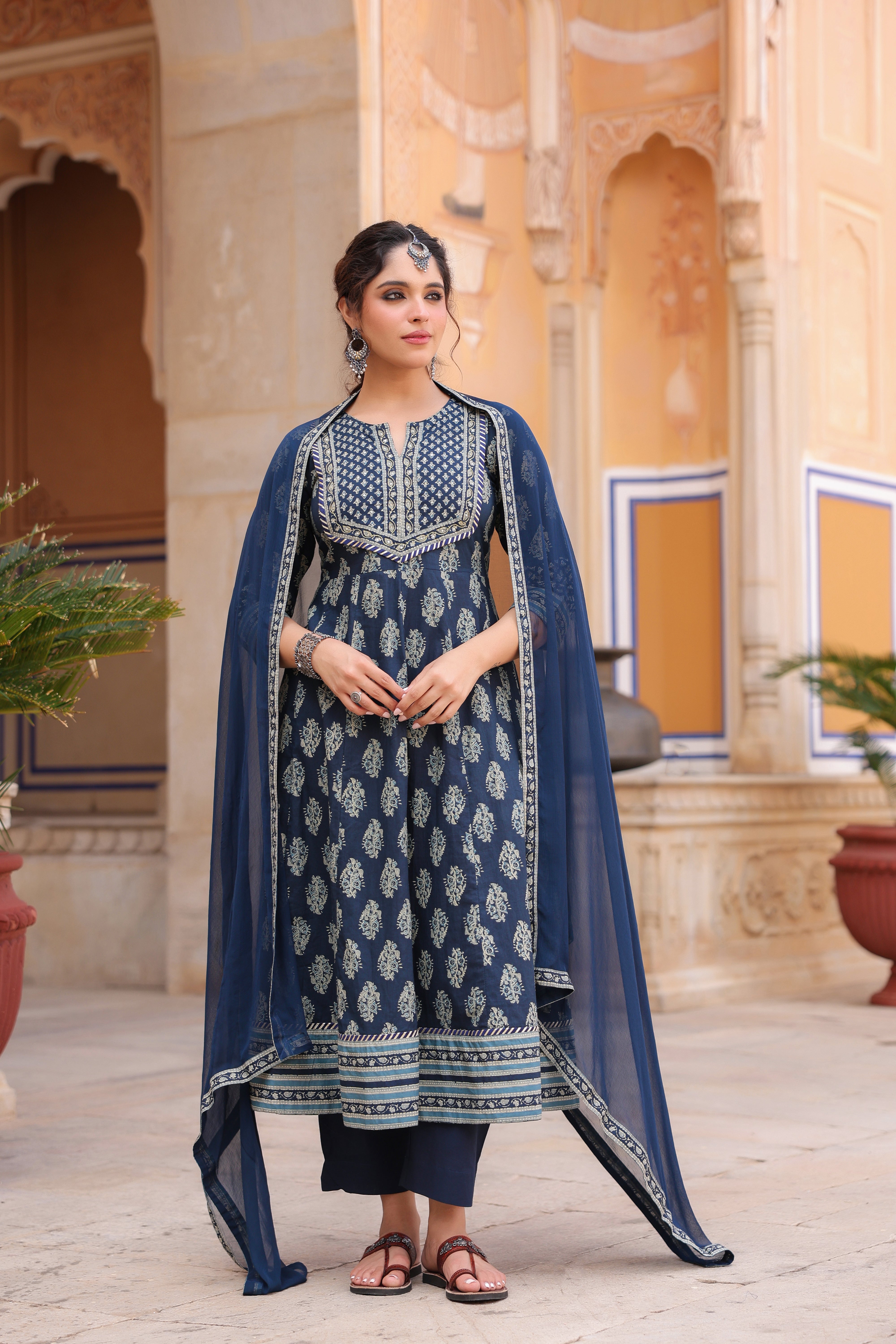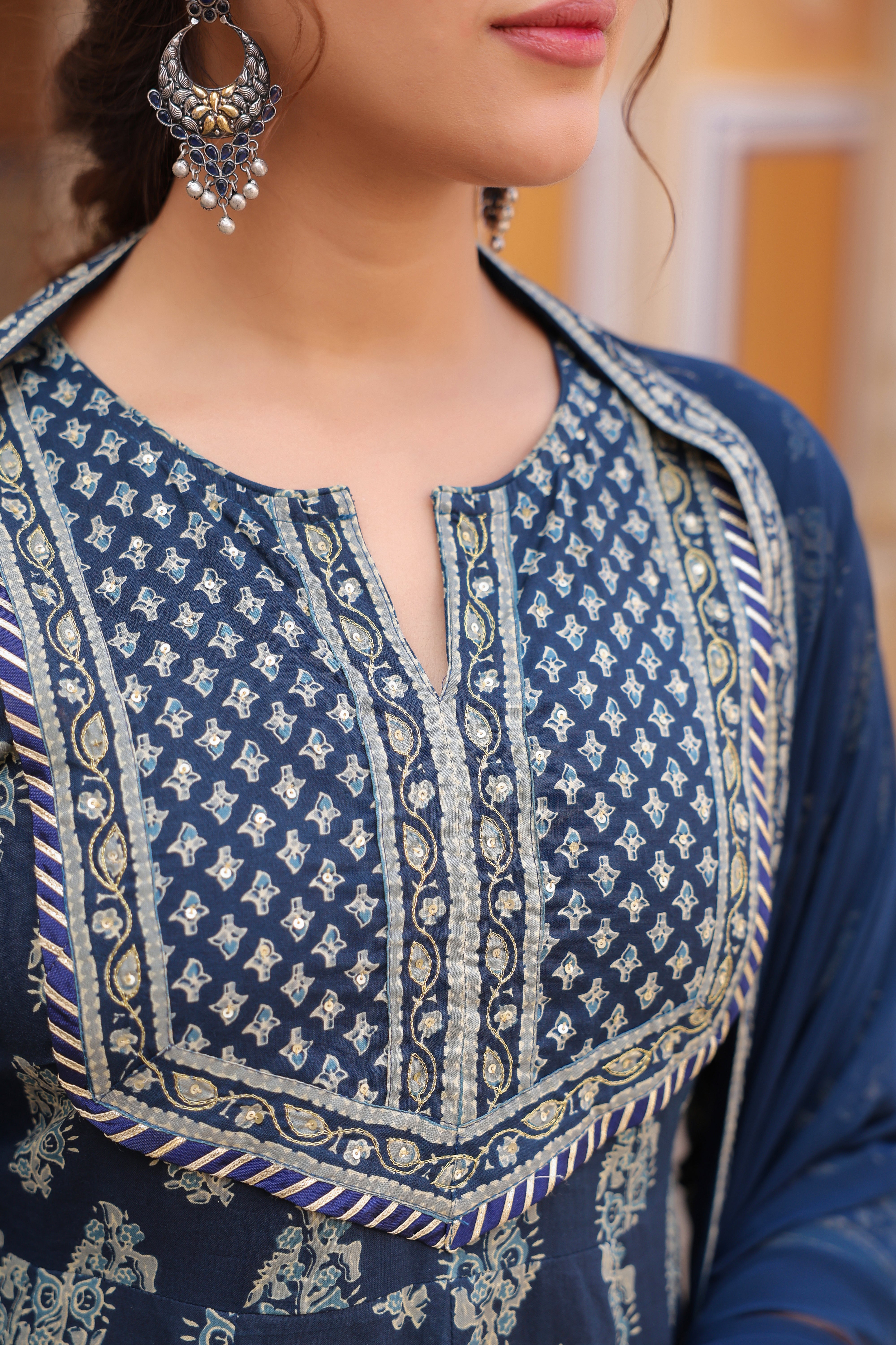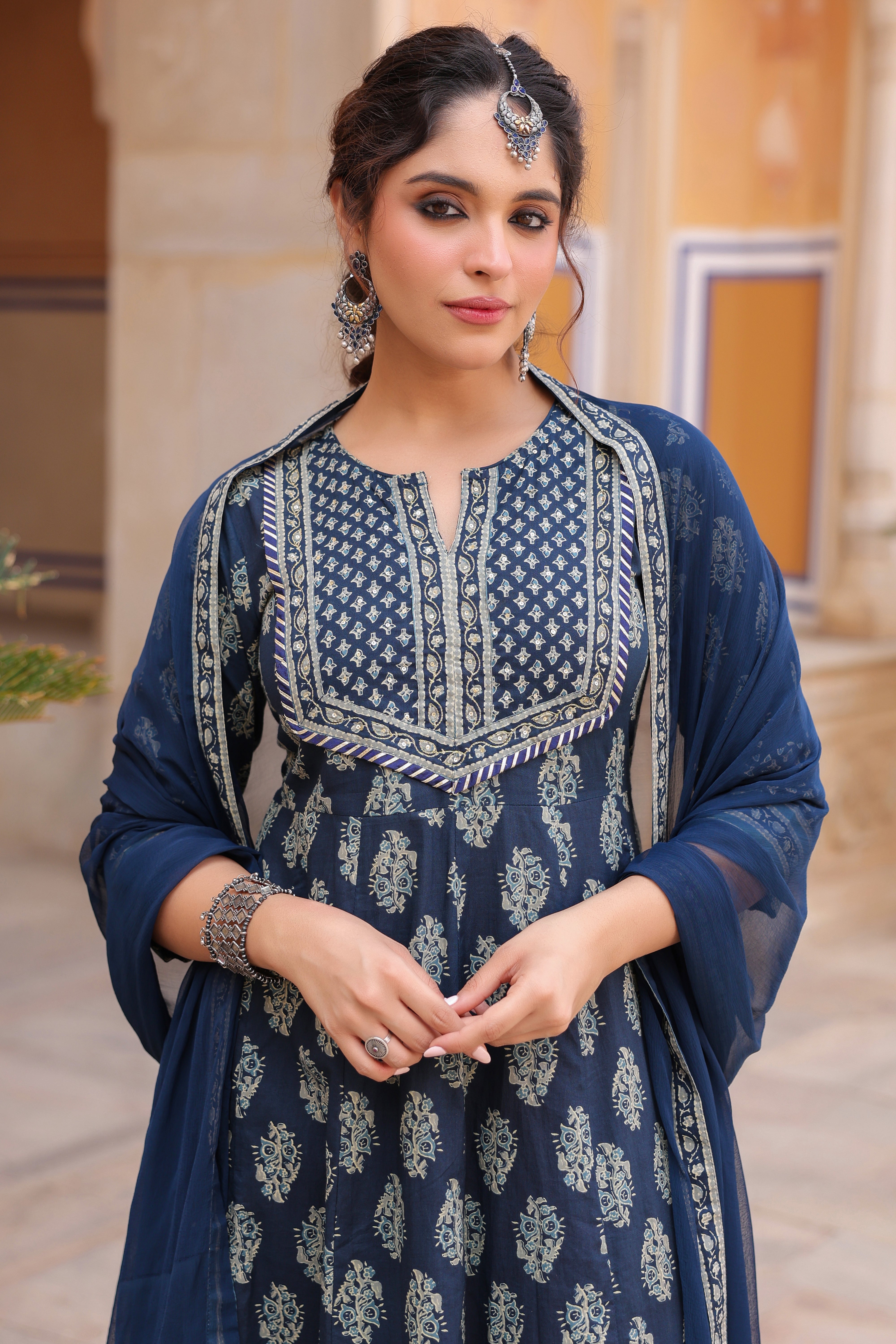 +A blue Anarkali kurta set featuring ethnic motif prints and a round neckline adorned with zari and sequin detailing. The fit-and-flare kurta comes with three-quarter sleeves and pairs with solid mid-rise trousers with a slip-on closure. A dyed chiffon dupatta with border edging completes the look.