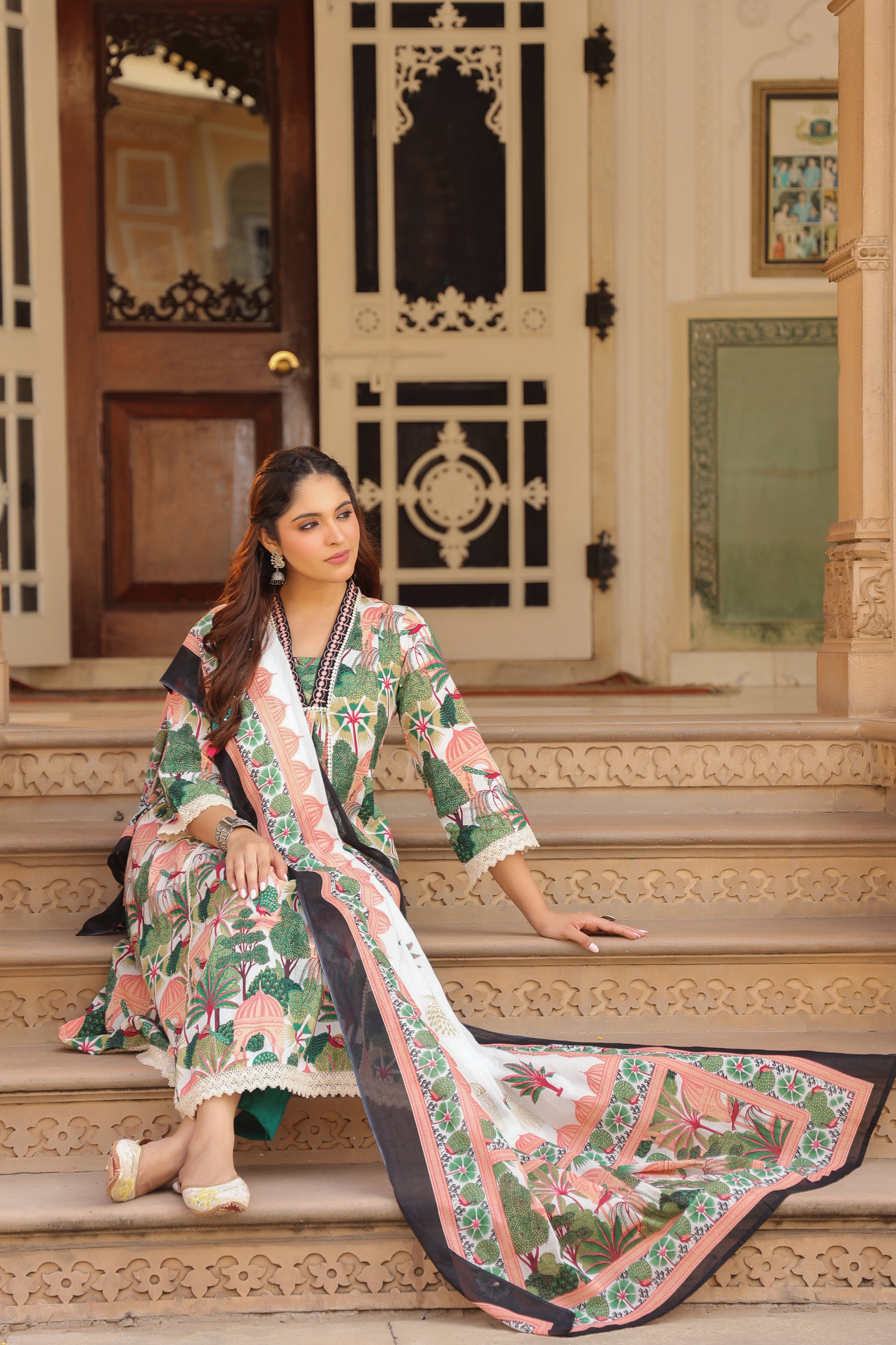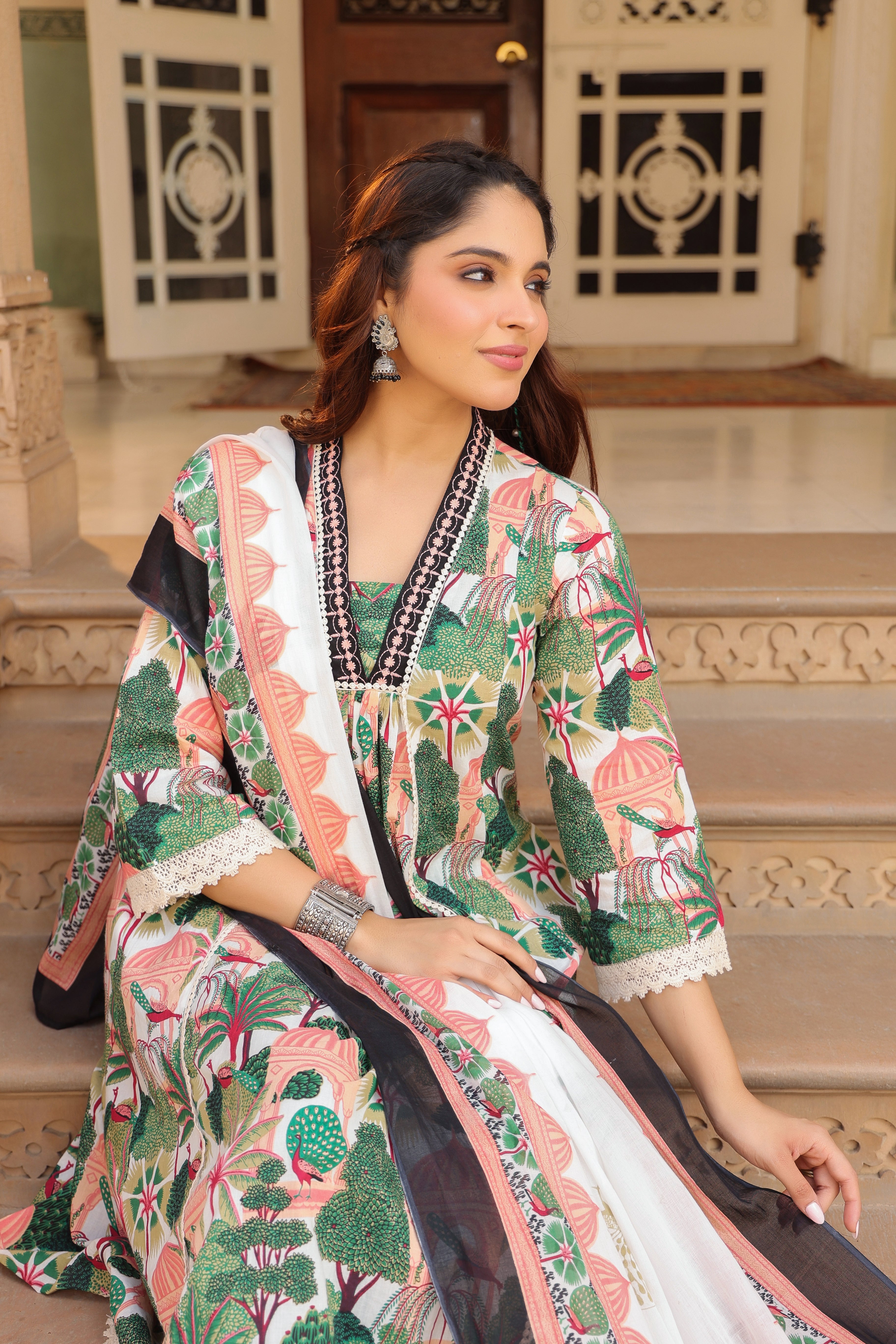 +This elegant kurta set features a green and white tropical print paired with solid trousers and a coordinated printed cotton dupatta. The V-neck kurta is enhanced with delicate embroidery on the yoke, while three-quarter sleeves are finished with lace detailing for a refined touch. Designed in a flattering A-line silhouette, the kurta includes soft gathers at the front for added comfort and style. It is paired with solid green, mid-rise trousers featuring a convenient slip-on closure. The look is completed with a lightweight printed cotton dupatta, perfect for everyday elegance or festive wear.
