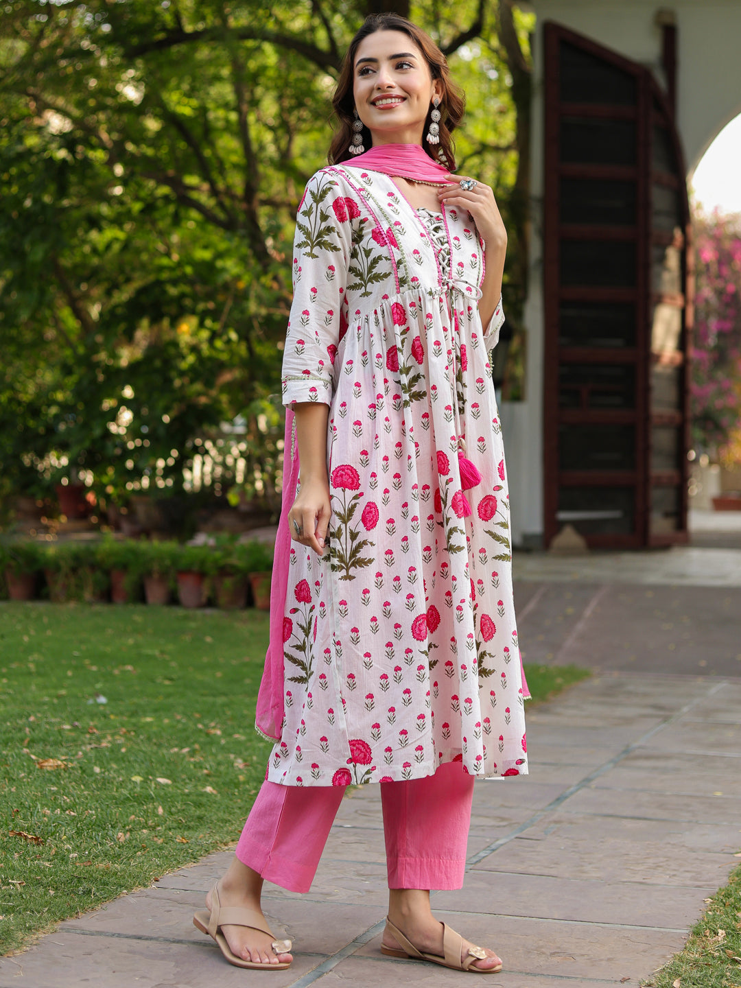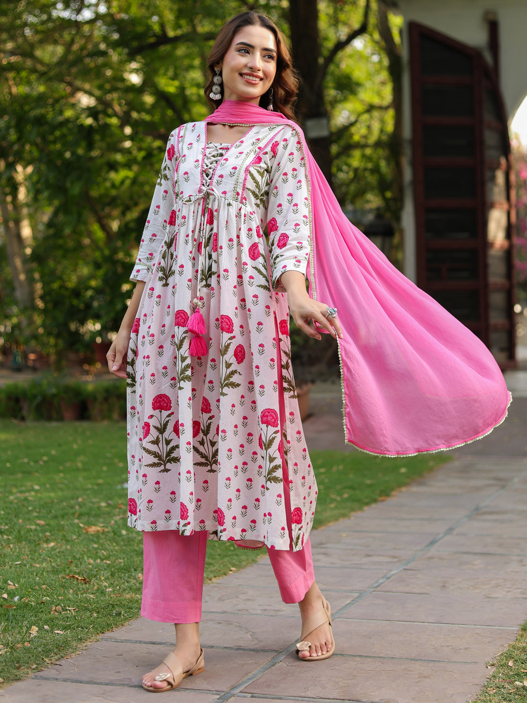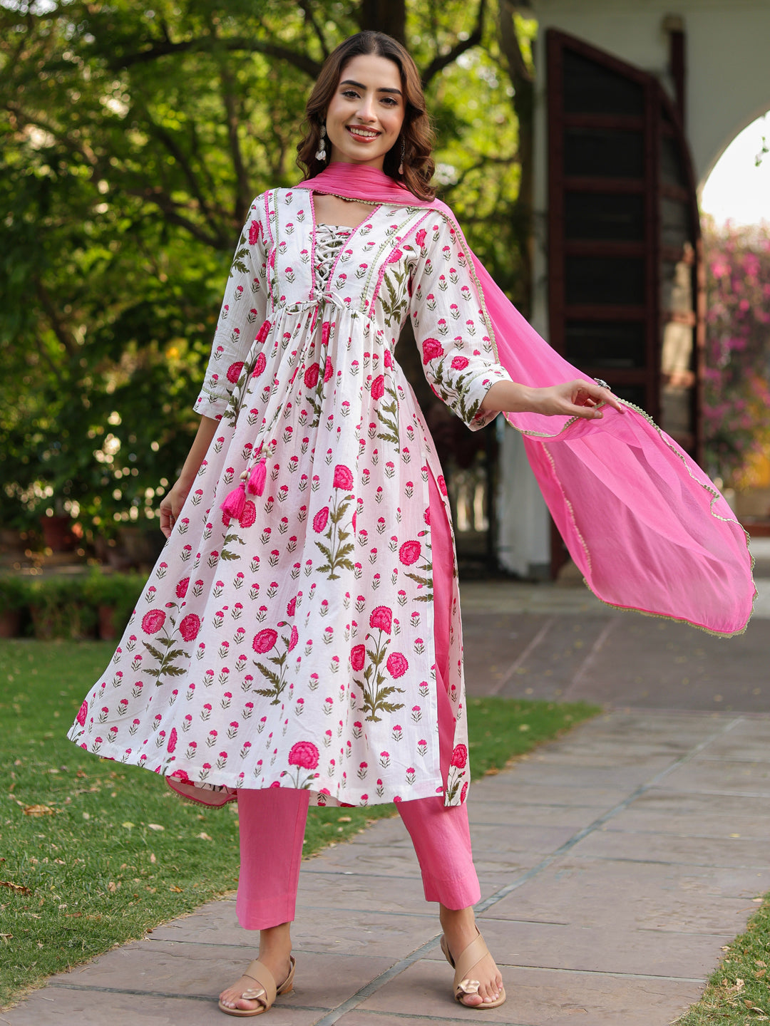 +This elegant white and pink floral printed kurta set is a perfect blend of comfort and feminine charm. The kurta features a graceful V-neckline with a delicate tie-up detail at the front, adding a stylish accent. Designed with three-quarter sleeves enhanced with lace detailing, the A-line silhouette offers a flattering fit, while side slits ensure ease of movement. The set is paired with solid pink mid-rise trousers featuring a comfortable slip-on closure and functional pockets. Completing the look is a beautifully dyed pink chiffon dupatta, finished with lace edging for a soft, graceful drape.