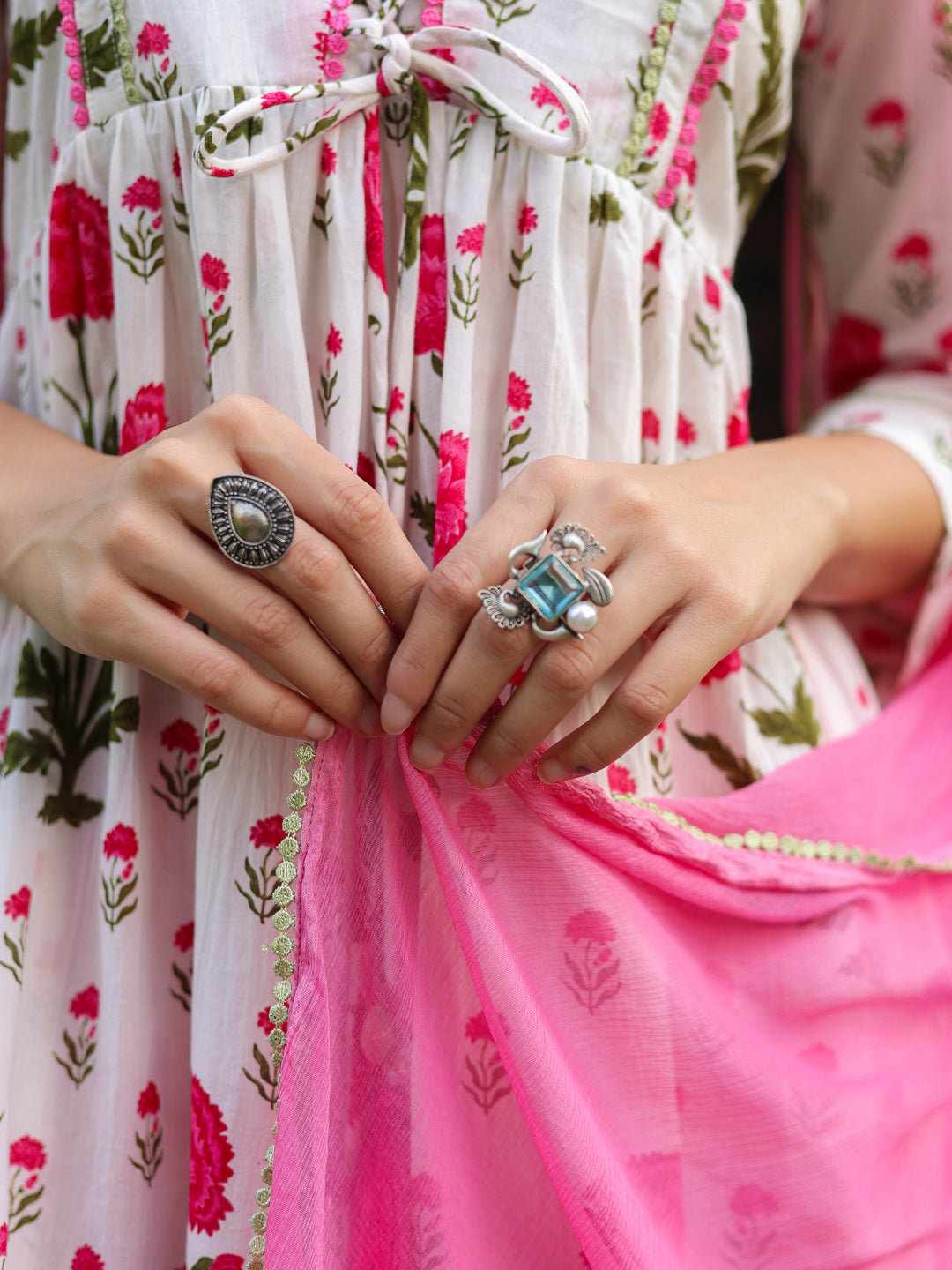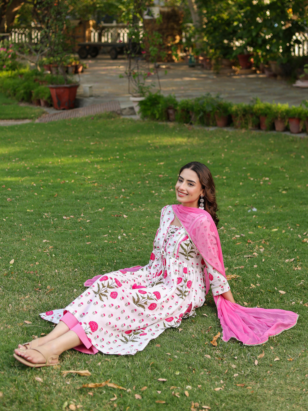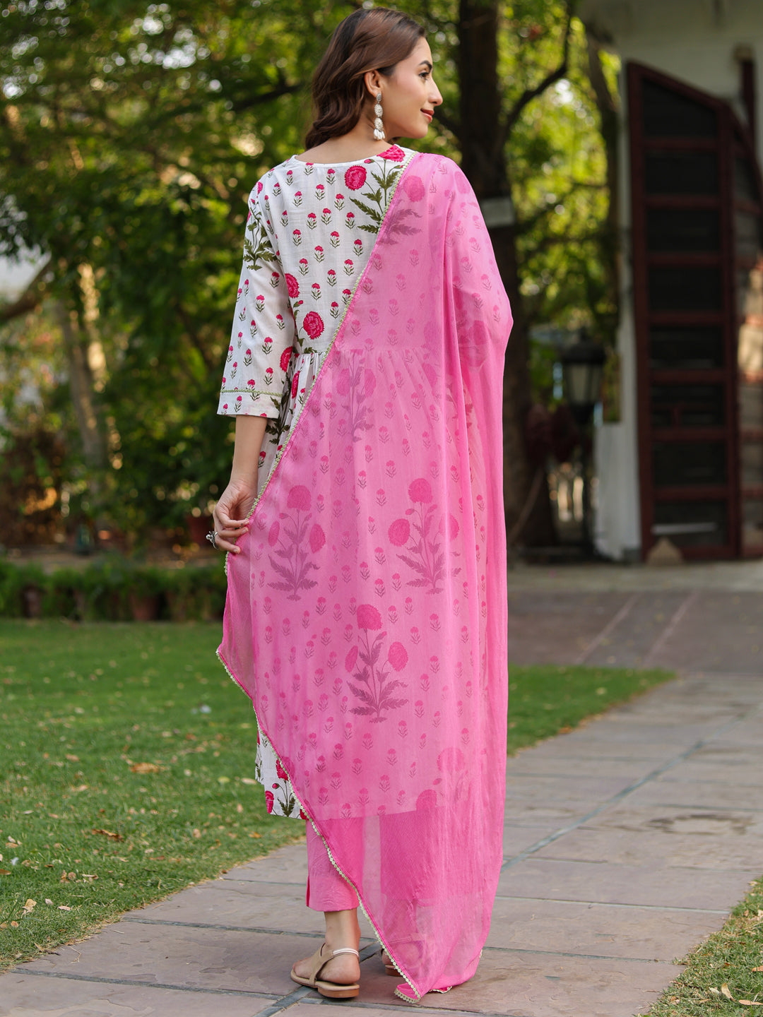 +This elegant white and pink floral printed kurta set is a perfect blend of comfort and feminine charm. The kurta features a graceful V-neckline with a delicate tie-up detail at the front, adding a stylish accent. Designed with three-quarter sleeves enhanced with lace detailing, the A-line silhouette offers a flattering fit, while side slits ensure ease of movement. The set is paired with solid pink mid-rise trousers featuring a comfortable slip-on closure and functional pockets. Completing the look is a beautifully dyed pink chiffon dupatta, finished with lace edging for a soft, graceful drape.