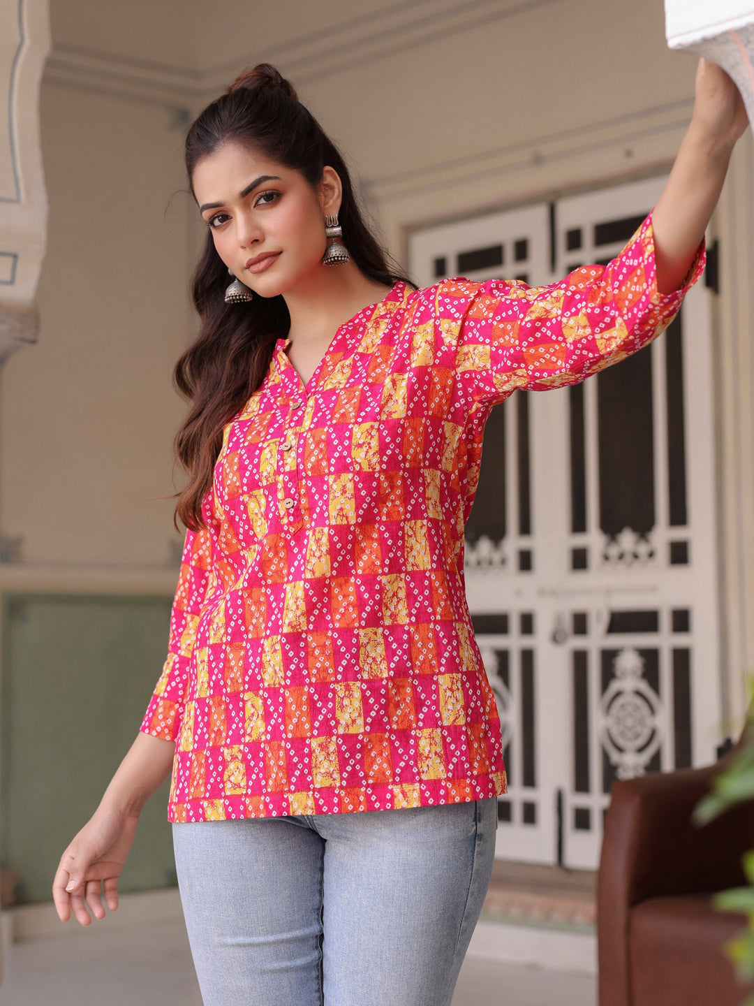 Women Printed Mandarin Collar Cotton Top