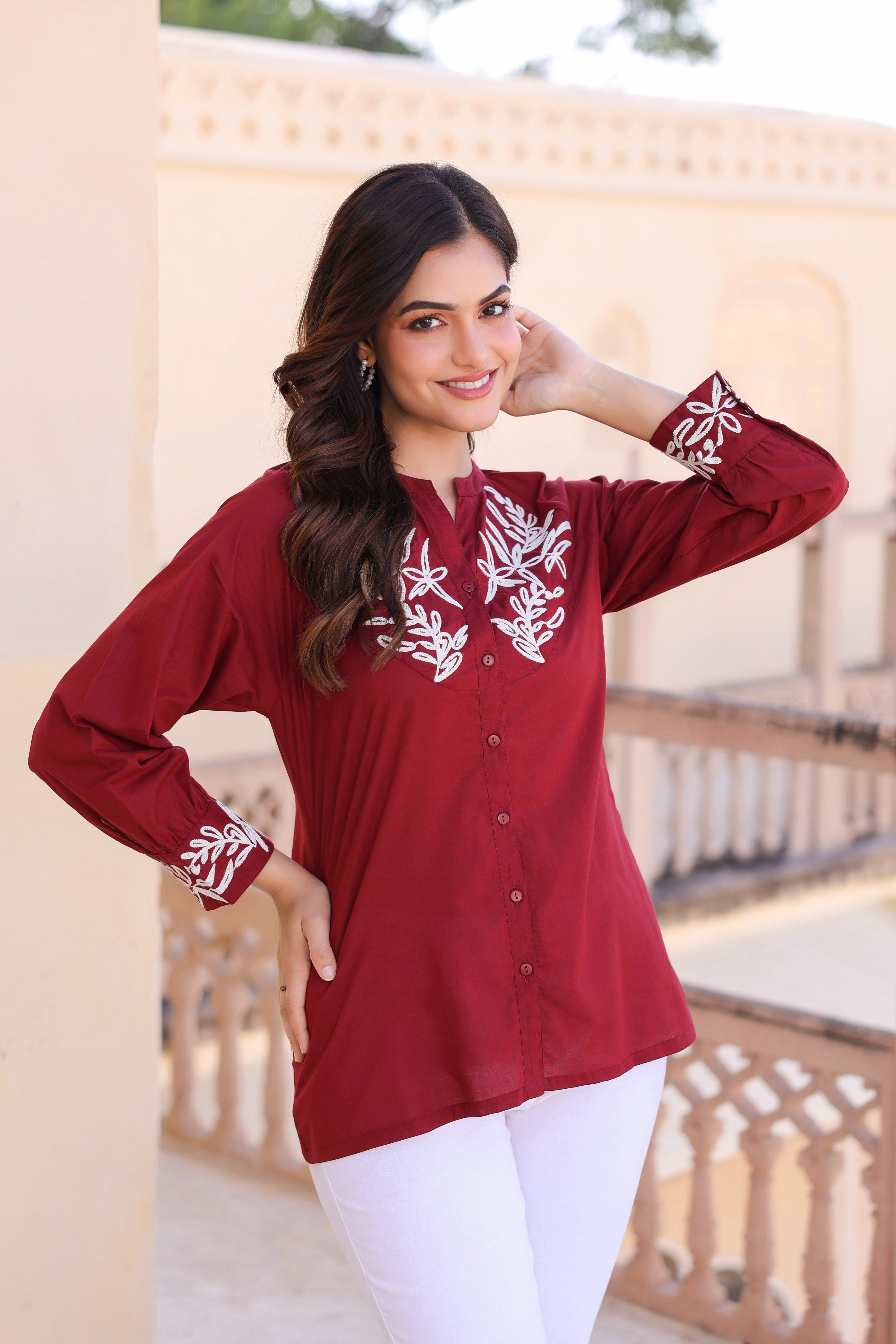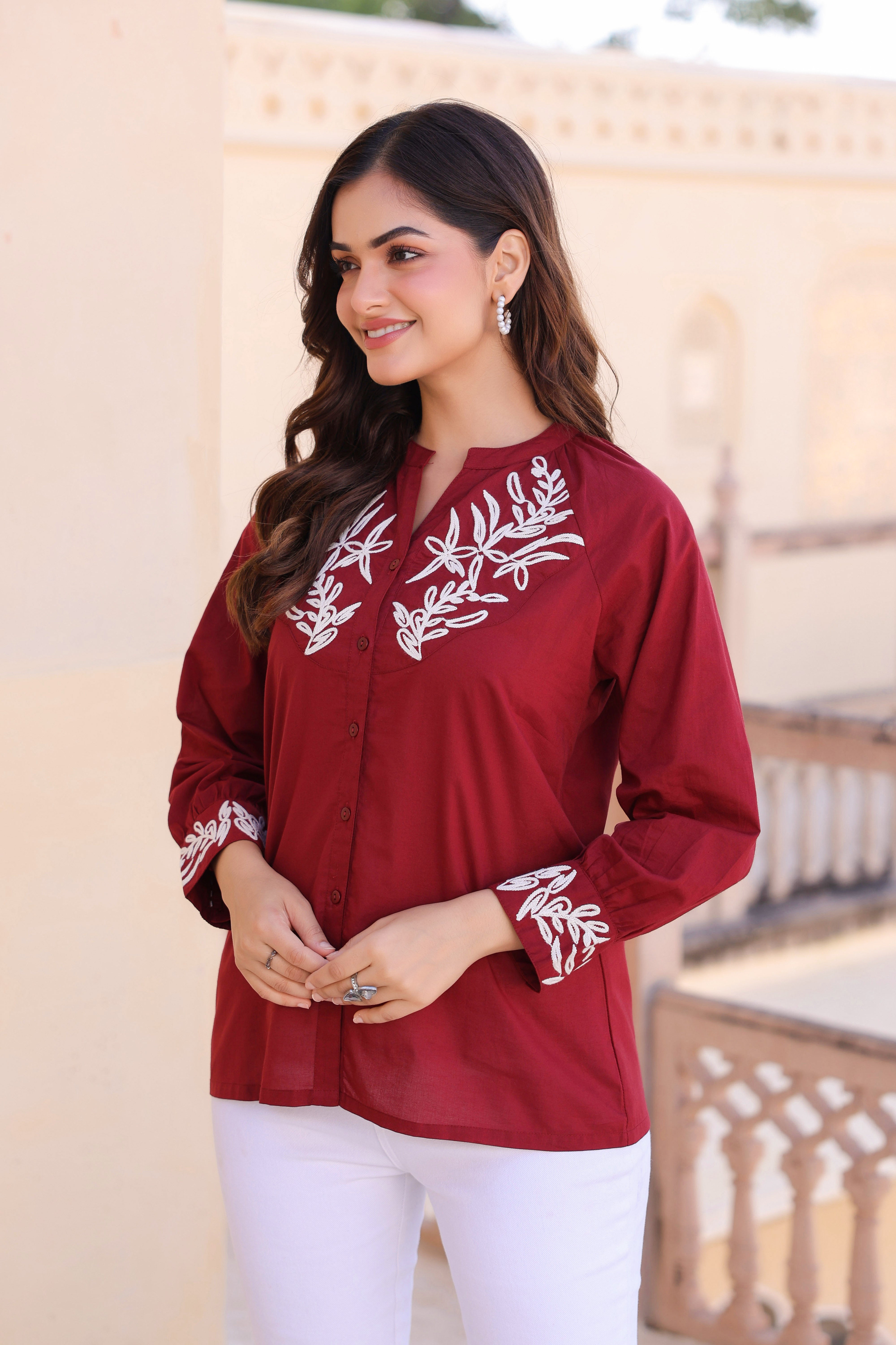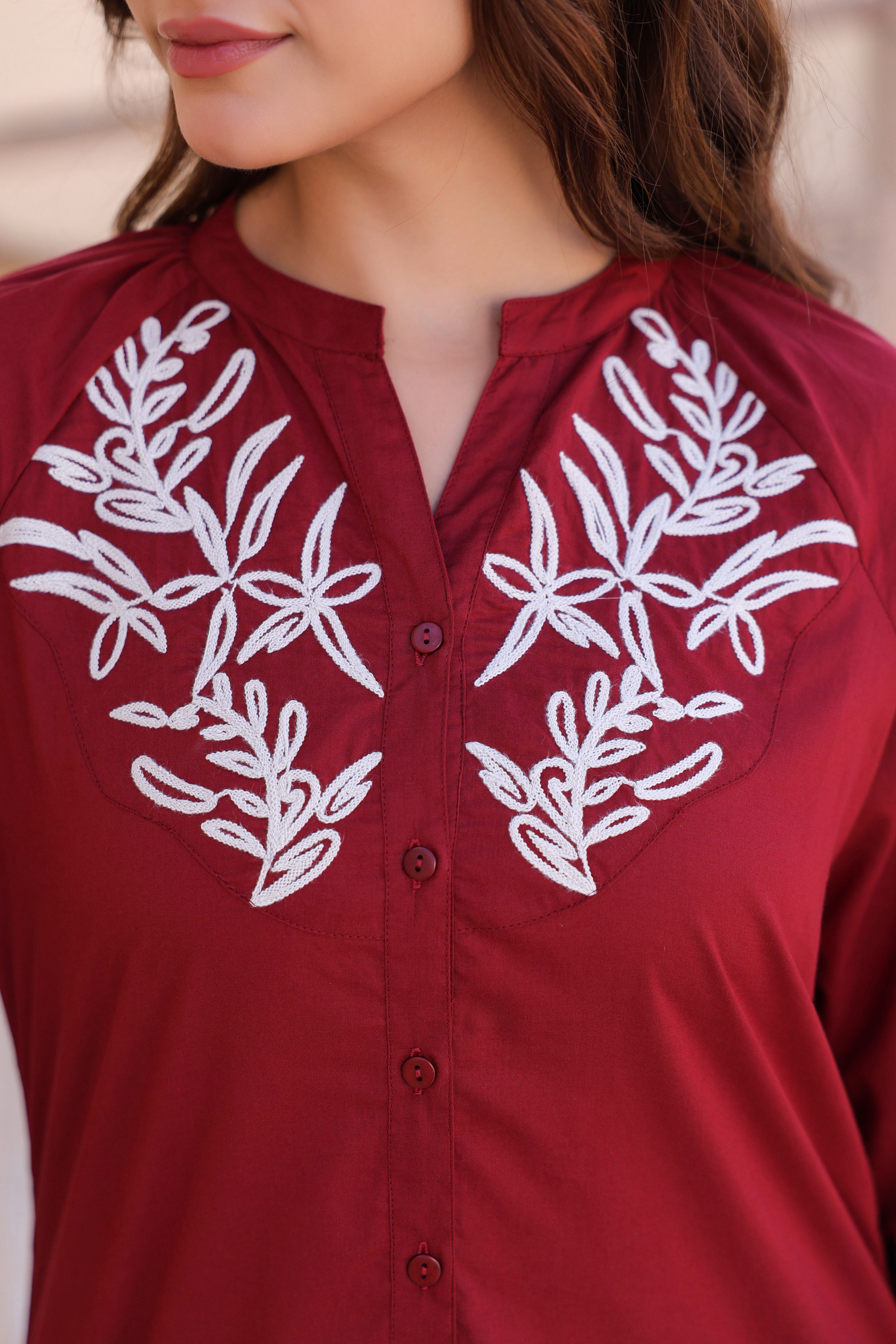This maroon solid shirt features an embroidered yoke and a mandarin collar with a button-down front. It is designed with three-quarter sleeves detailed with embroidered cuffs and offers a comfortable regular fit, making it a stylish yet easy-to-wear choice.
