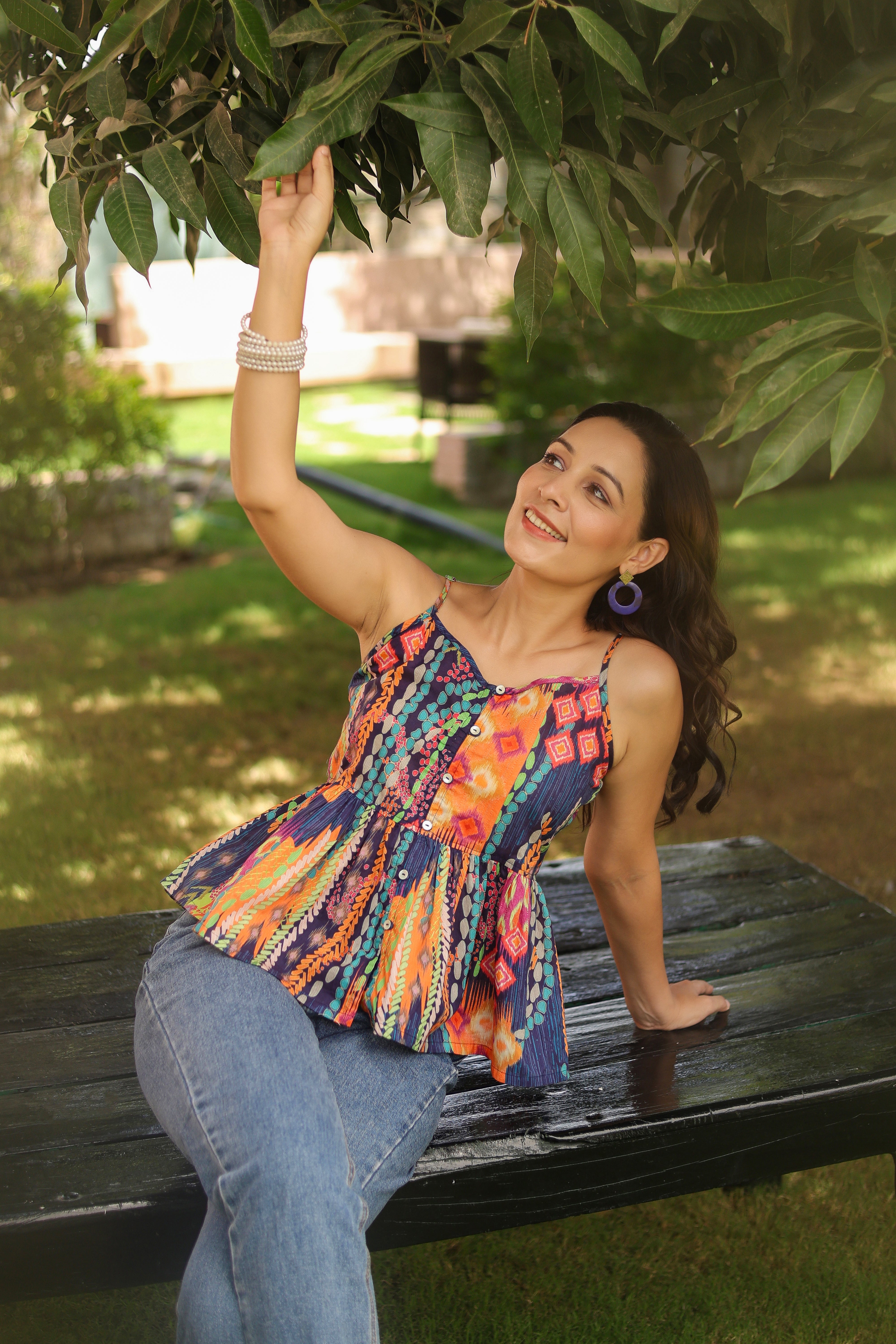 Abstract Printed Shoulder Straps Pure Cotton Peplum Crop Top