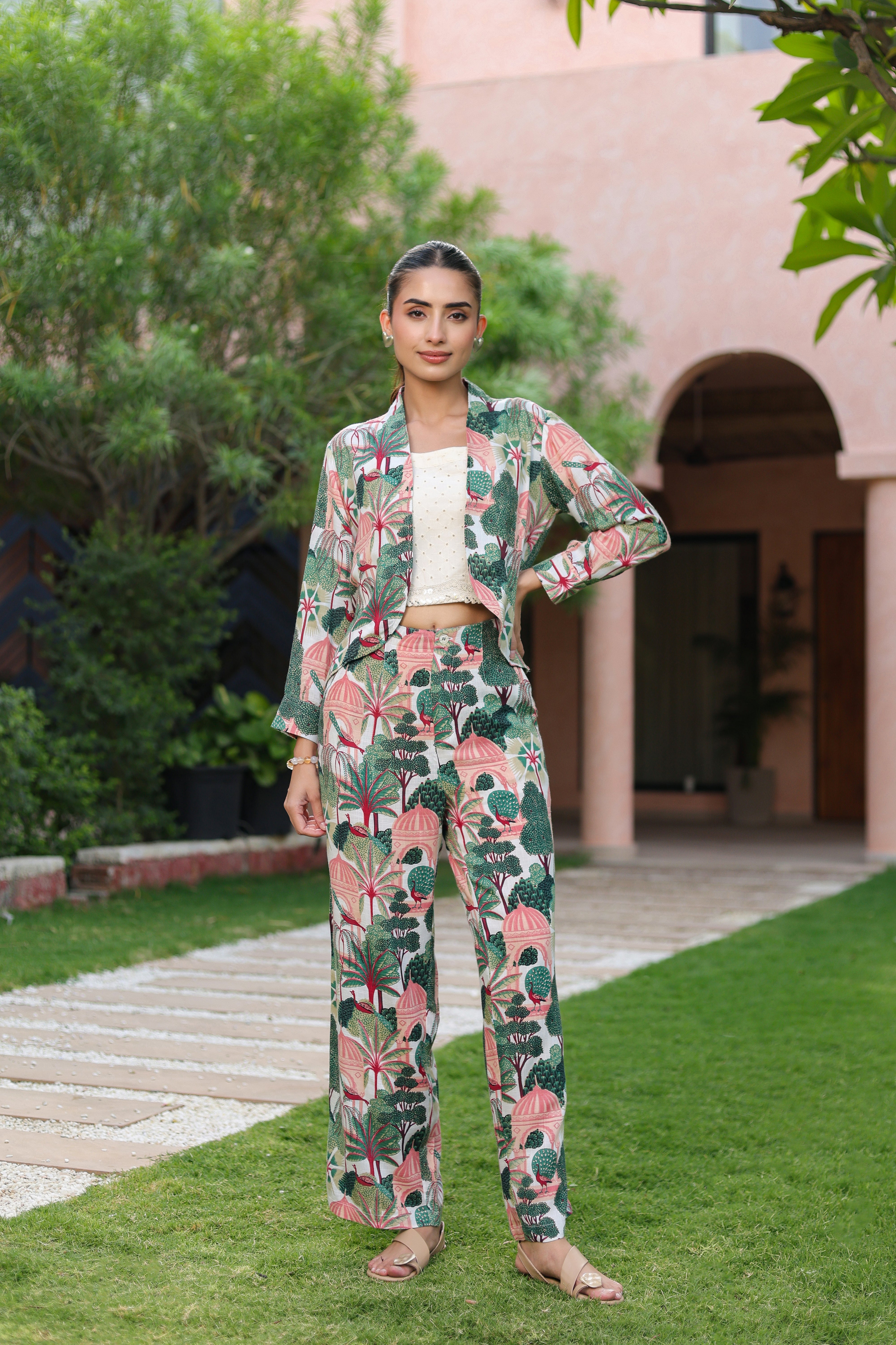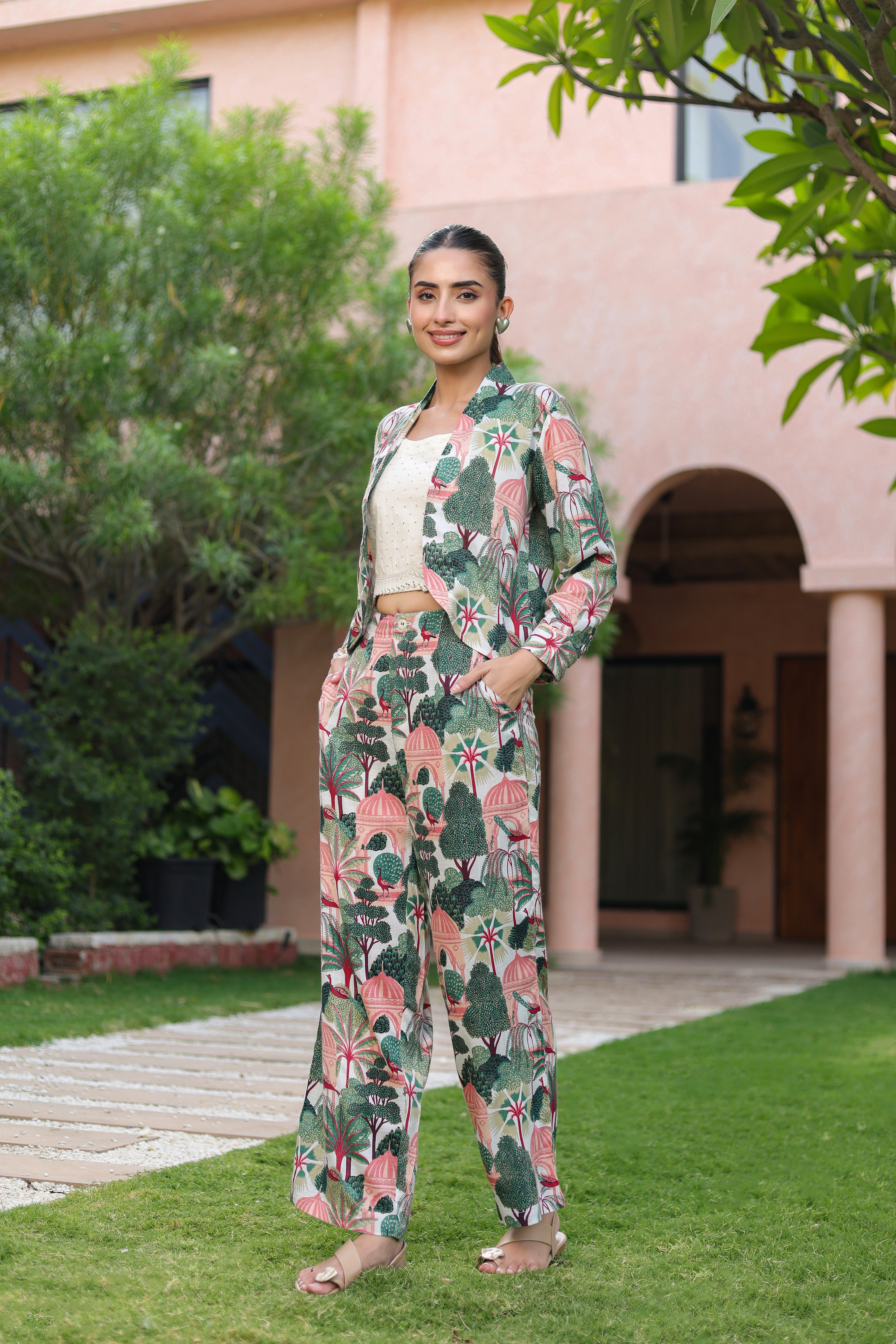 +This green and white tropical printed co-ord set features a stylish combination of a sleeveless cotton inner, a printed jacket, and matching trousers. The schiffli inner is detailed with delicate lace accents, adding a soft feminine touch. The waist-length jacket comes with full sleeves and a vibrant tropical print for a layered, contemporary look. Completing the set are mid-rise tropical printed trousers designed with a slip-on closure, a half-elasticated waistband, and two functional pockets for everyday comfort and ease.