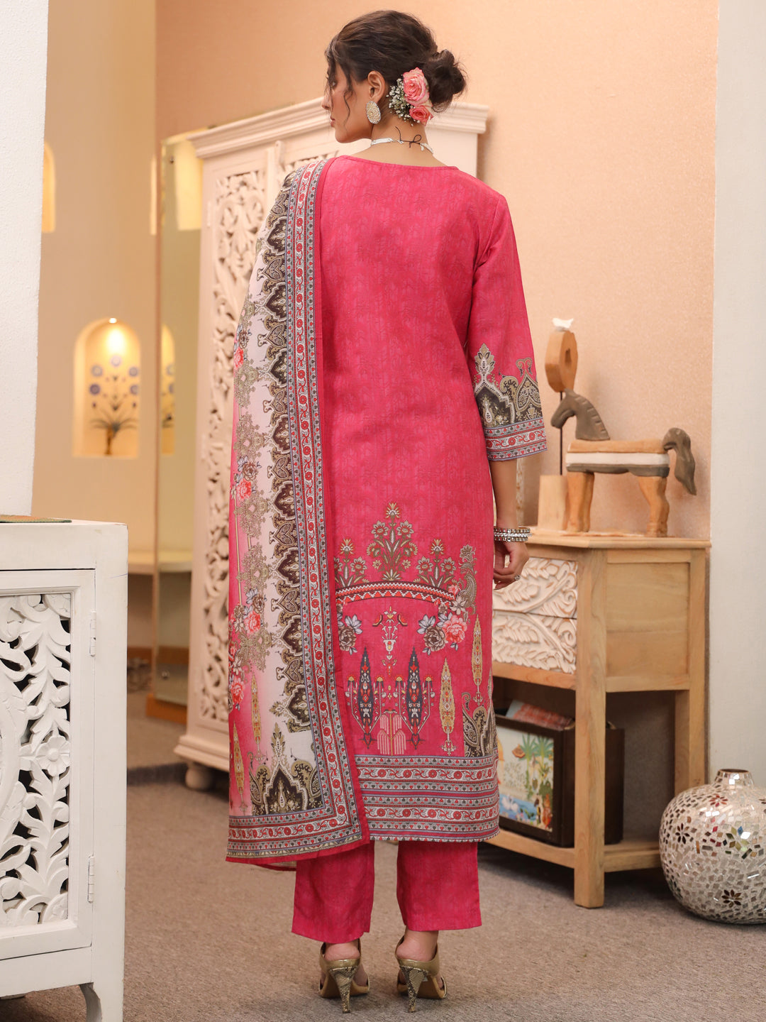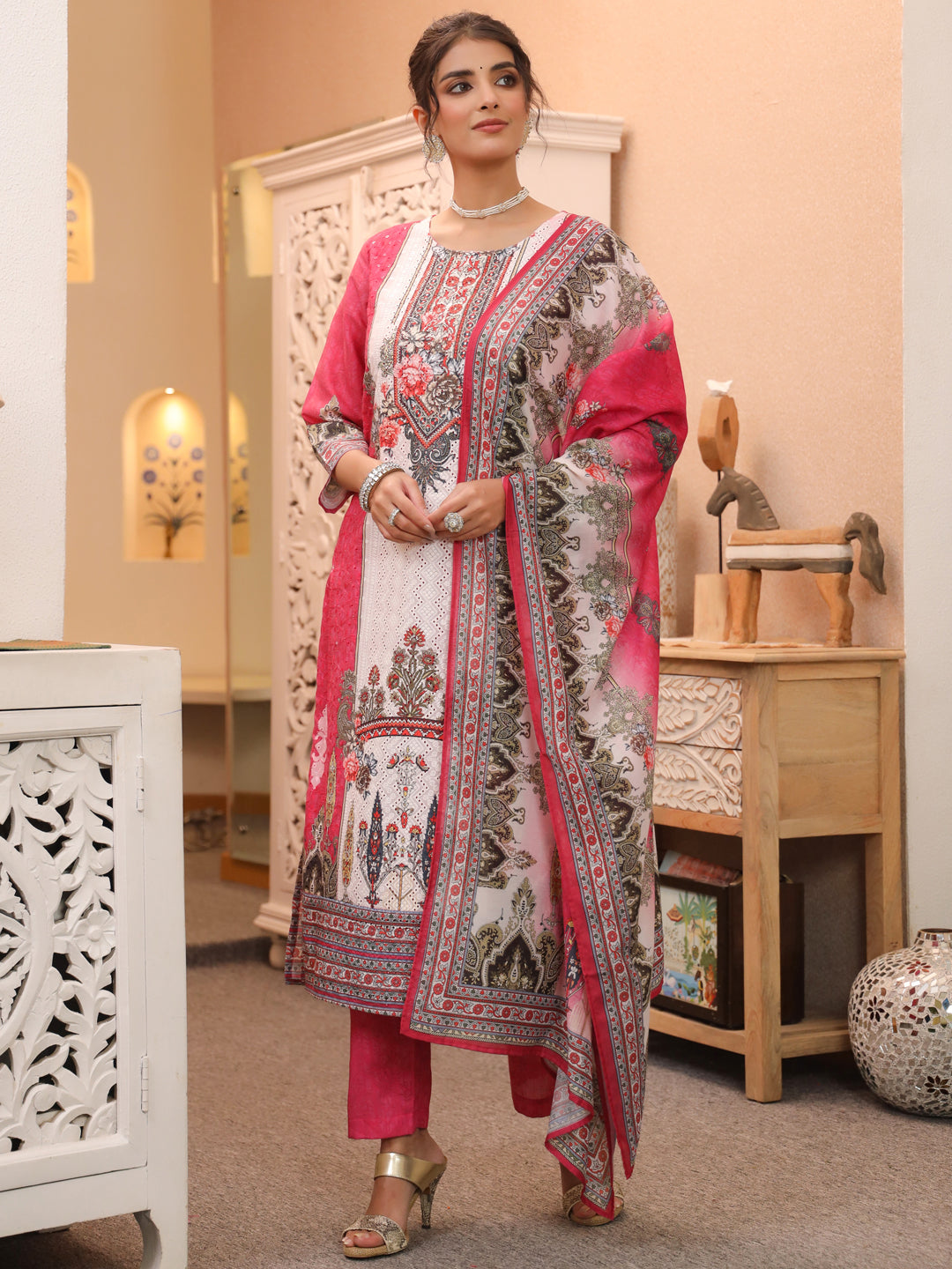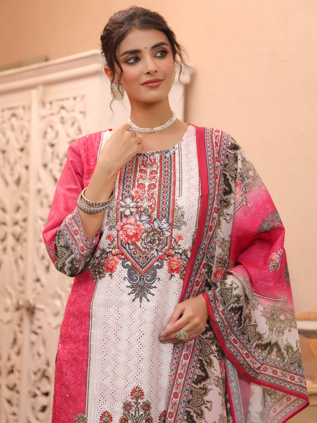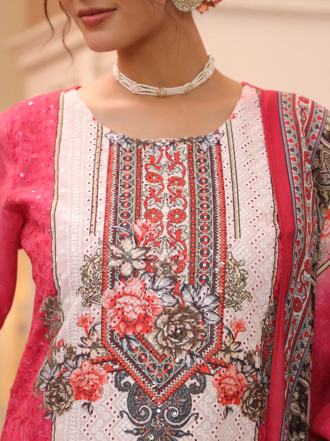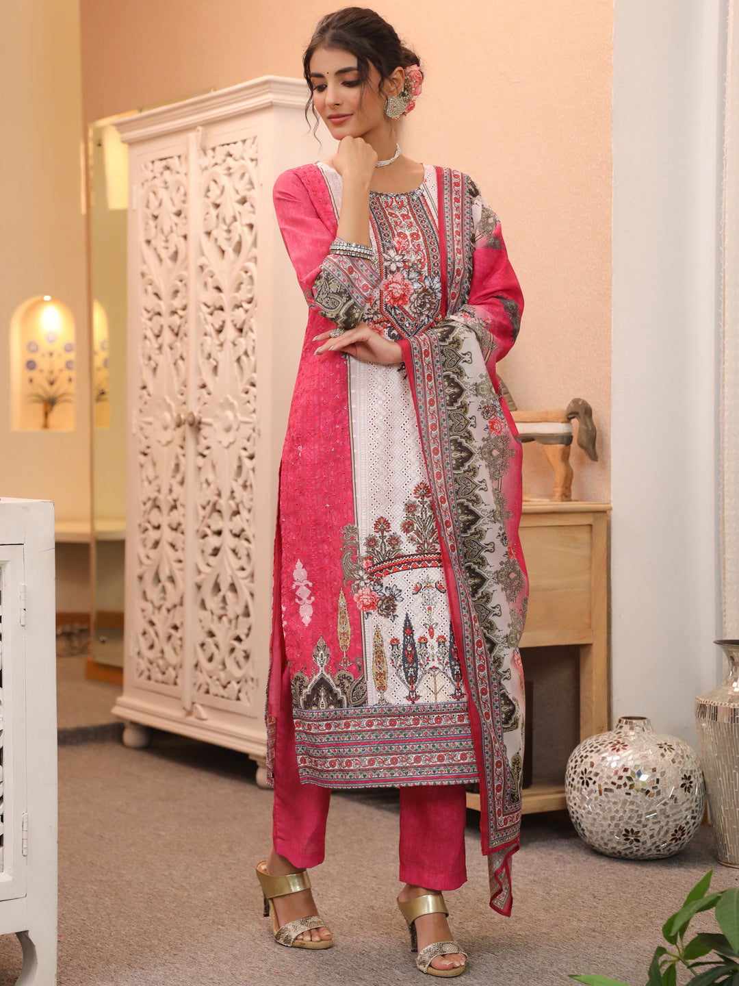 +A pink and white straight-fit kurta set featuring ethnic motif prints, a round neckline with sequin detailing, and schiffli-inspired panel prints. It includes solid mid-rise trousers with a slip-on closure and a matching printed cotton dupatta.