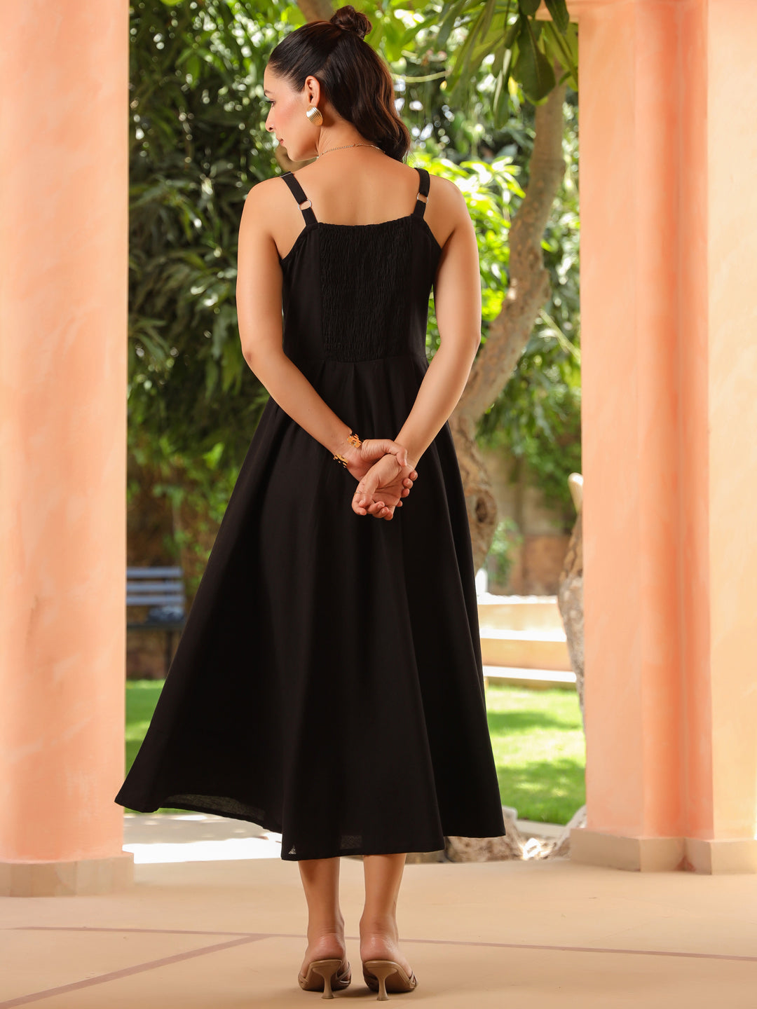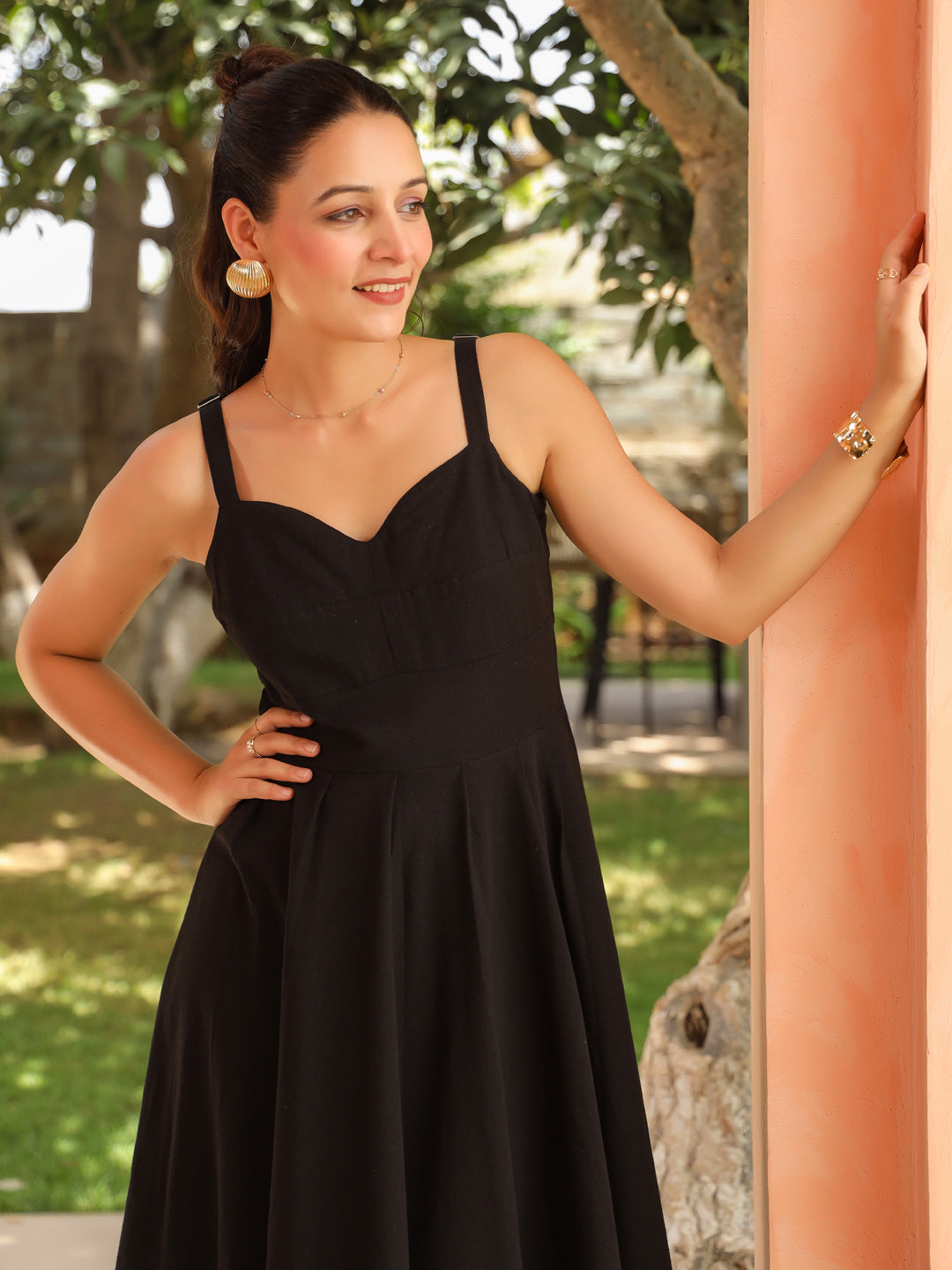 +This lovely solid black dress features a casual sleeveless design with a sweetheart neckline and adjustable straps. The fit-and-flare A-line silhouette adds a flattering, feminine touch perfect for everyday outings.