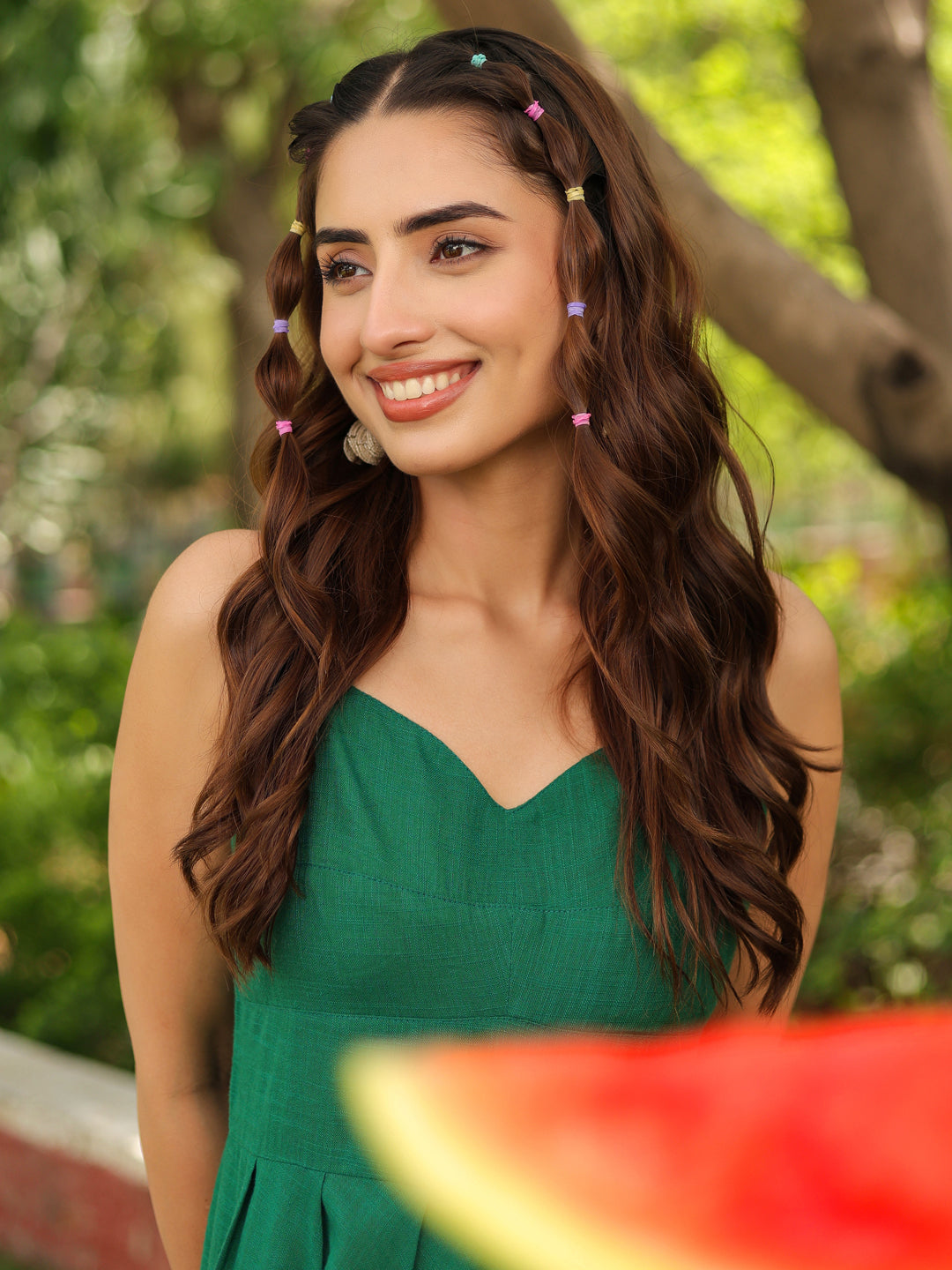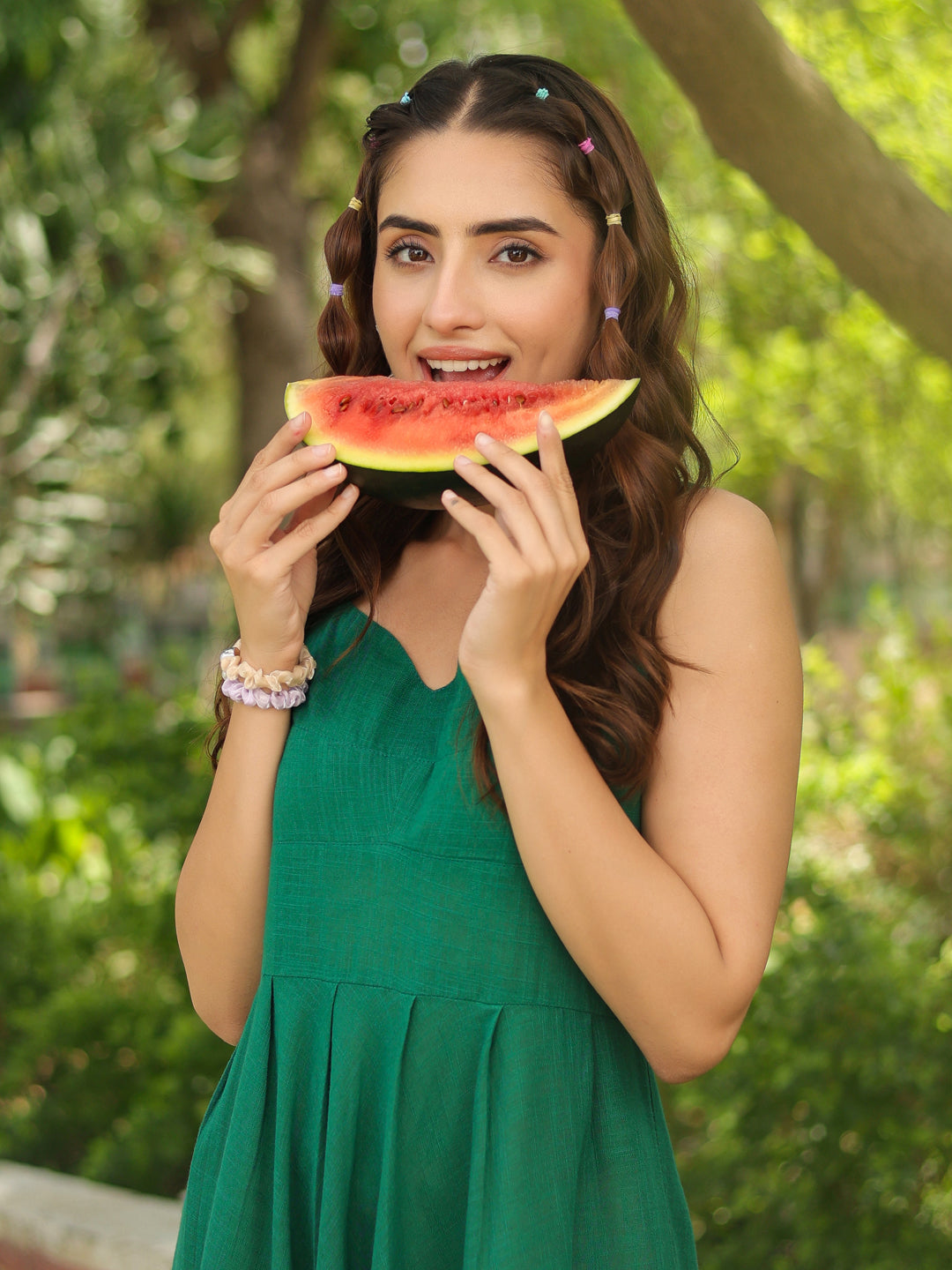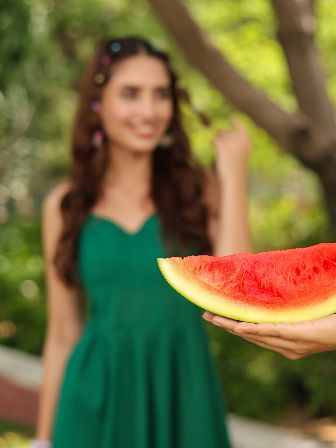 +This lovely solid bottle green dress features a casual sleeveless design with a sweetheart neckline and adjustable straps. The fit-and-flare A-line silhouette adds a flattering, feminine touch perfect for everyday outings.