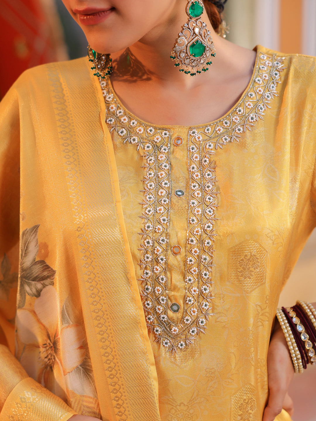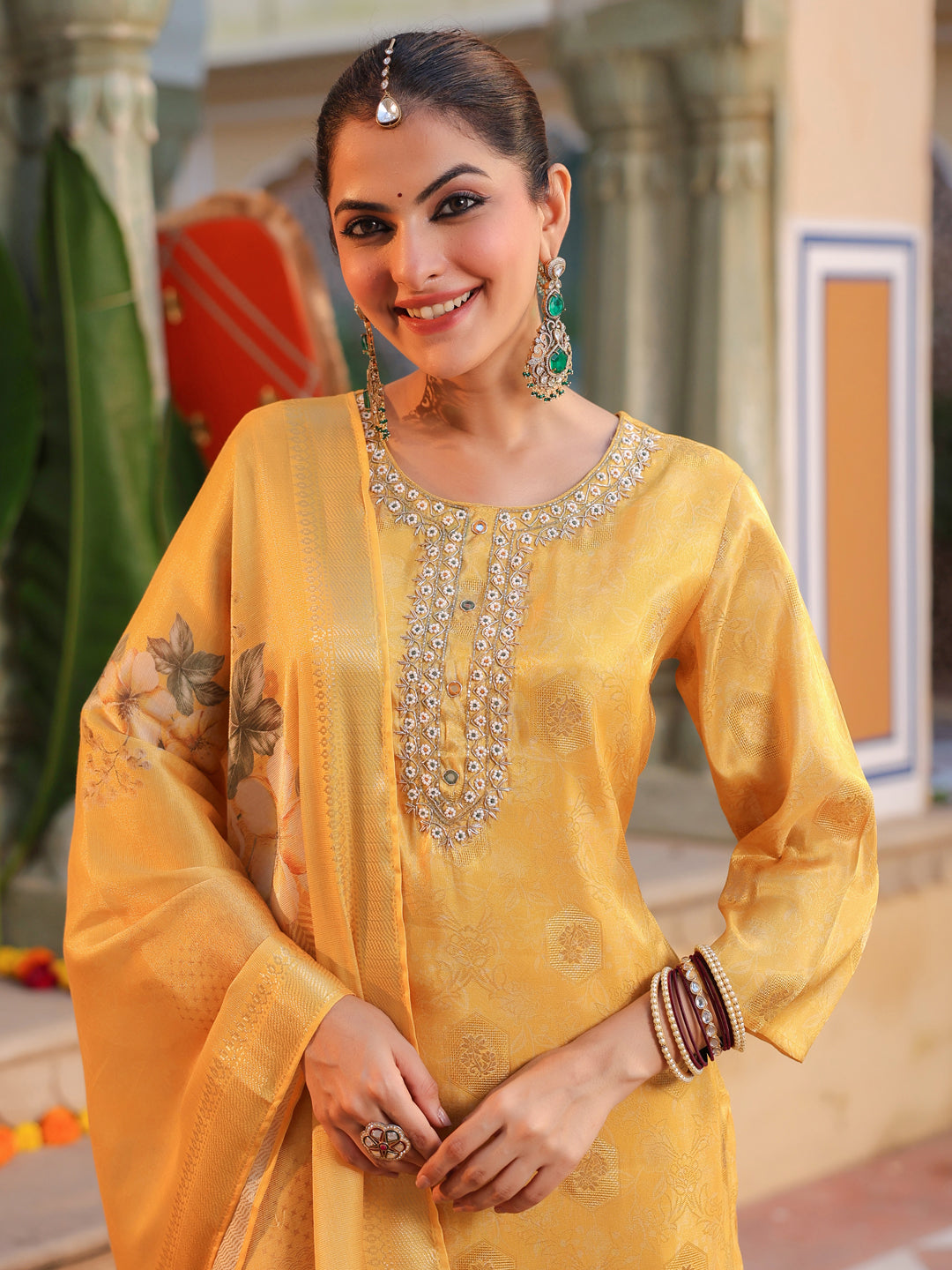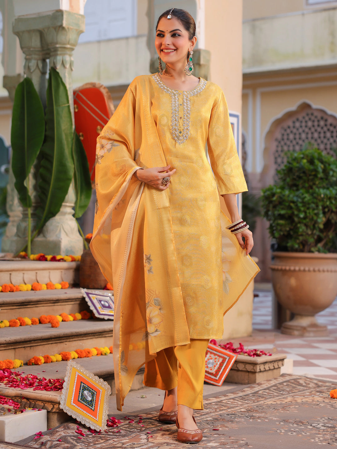 +This elegant yellow embroidered straight kurta set features a round neck with detailed bead work, three-quarter sleeves, and a rich jacquard weave for a refined look. It comes with solid mid-rise trousers designed with a comfortable slip-on closure, and a printed yellow muslin dupatta that adds a soft, graceful touch. Perfect for festive and semi-formal occasions.