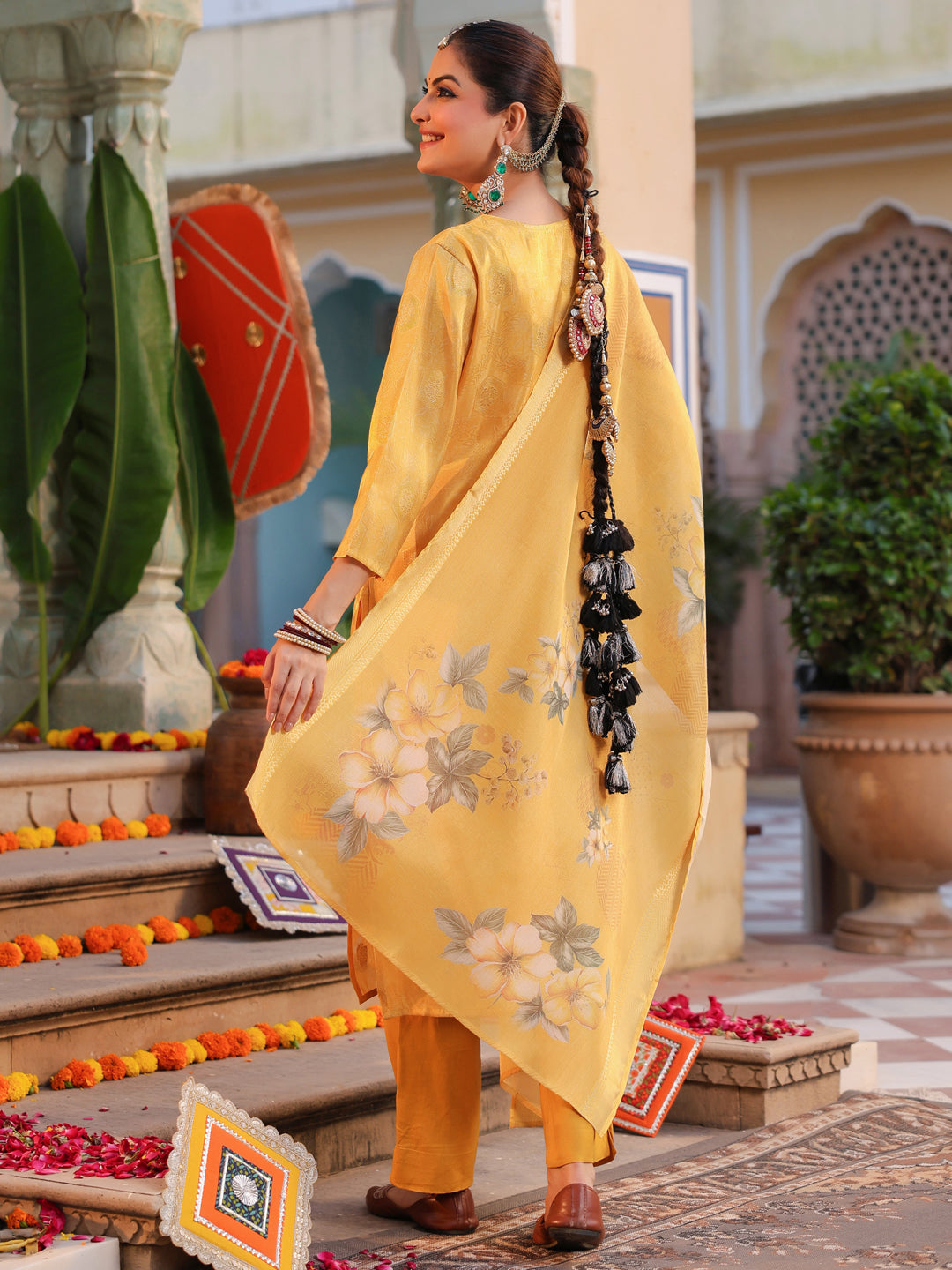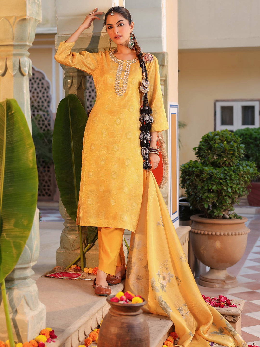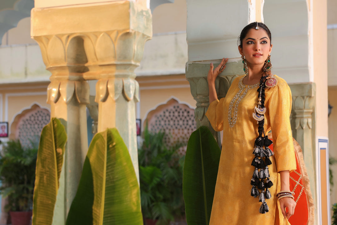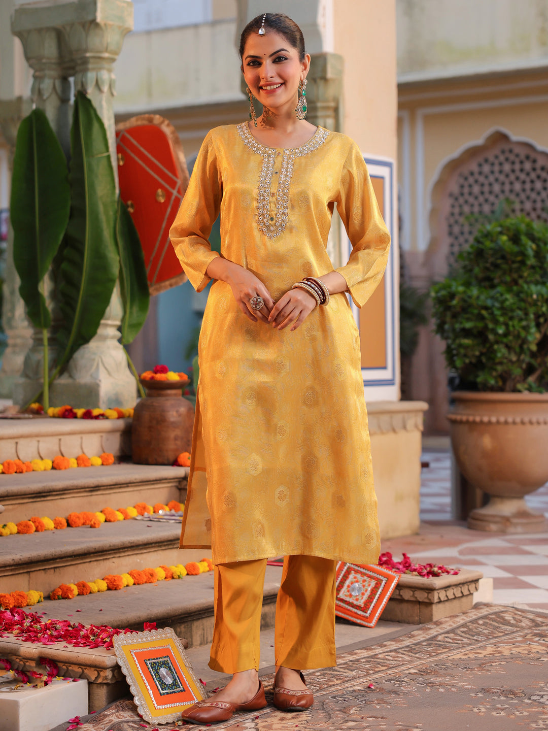 +This elegant yellow embroidered straight kurta set features a round neck with detailed bead work, three-quarter sleeves, and a rich jacquard weave for a refined look. It comes with solid mid-rise trousers designed with a comfortable slip-on closure, and a printed yellow muslin dupatta that adds a soft, graceful touch. Perfect for festive and semi-formal occasions.