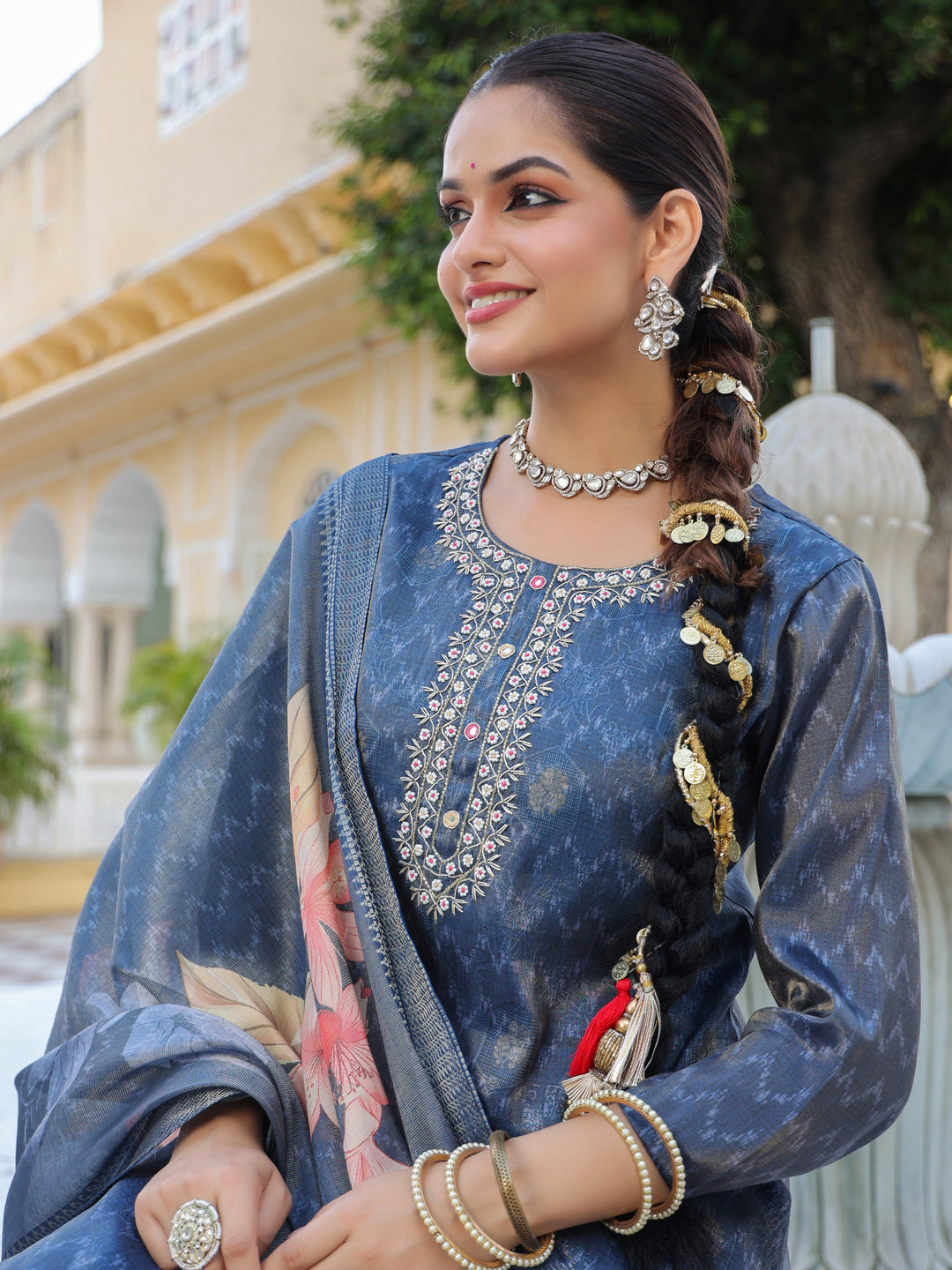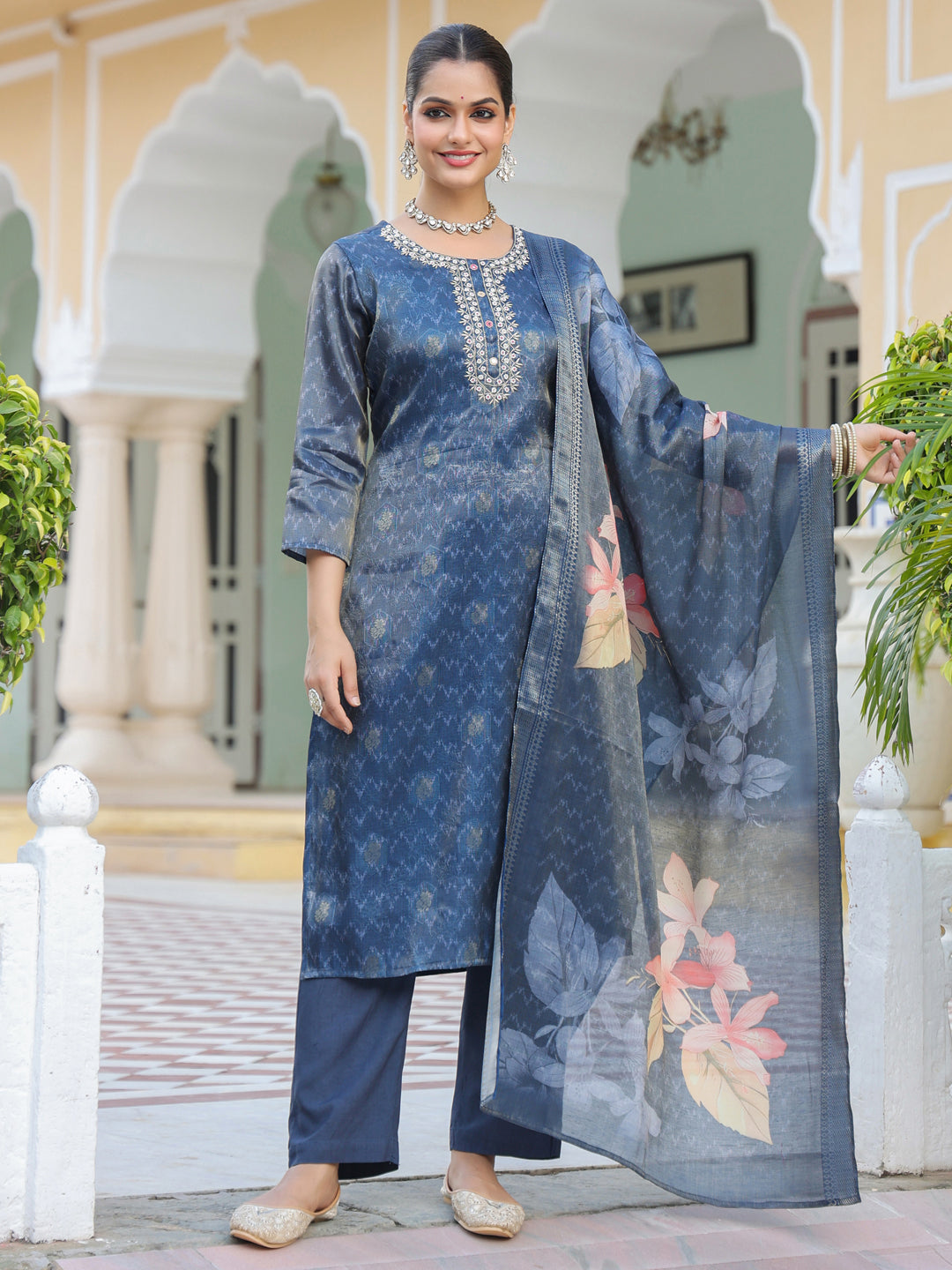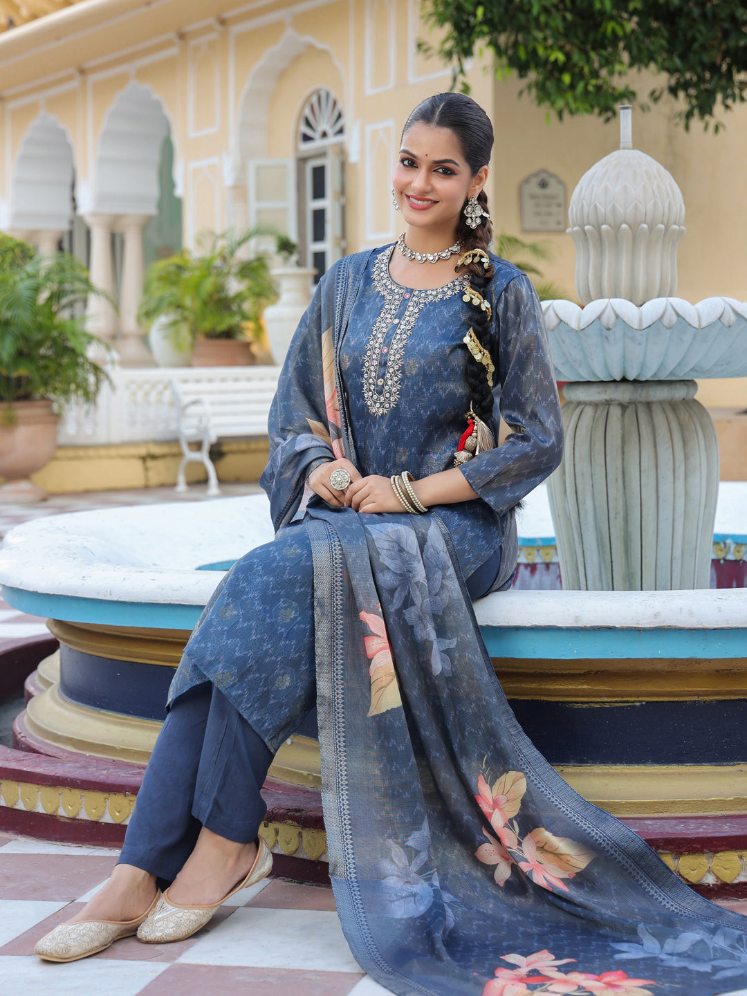 Women Floral Printed Regular Thread Work Pure Cotton Kurta with Trousers & With Dupatta