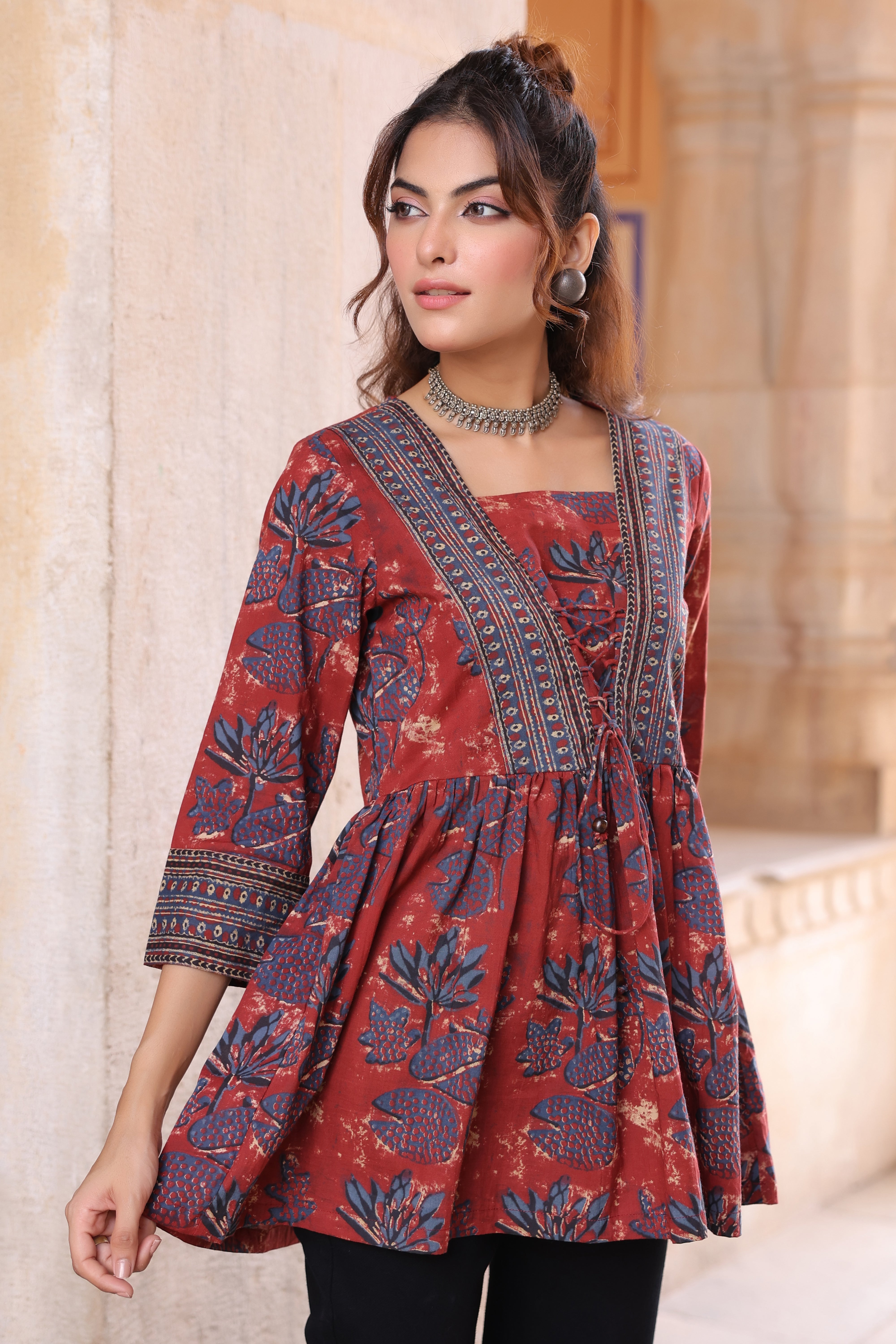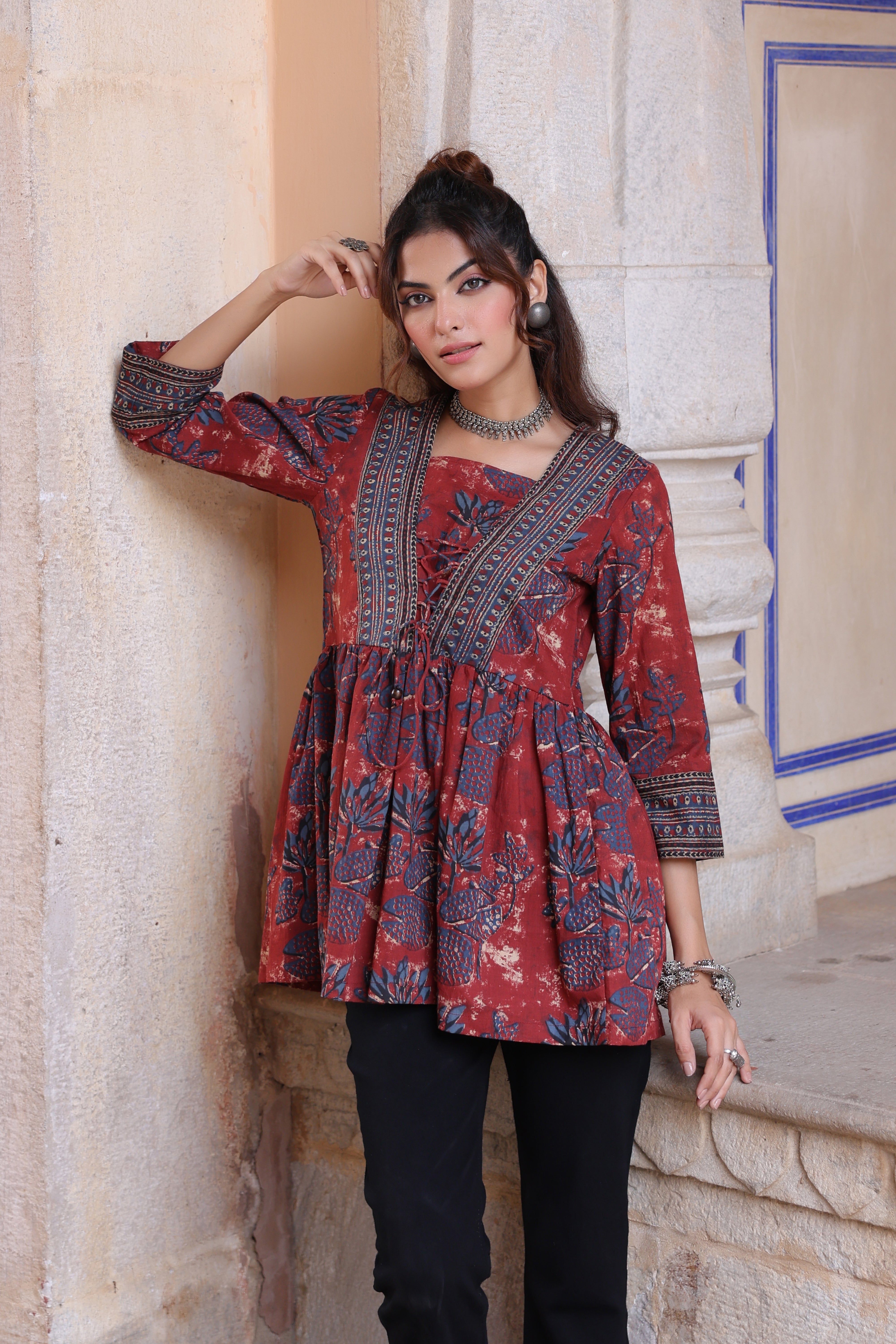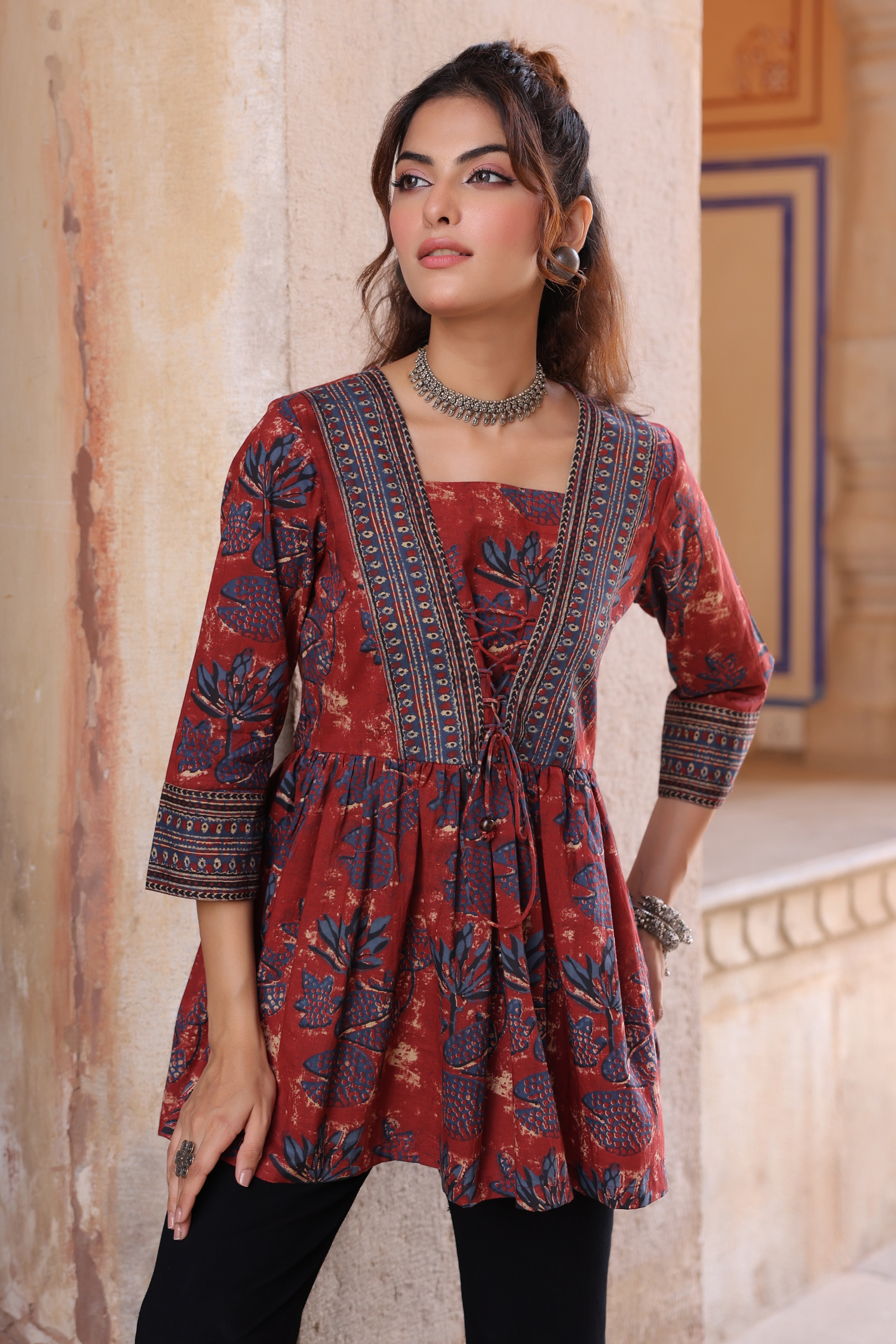 This maroon floral printed top features a flattering square neckline with dori tie-up detailing. Designed with three-quarter sleeves, it has a fit-and-flare silhouette that offers a comfortable and stylish look.