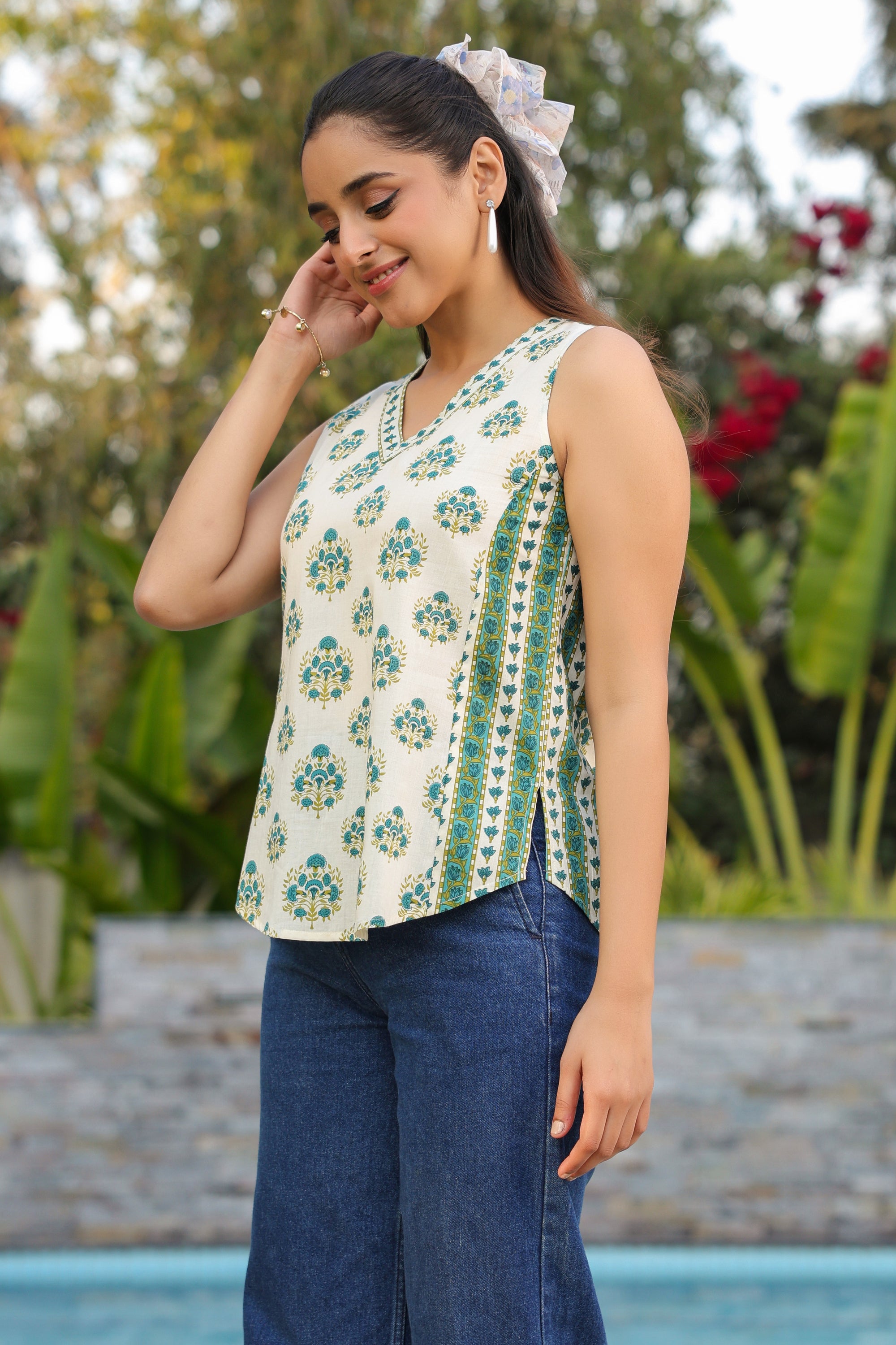 Green and beige ethnic motif printed A-line top featuring a sleeveless V-neck design with border detailing at the sides.