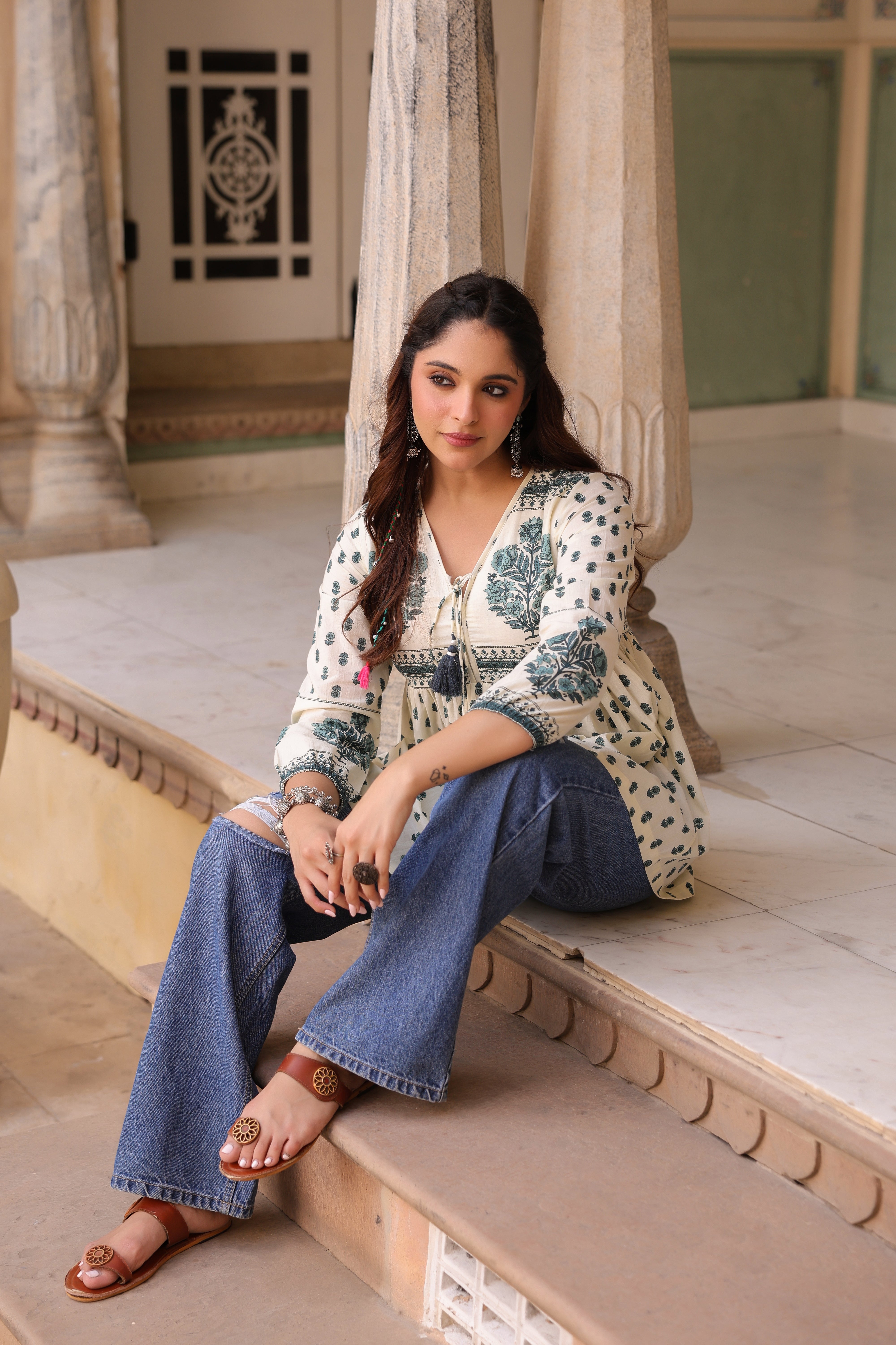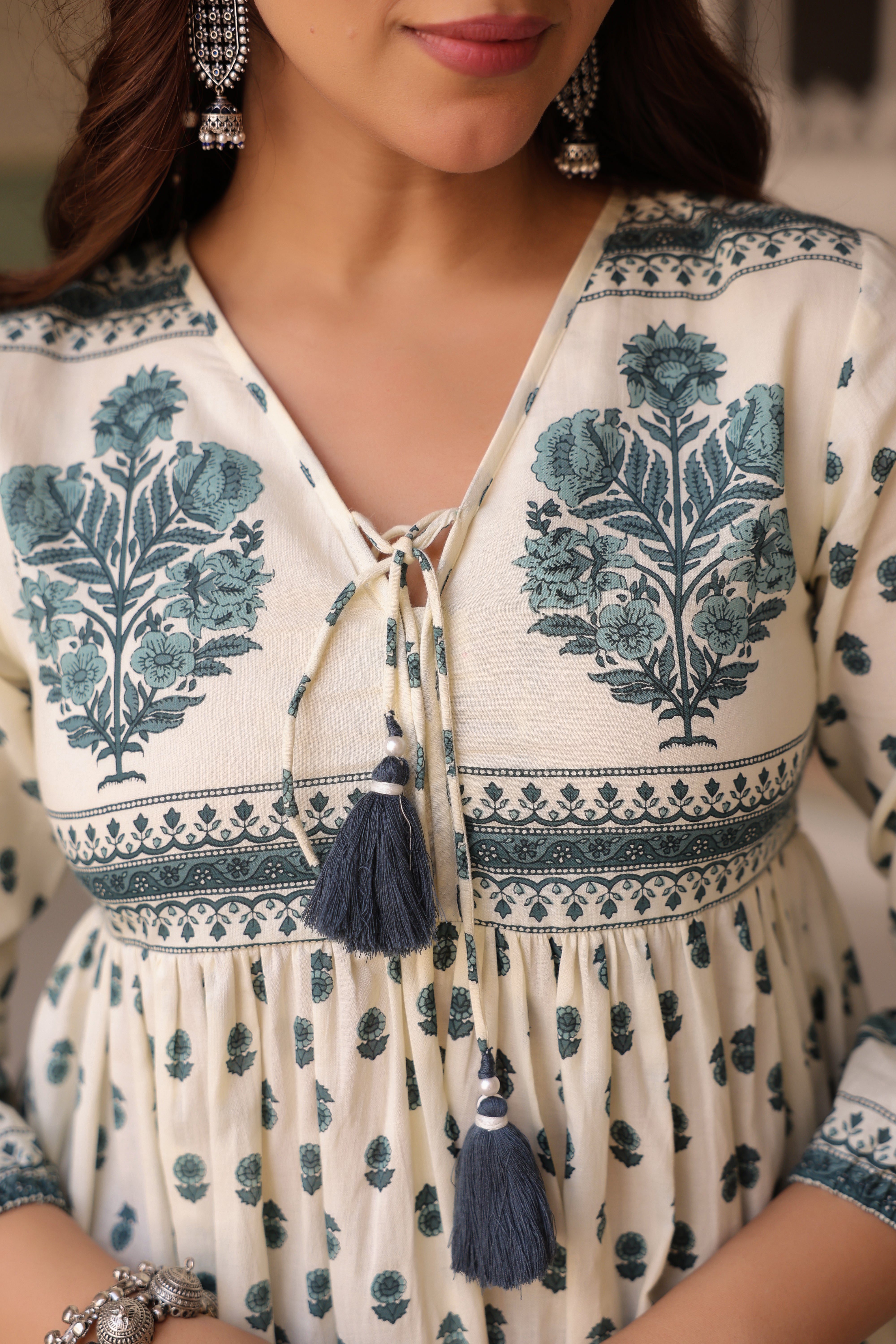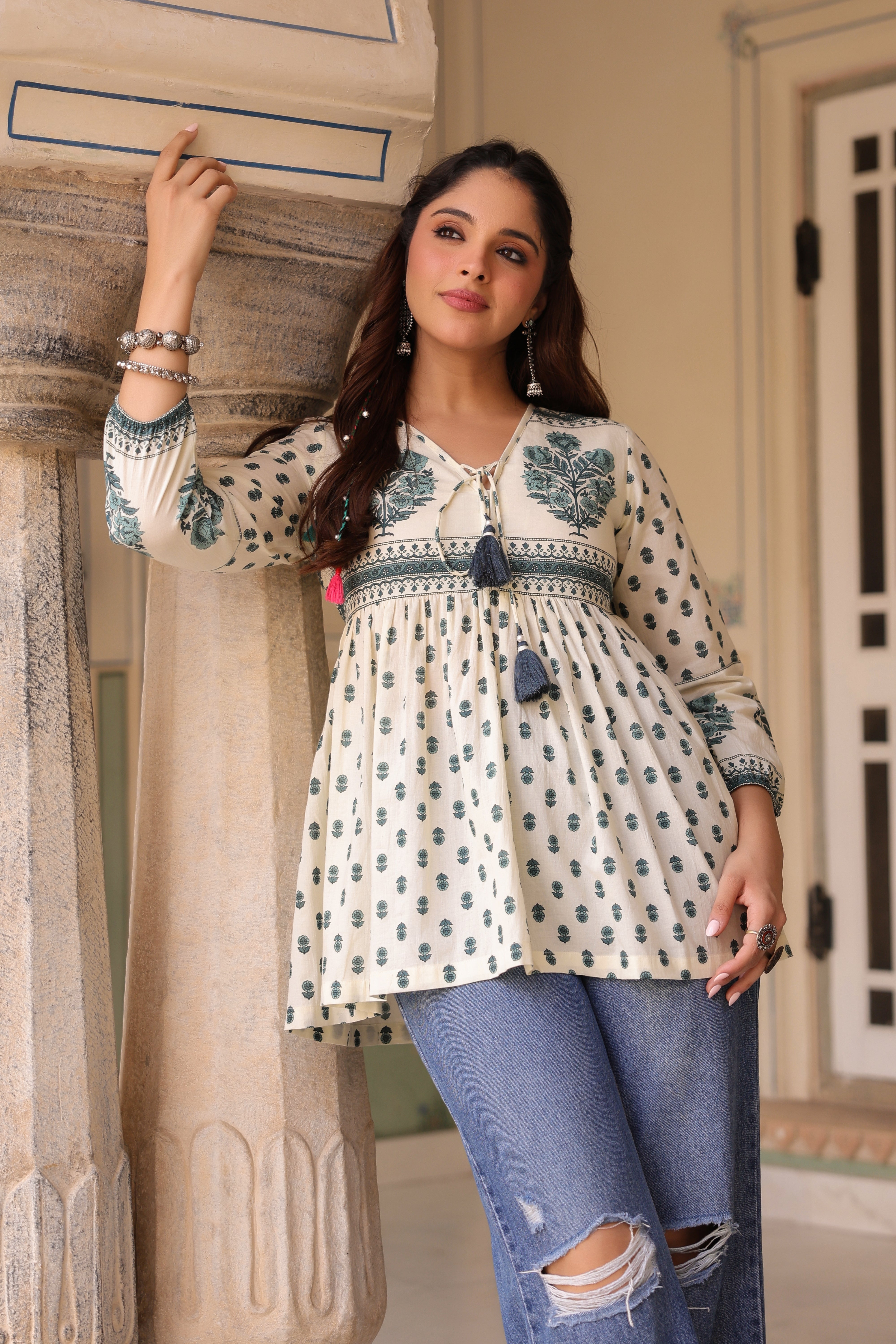 Green and white ethnic motif printed top featuring a V-neckline with dori tie-up detail, three-quarter puff sleeves, and a flattering fit-and-flare A-line silhouette.