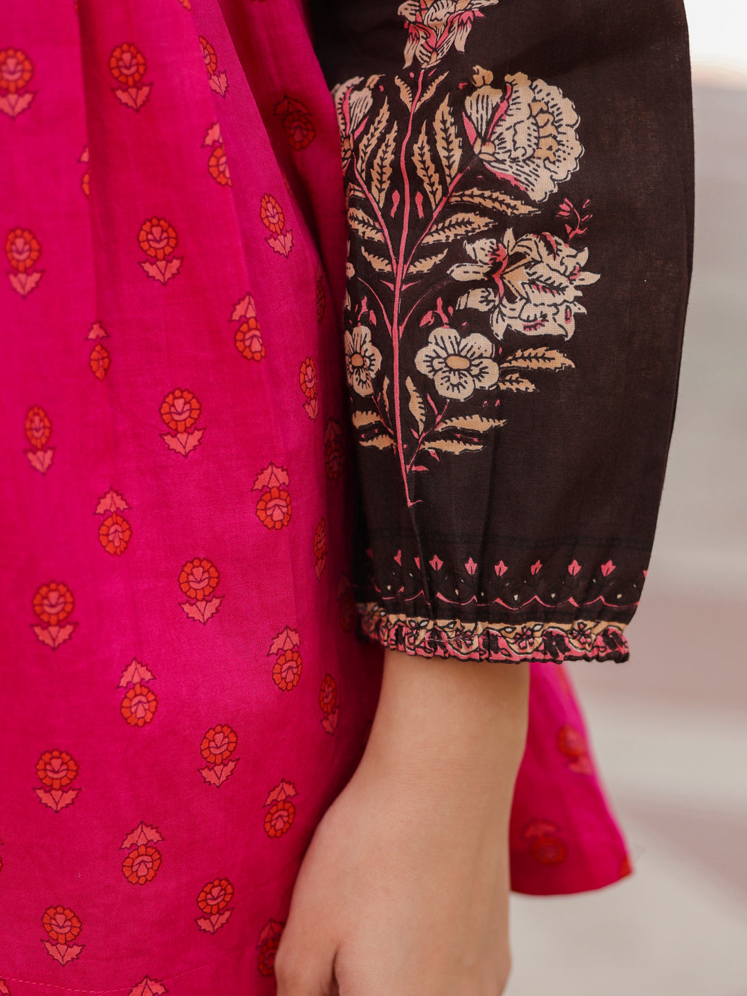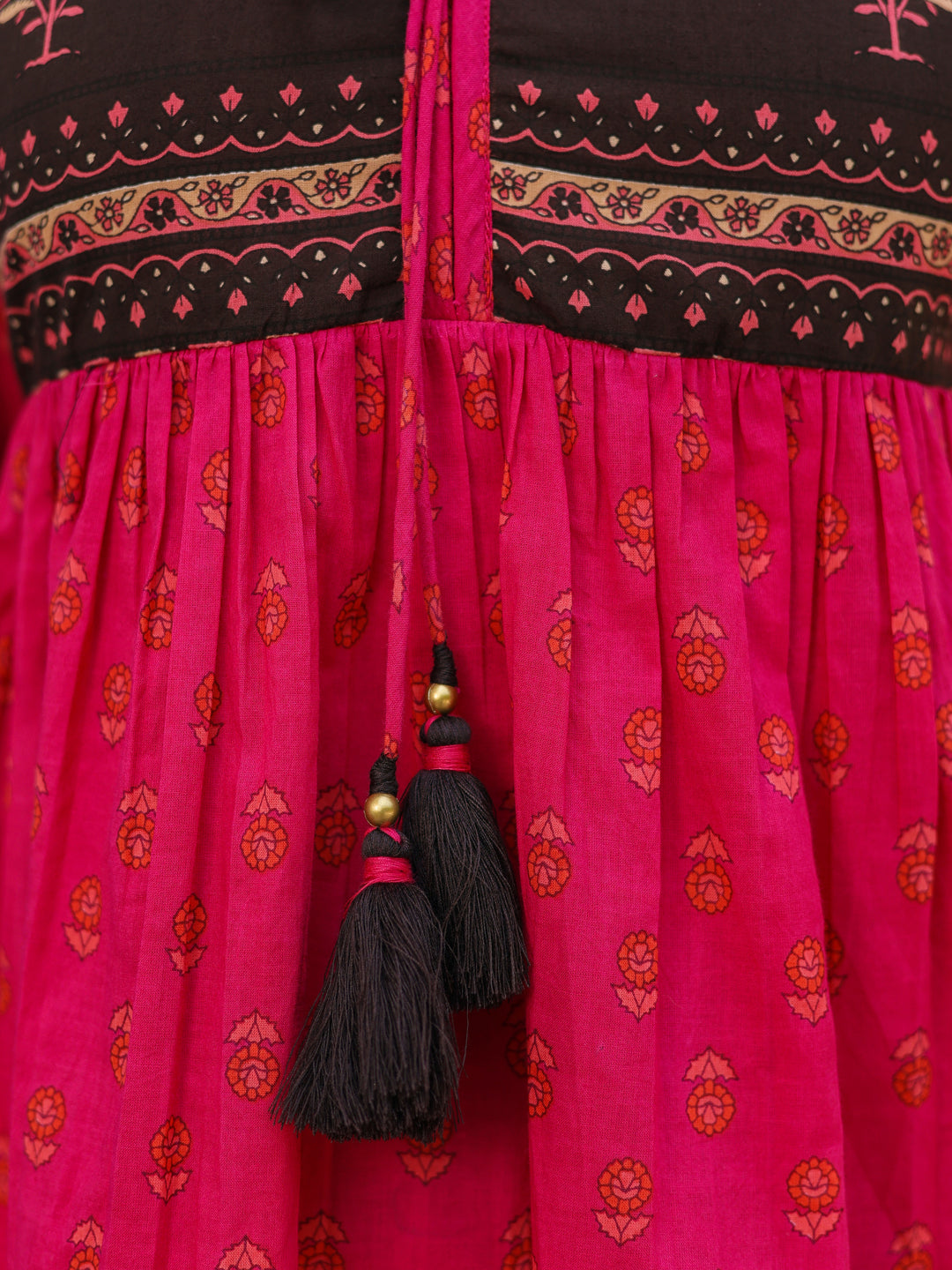 +Fuchsia and brown ethnic motif printed top featuring a V-neckline with dori tie-up detail, three-quarter puff sleeves, and a flattering fit-and-flare A-line silhouette.