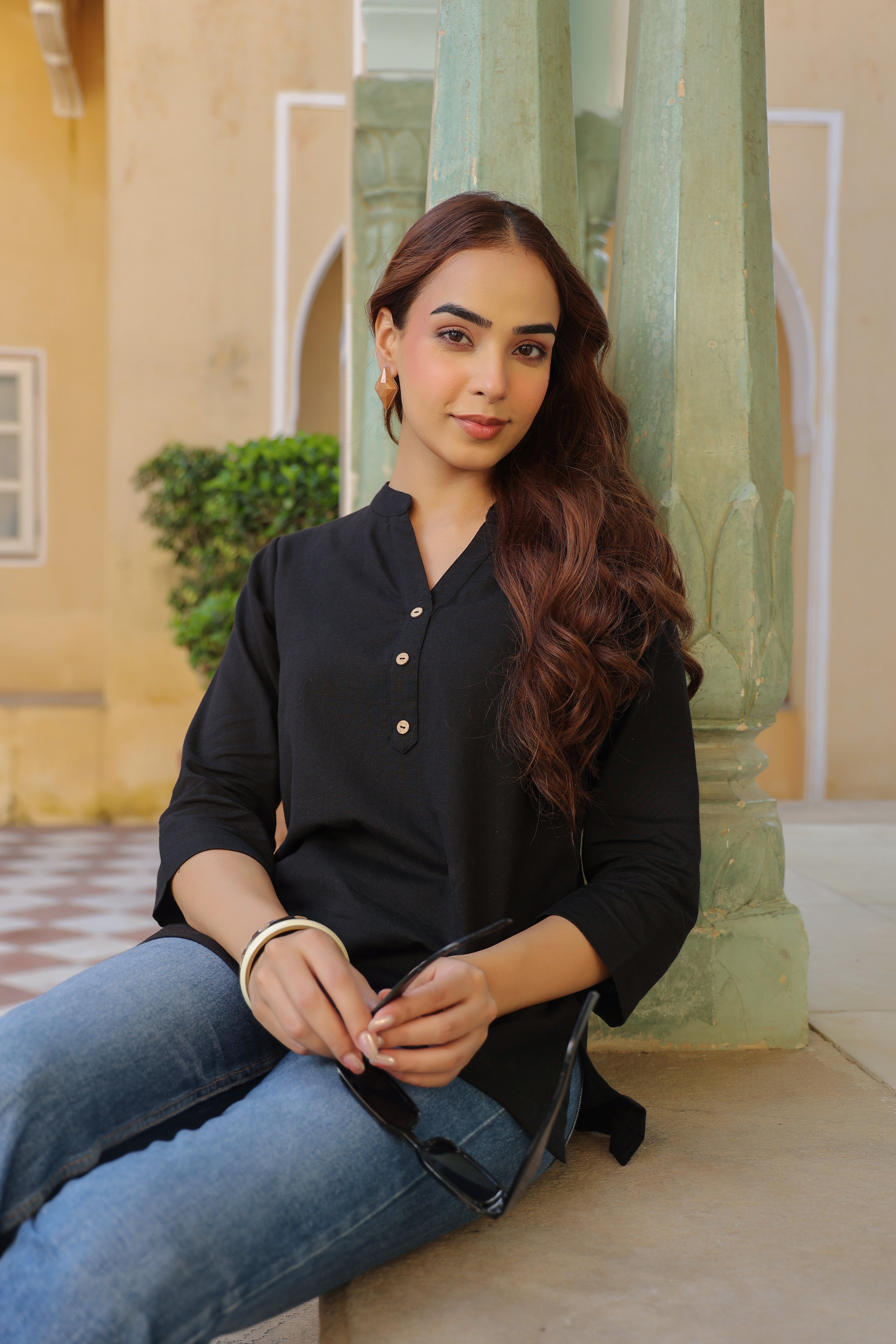 Keep it effortlessly chic with this black solid top, designed with a mandarin collar and button detailing for a touch of sophistication. Featuring three-quarter sleeves and a relaxed fit, this versatile piece offers both comfort and style
