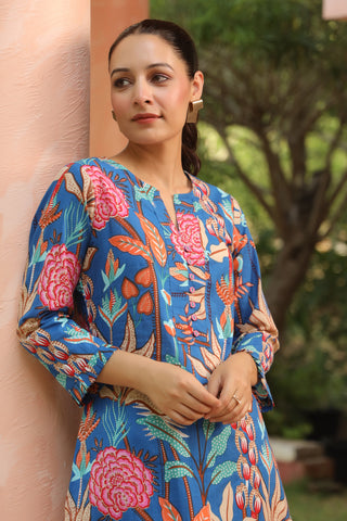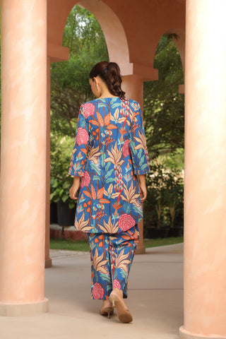 +This is a blue tropical printed cord set, round neck tunic with button detail, three quarter sleeves with ruffle detail, relaxed fit tunic, blue tropical printed mid rise trouser with pockets and slip on closure.