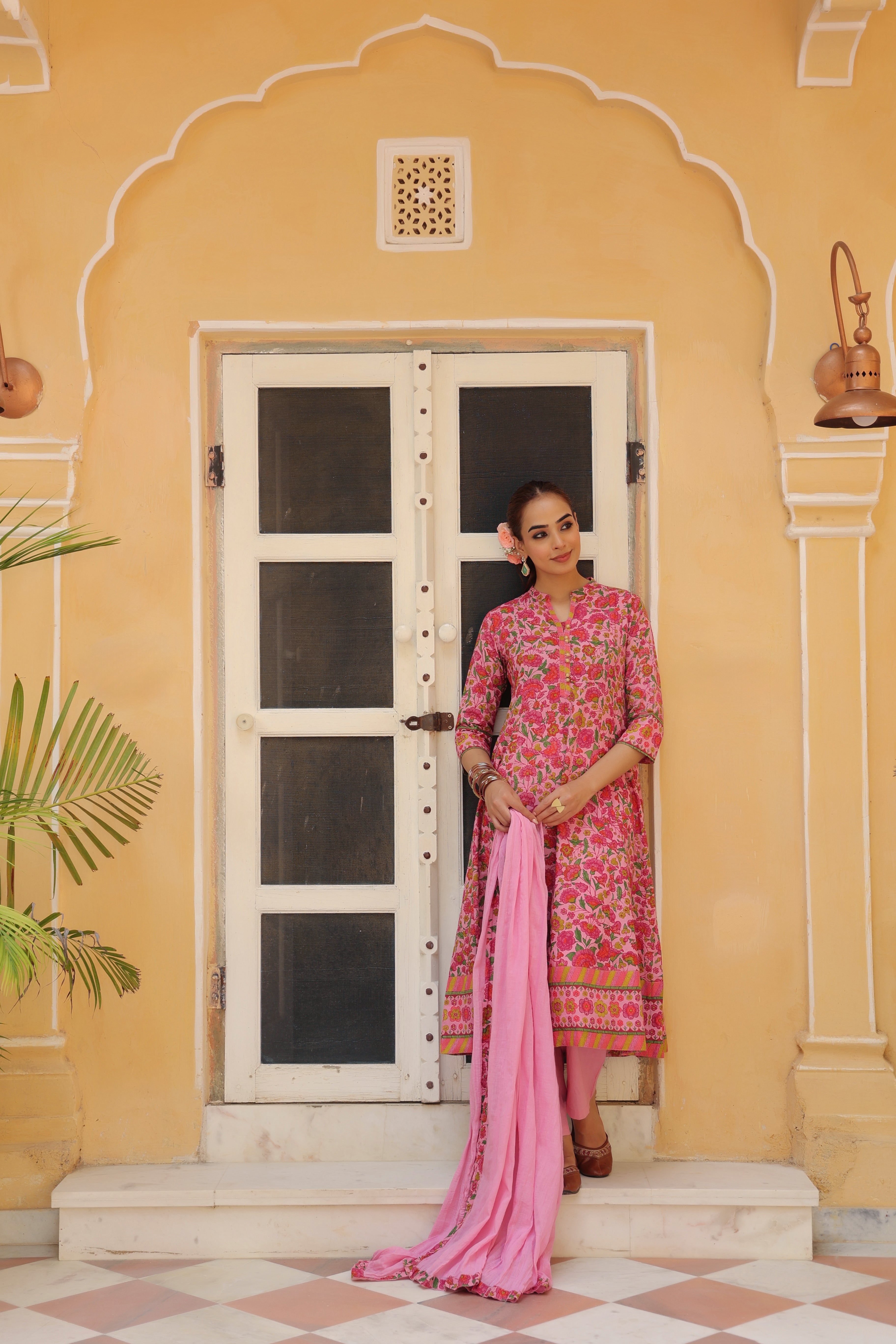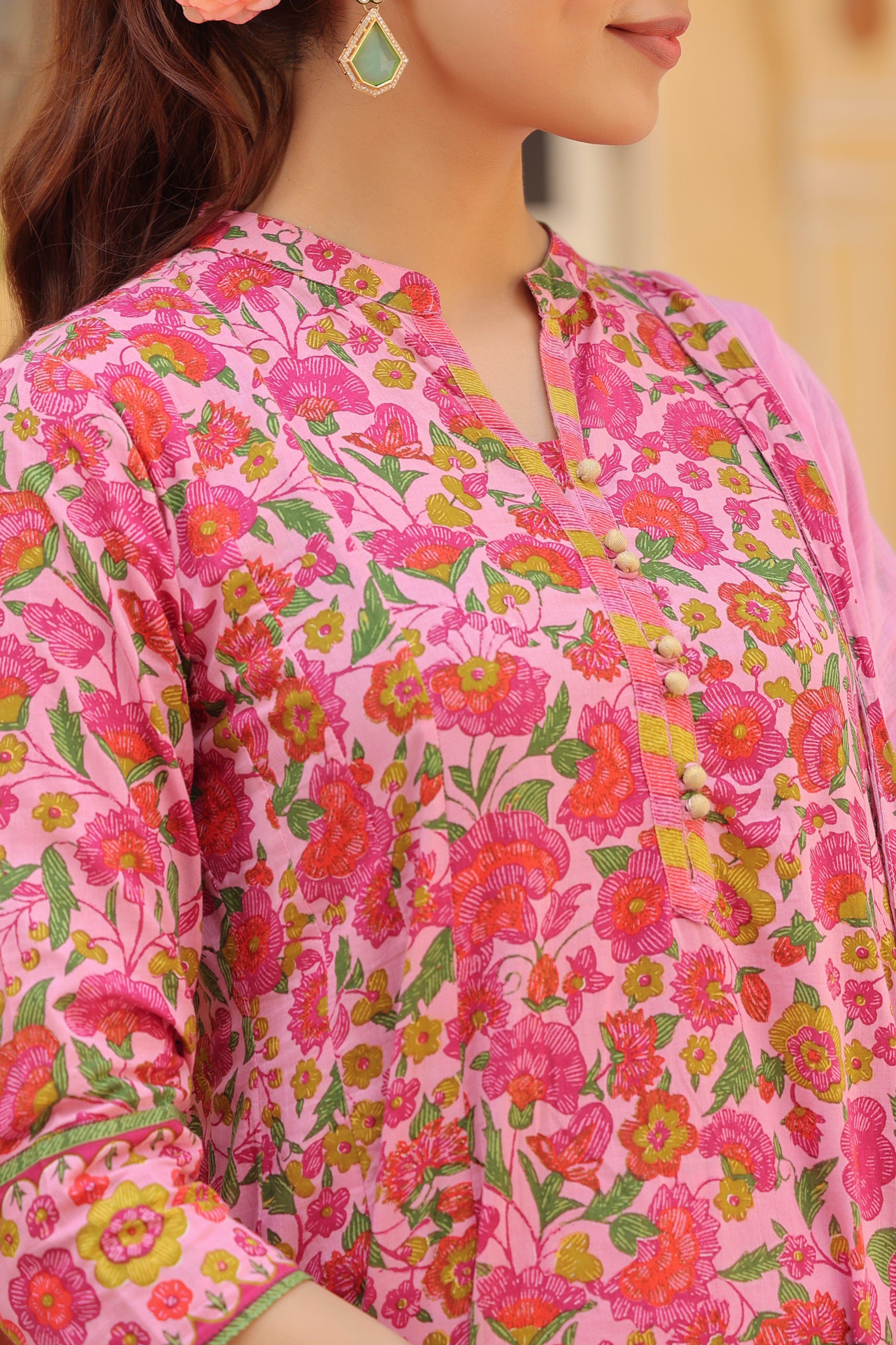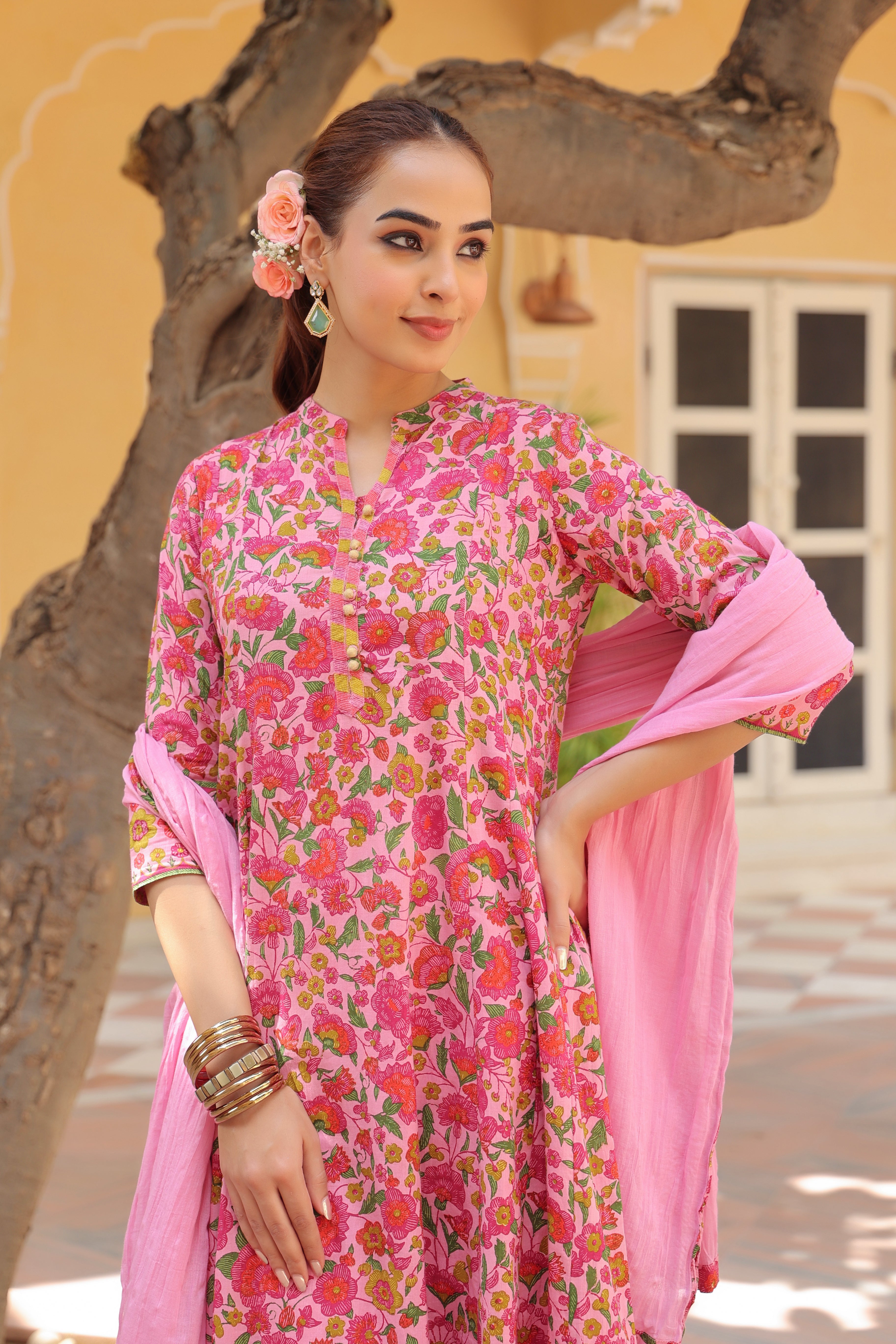 +Pink floral printed Anarkali kurta set featuring a mandarin collar with shimmer button detailing, three-quarter sleeves, and a fit-and-flare silhouette with border detailing at the hem. Paired with solid pink mid-rise trousers with a half-elasticated waistband and slip-on closure, and a dyed cotton dupatta with border edging.
