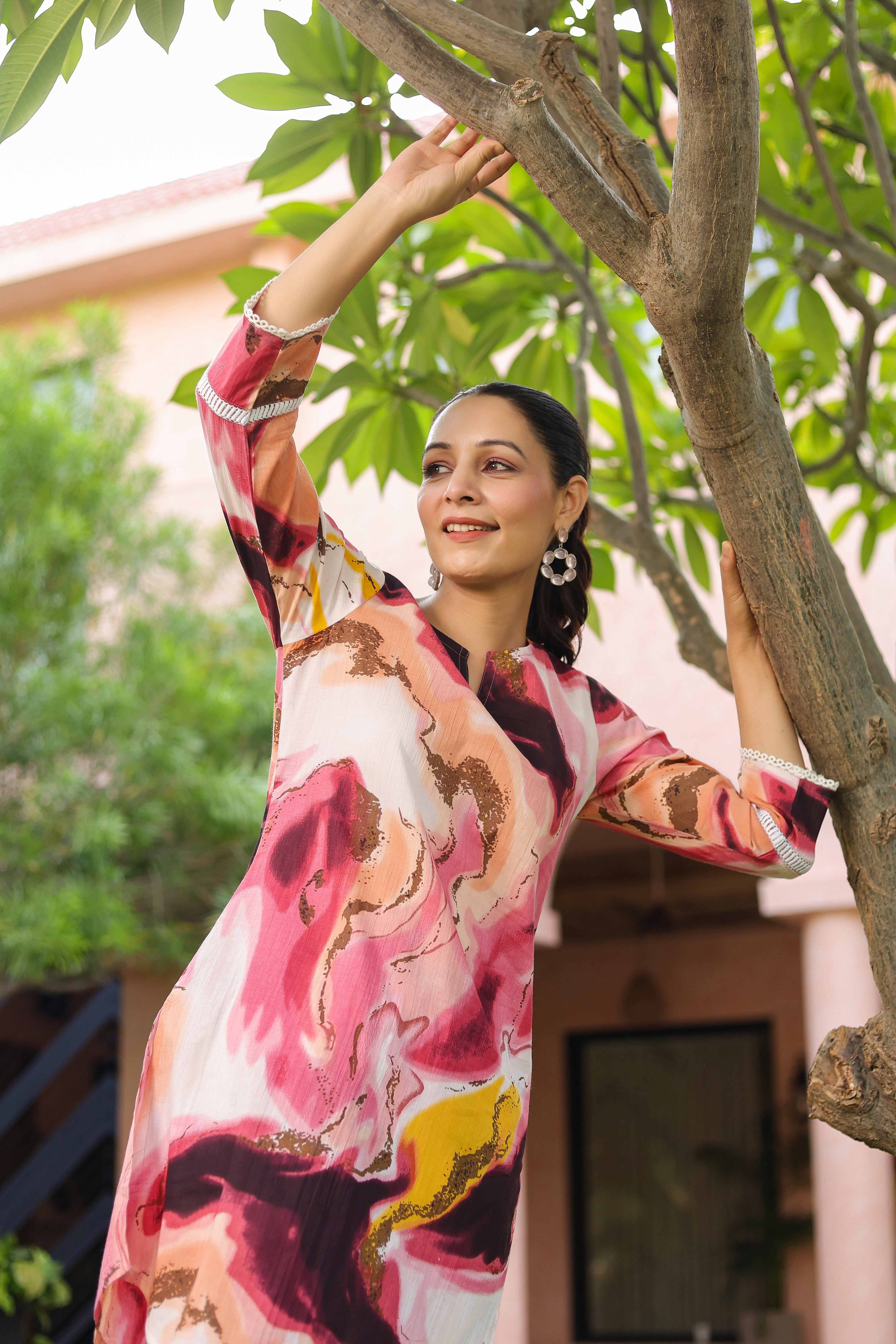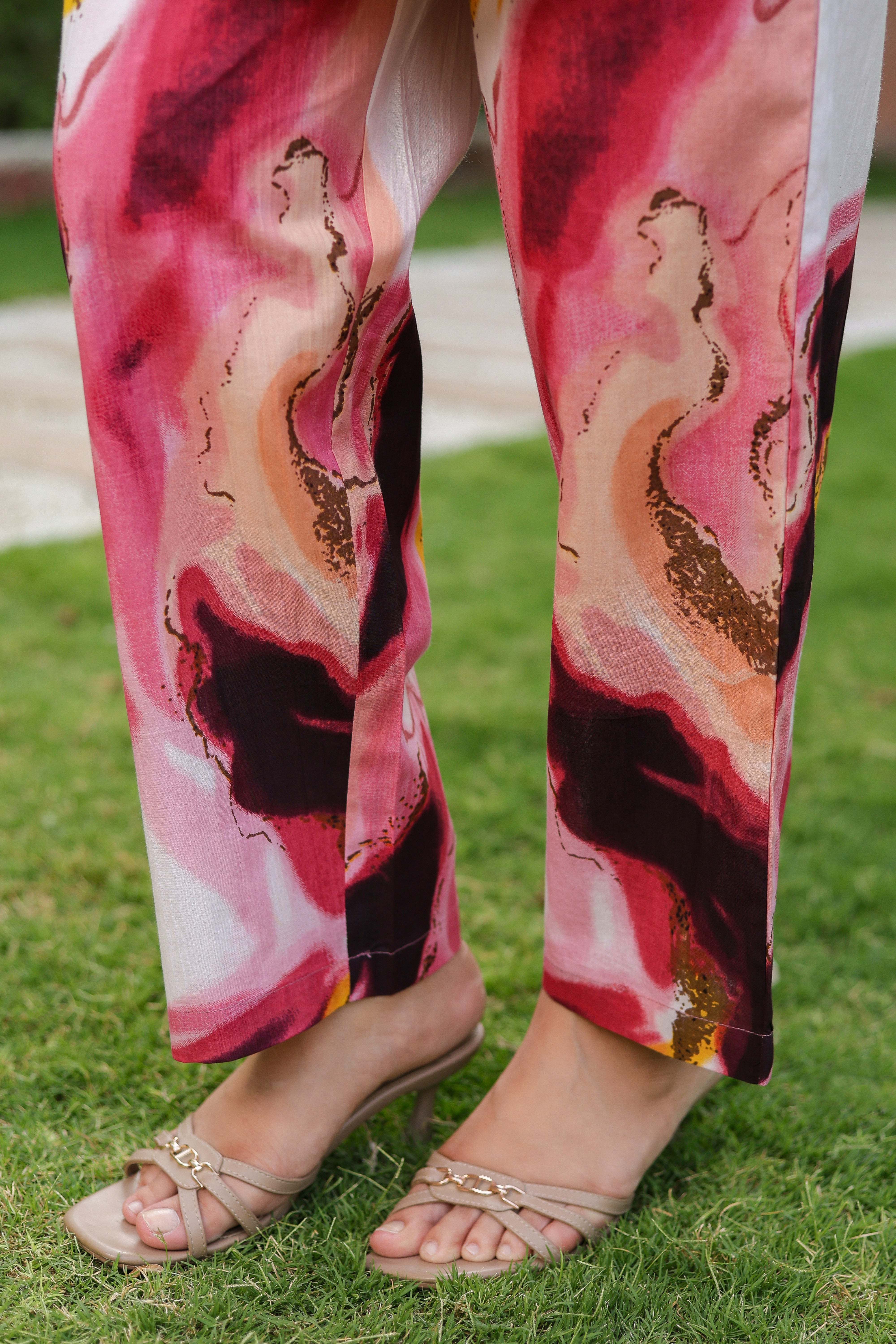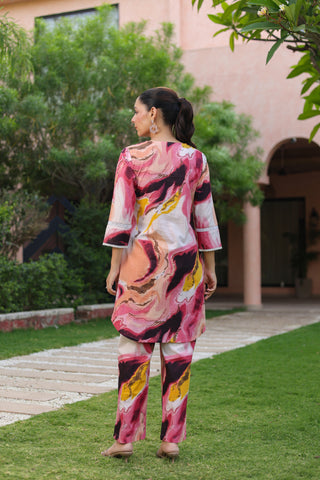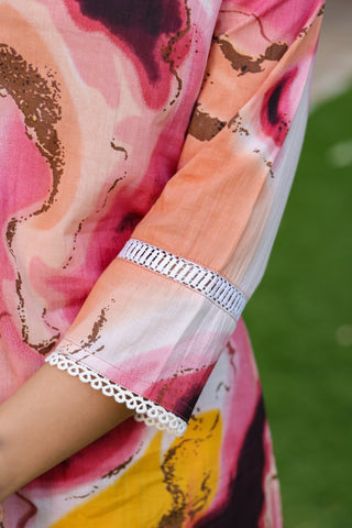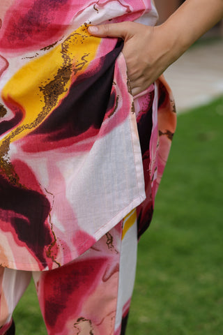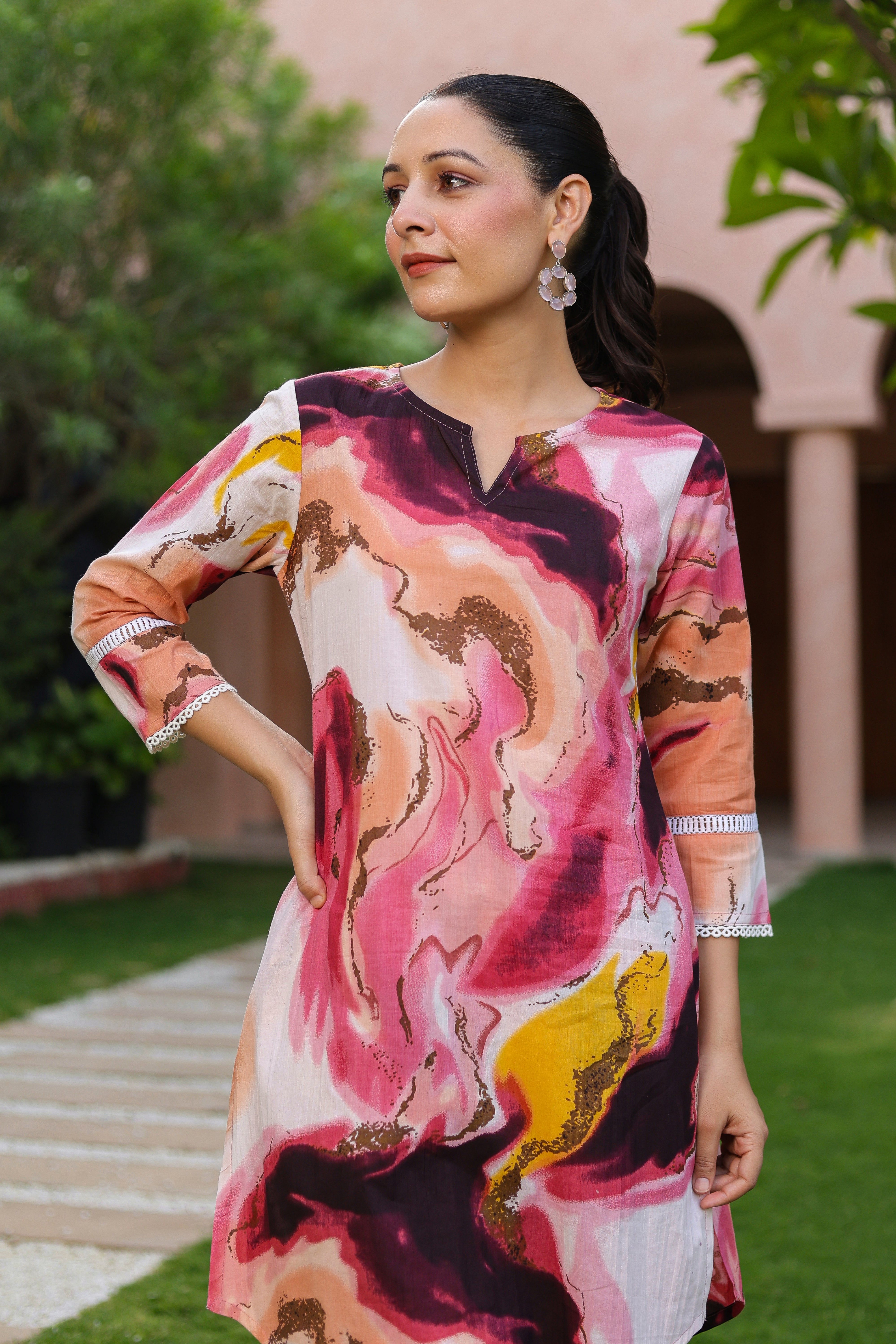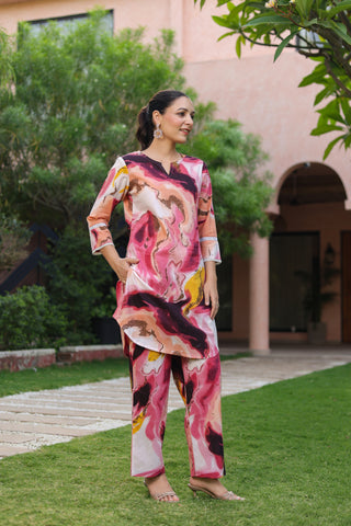 +This cord consists of pink and white marble print tunic with matching trousers, round neck relaxed fit tunic, three-quarter sleeves with lace detail, printed mid rise trouser with slip on closure and pockets.