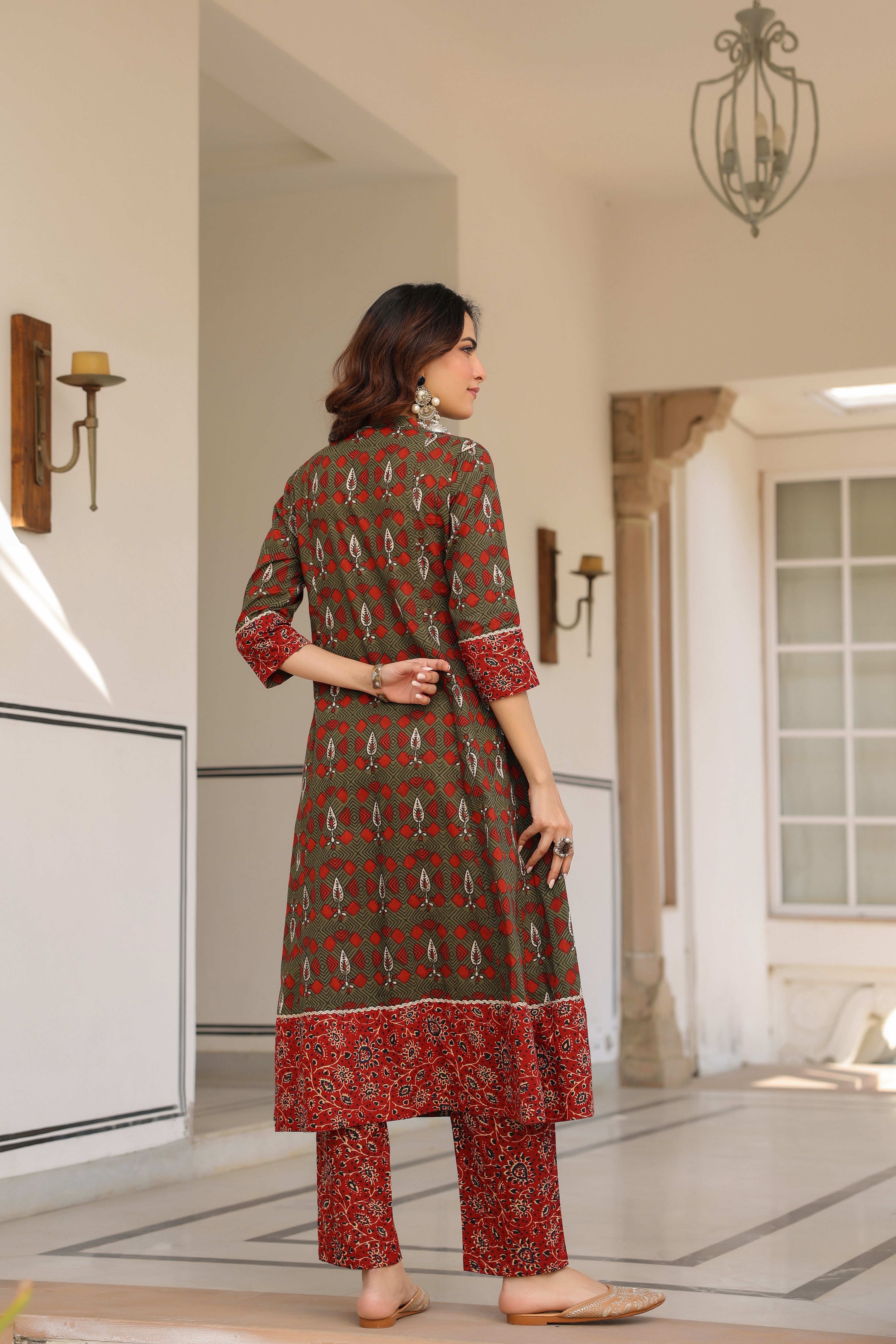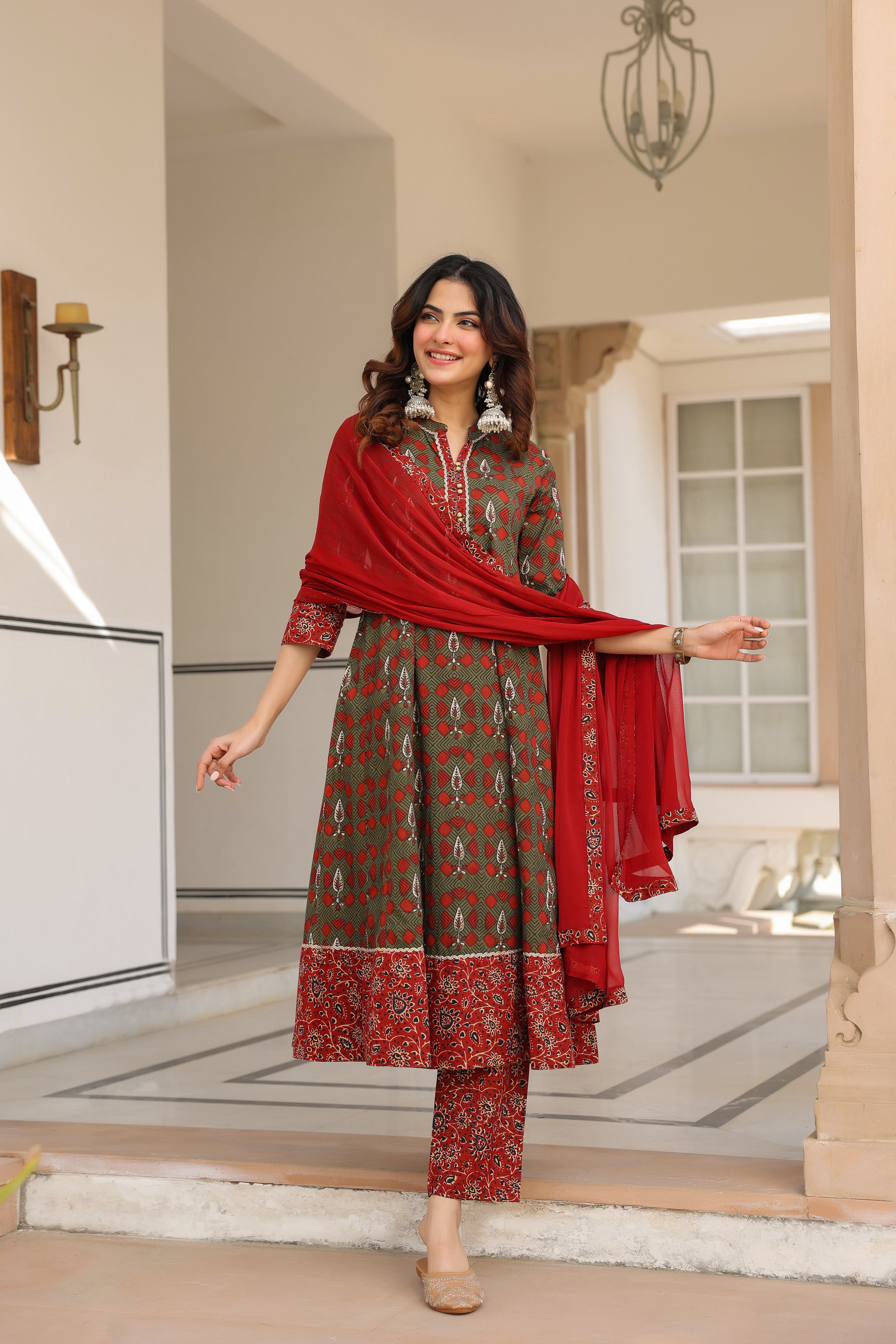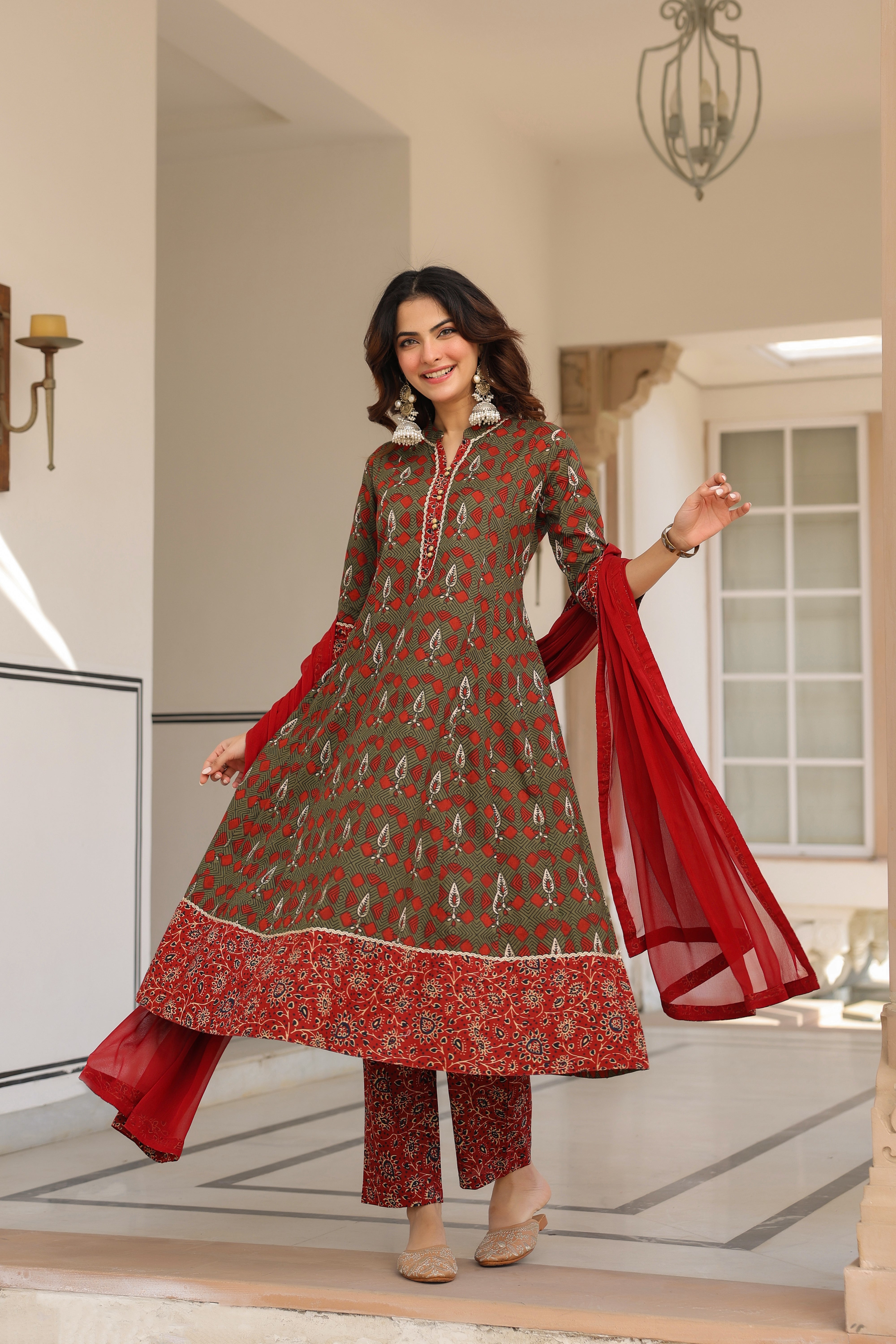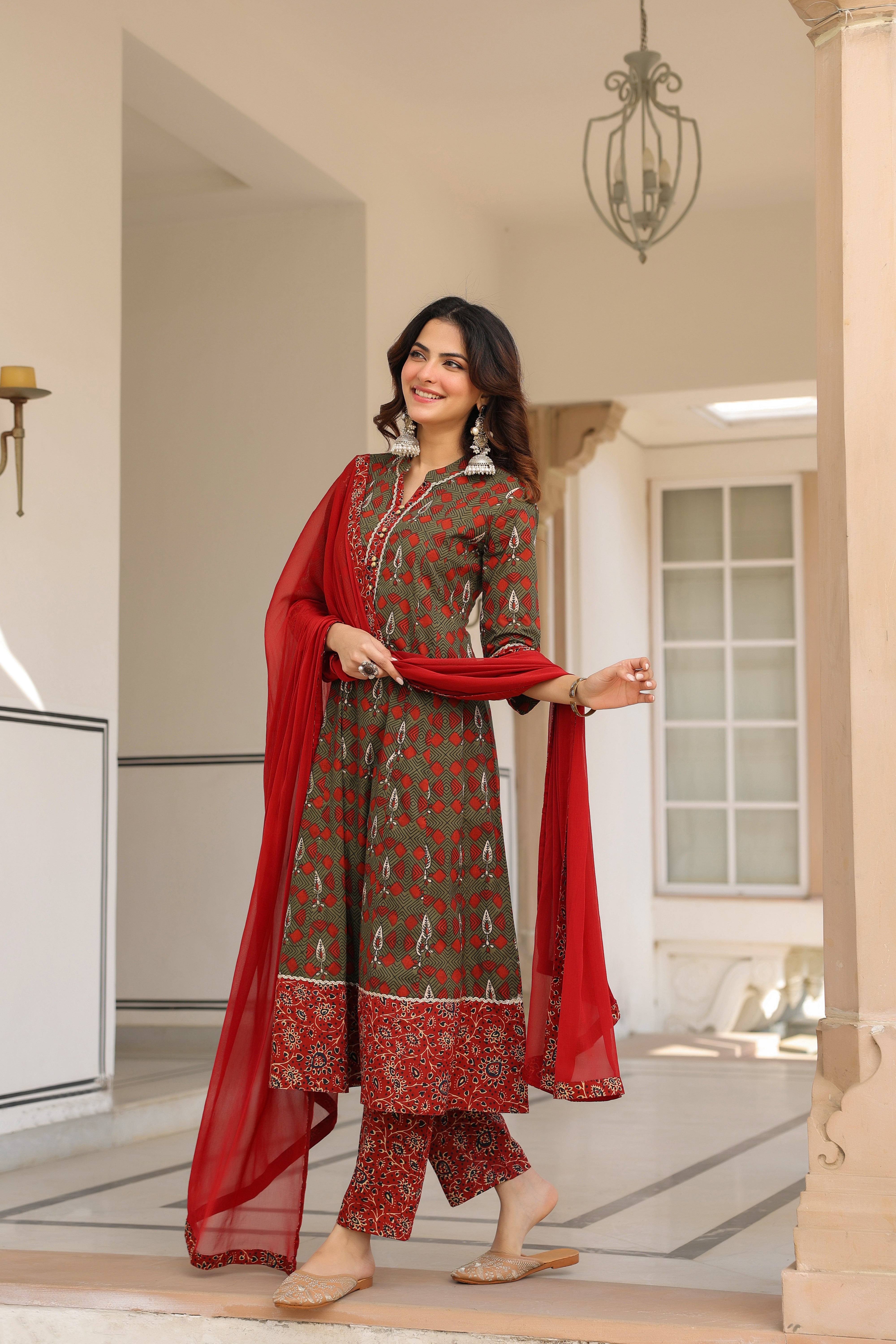 +Refresh your ethnic wardrobe with this green and maroon ethnic motifs printed kurta set. The fit-and-flare Anarkali kurta features a mandarin collar with delicate lace detailing and three-quarter sleeves for a graceful look.