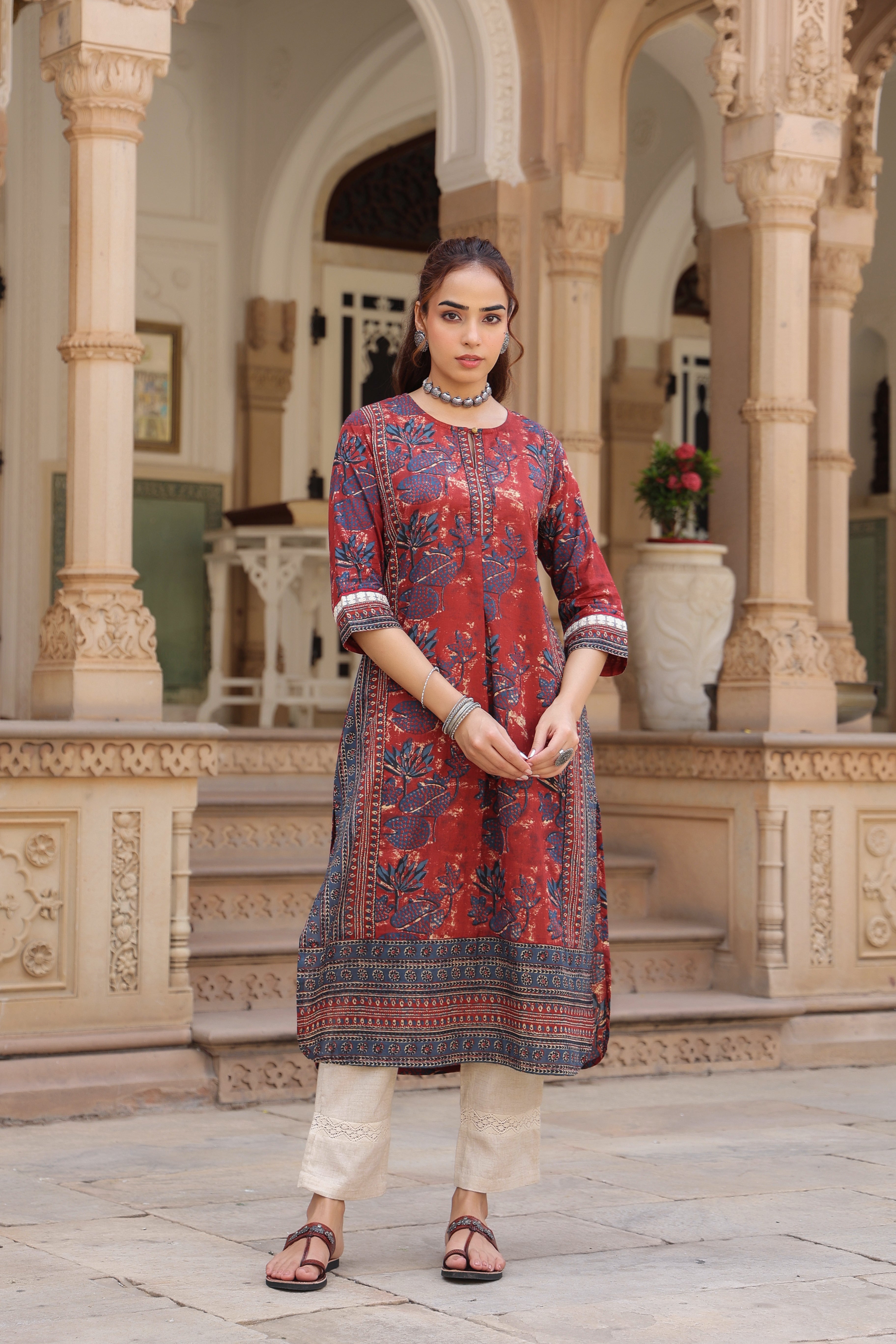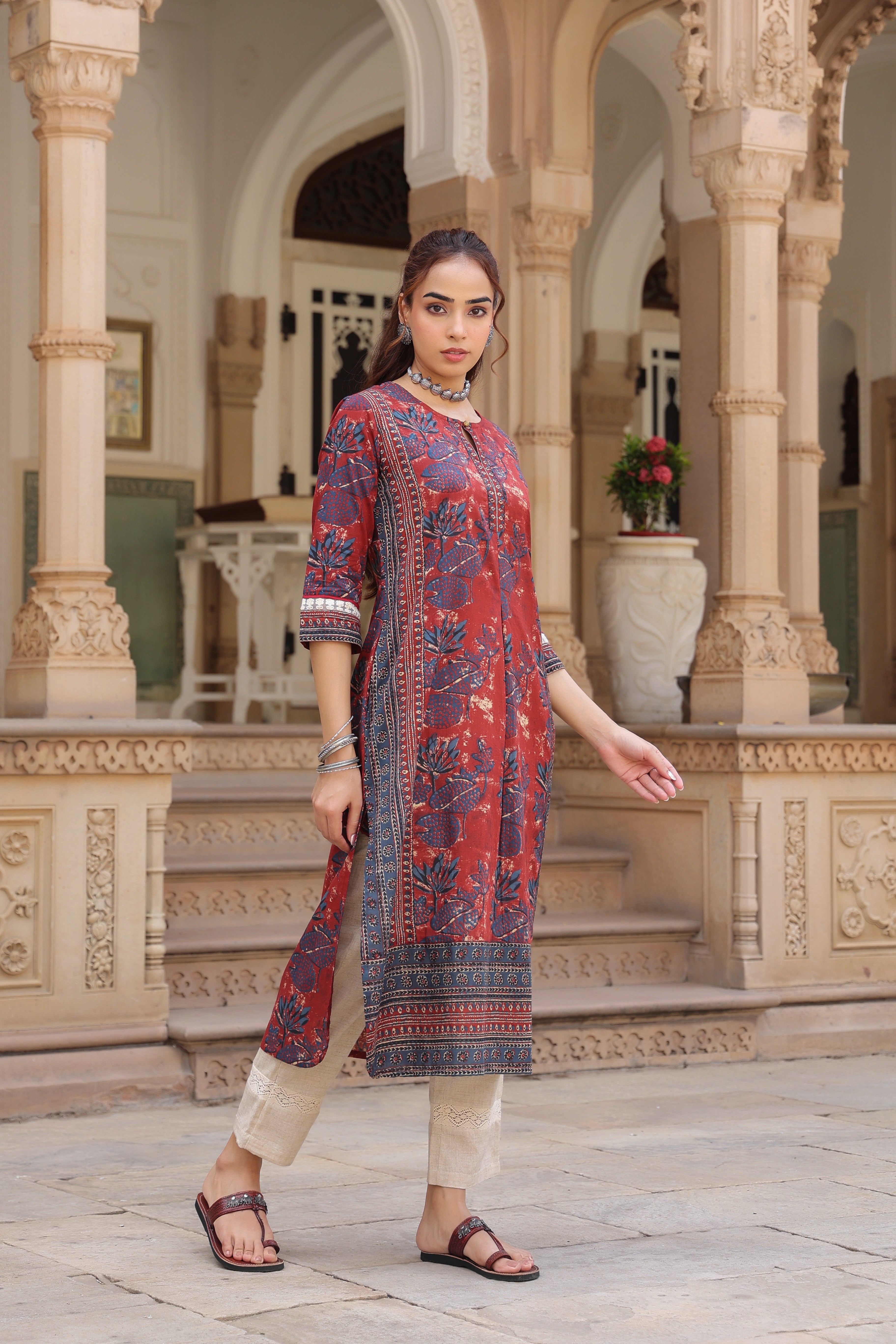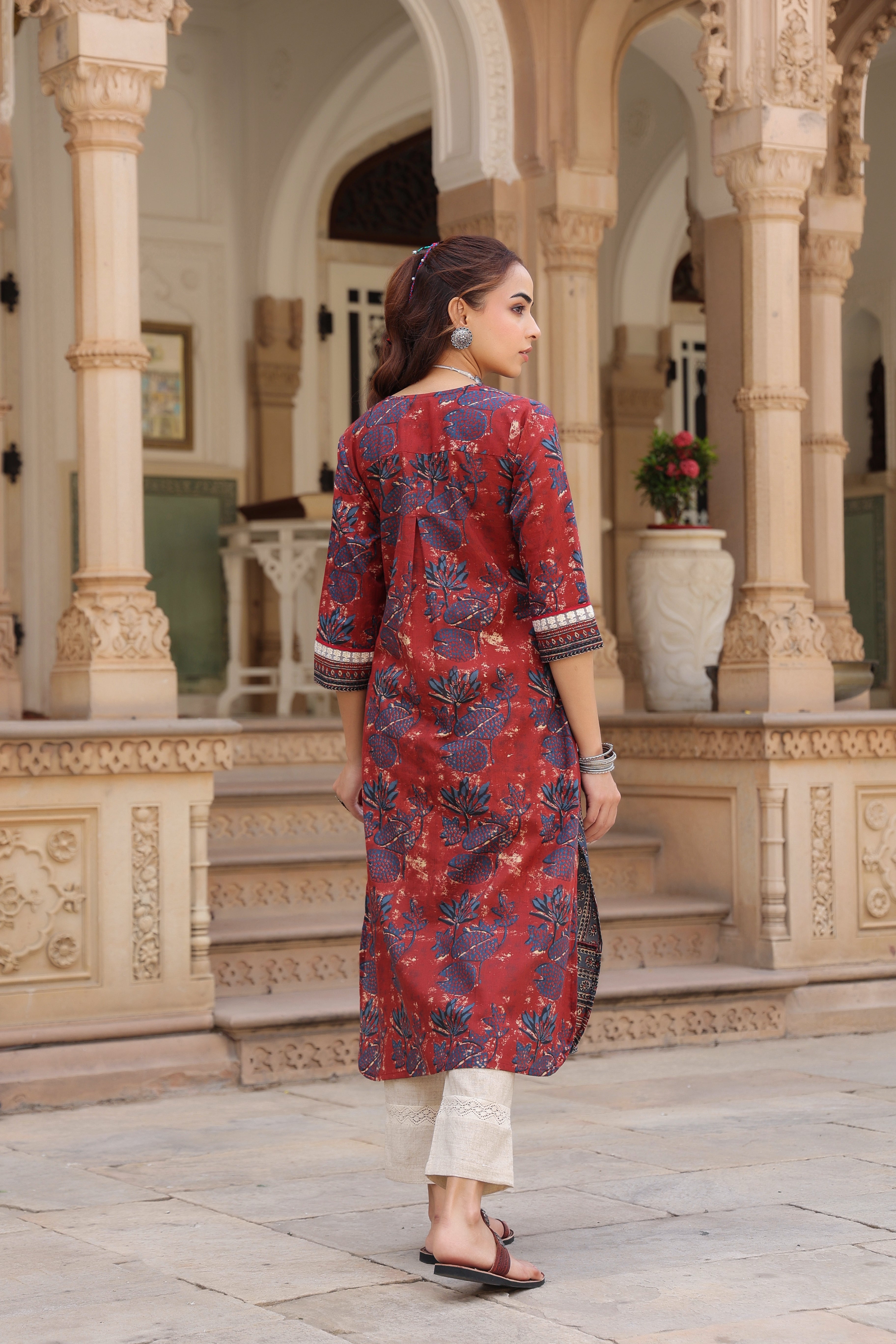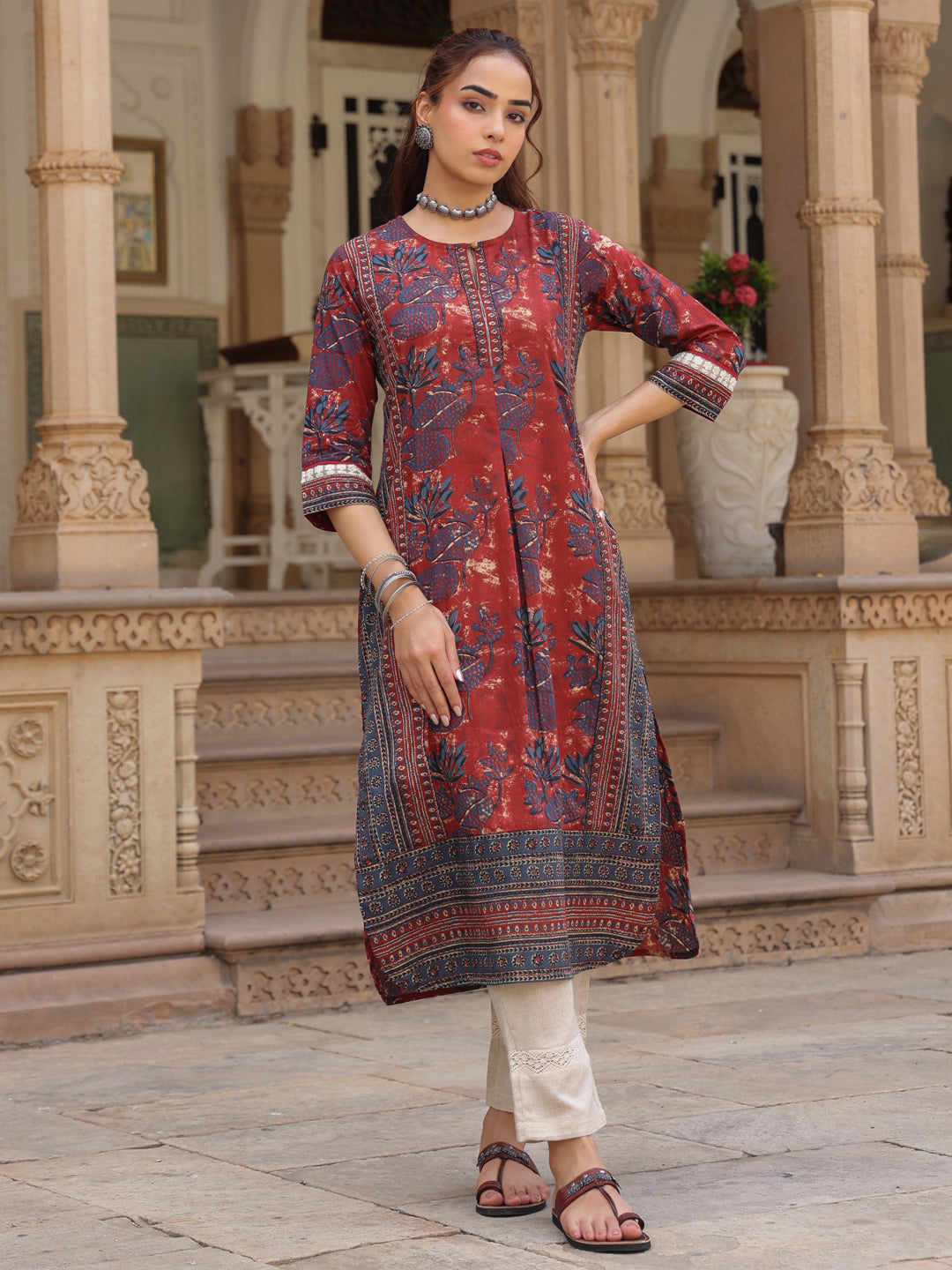 +A maroon ethnic motifs printed kurta designed in a flattering A-line silhouette. It features a round neckline with a button closure, three-quarter sleeves highlighted with delicate lace detailing, and box pleats that add structure and flow. Functional pocket detailing enhances everyday comfort, making it a perfect choice for casual outings or relaxed ethnic wear.