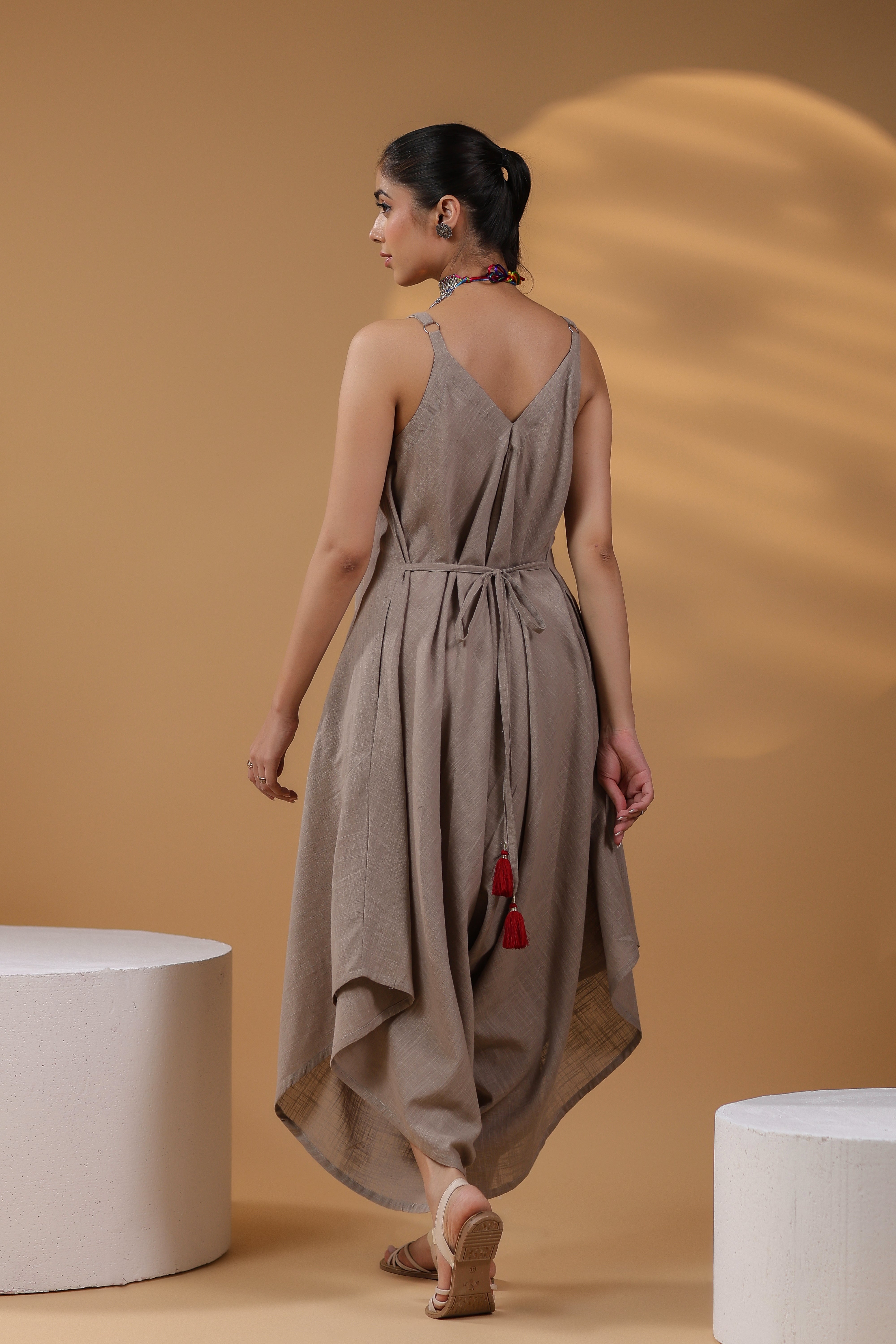 This is a grey solid basic jumpsuit with shoulder straps, V-neck sleeveless jumpsuit with 2 pockets.